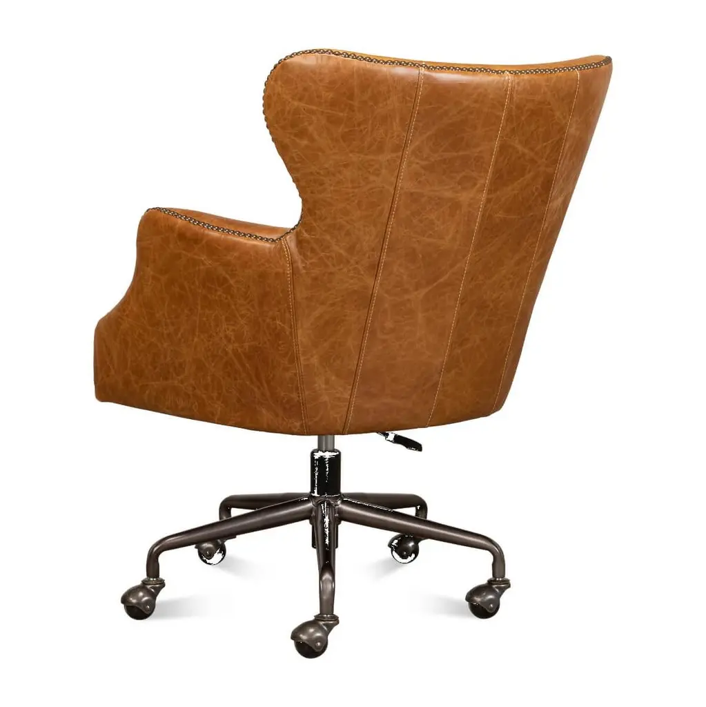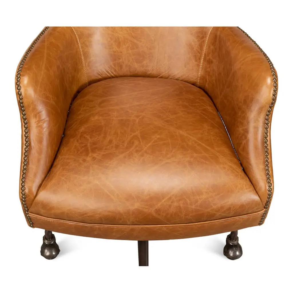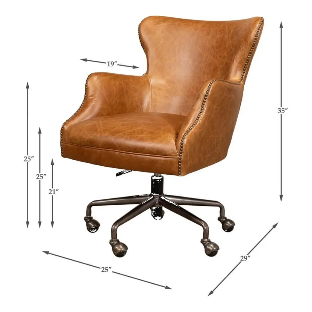 A modern tan saddle leather desk chair with brass nailhead trim. A truly timeless classic style crafted in rich tan leather. This practical and functional chair will elevate the look and feel of any office while you work in comfort. Made of top-grain leather in a "vintage" color. Sits on a 5 ball caster swivel base. This chair has a lever to adjust the back and height. Color variation is common and acceptable on vintage leather. Dimensions: 25" W x 29" D x 35" HSeat: 19" H x 19" DArm: 25" H.