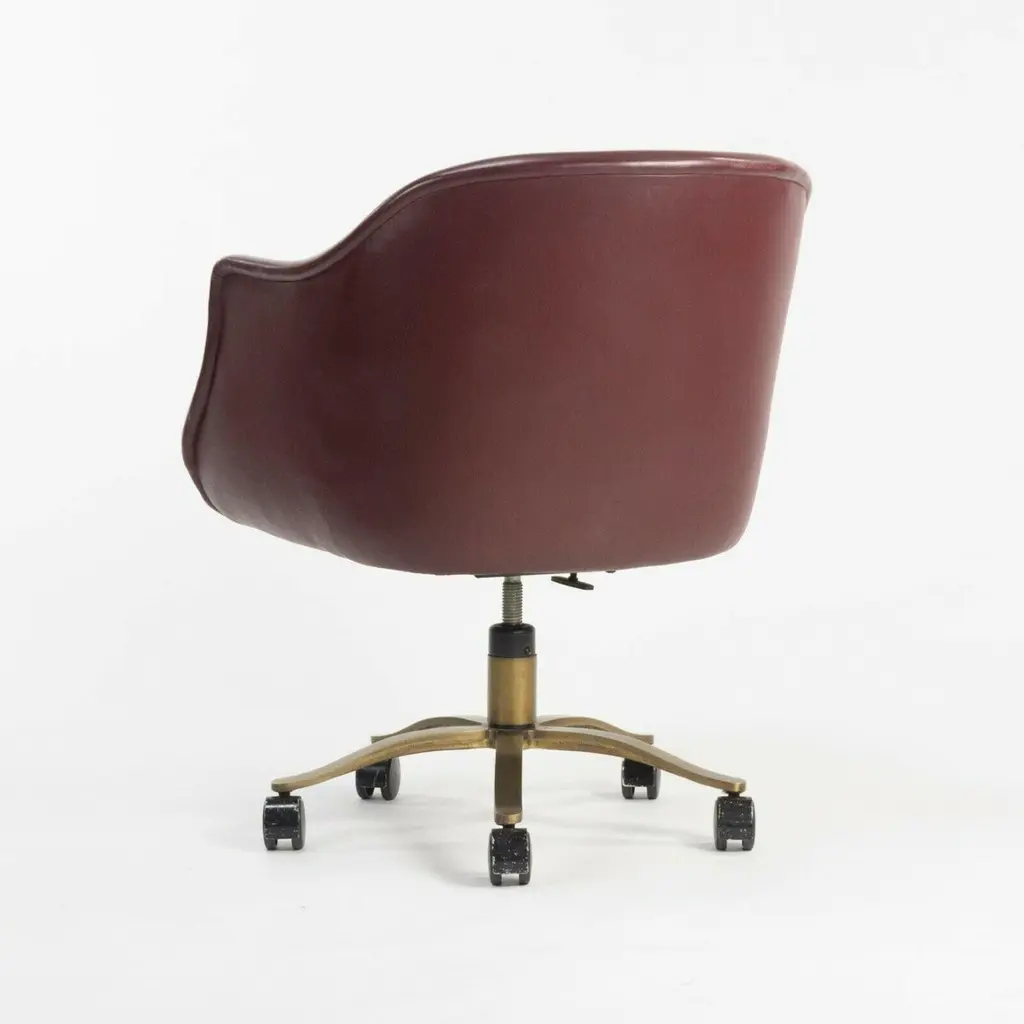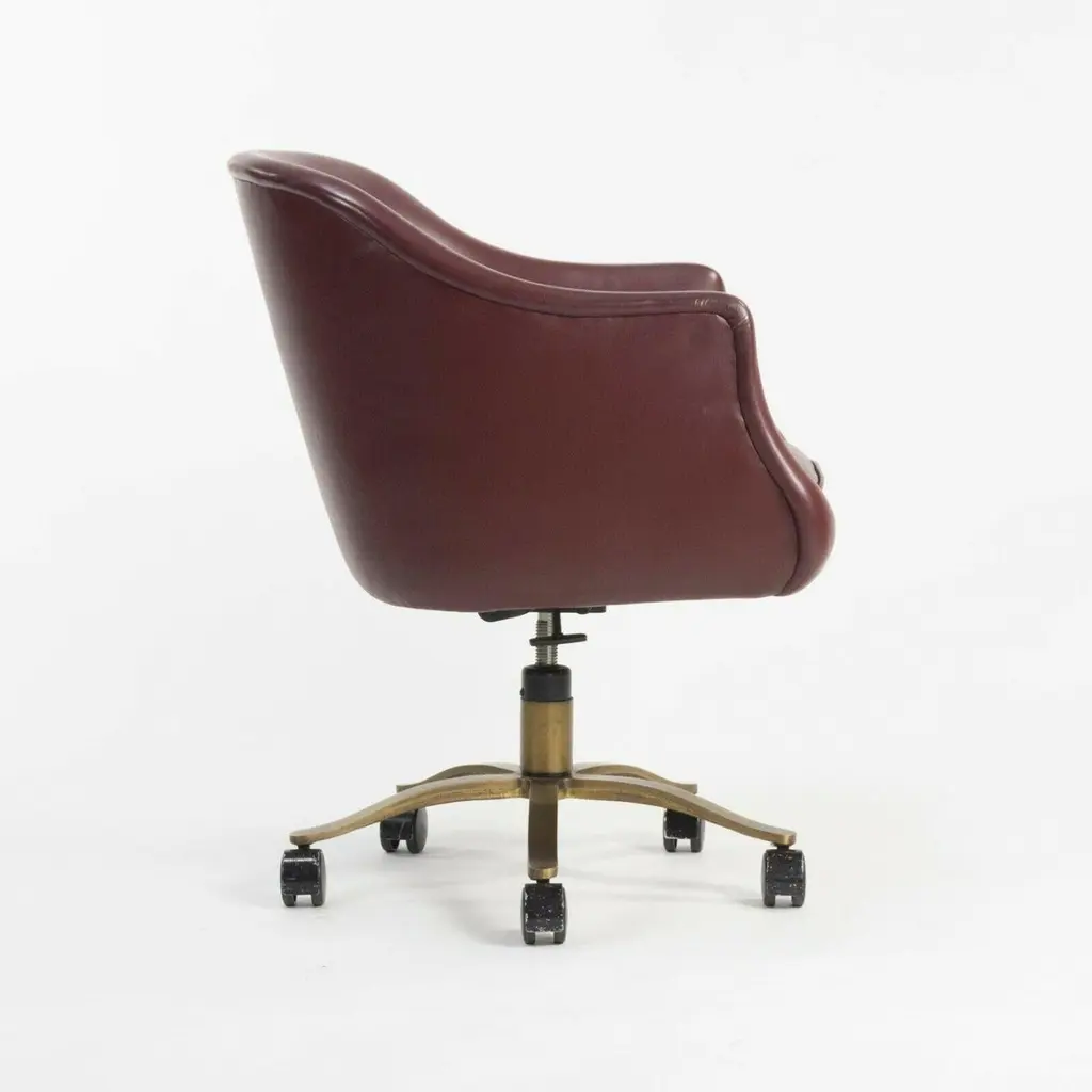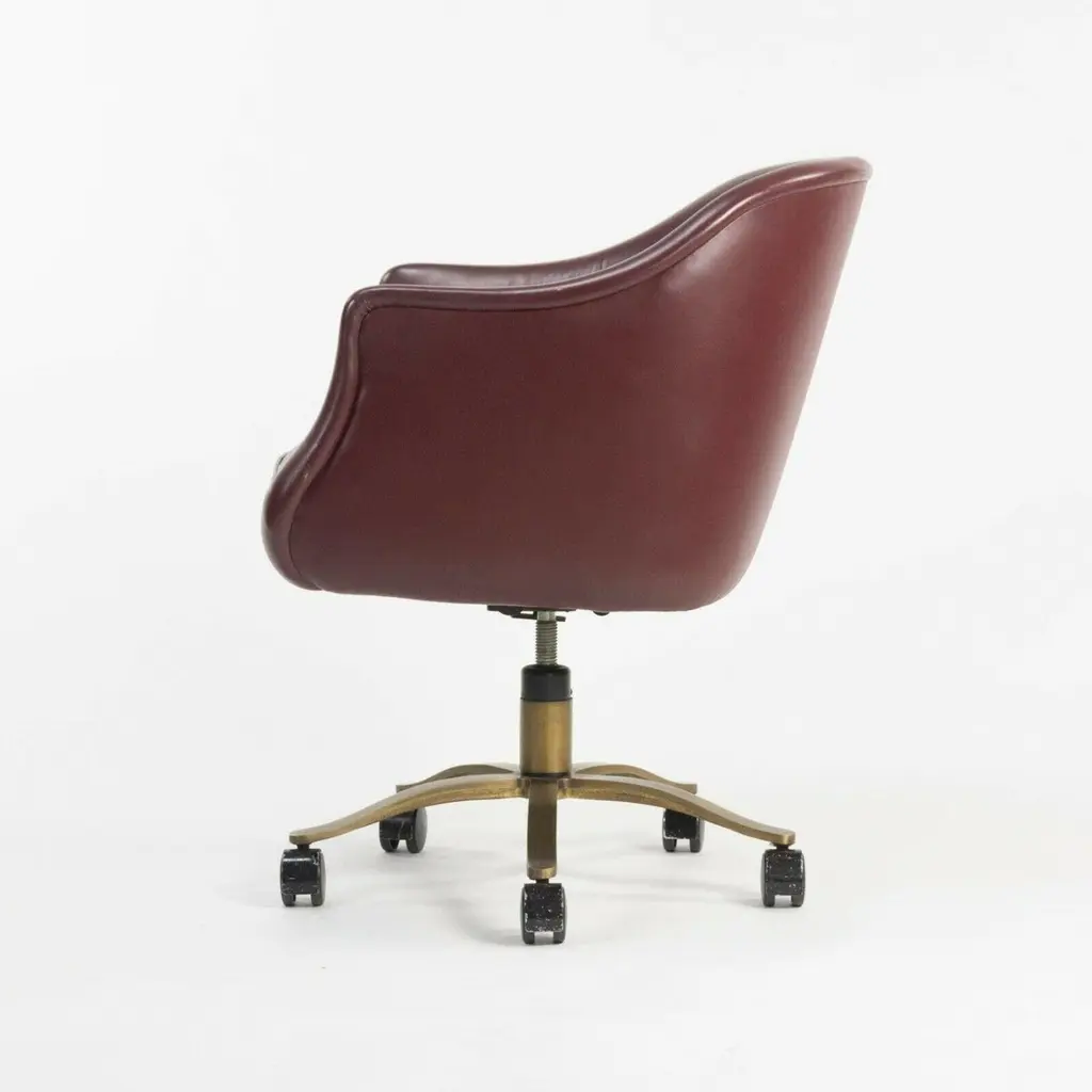 Listed for sale is a gorgeous set of six Nicos Zographos Alpha Bucket rolling desk chairs chairs, produced circa 1990. These examples were specified in a cordovan-color leather with cast (and I believe solid) bronze bases. These chairs were unbelievably expensive to order when new due to the high cost to manufacture the chairs and upholster them. The chairs are in very nice vintage condition, showing some light wear to the leather from use. There are some light scuffs from use as is expected for chairs of this vintage. We will do our best to touch them up prior to shipping. For reference, Nicos Zographos, the renowned industrial designer became a household name at Skidmore, Owings, and Merrill (SOM) architects during the late 1950's and continued to have a relationship with the architectural firm for many decades. He split off to form Zographos Designs Limited. Zographos pieces are known for their uncompromising craftsmanship and quality of materials.The price listed is for each chair. Six chairs are available. They measure 26.5 inches wide by 26.5 inches deep and 32 inches tall. The chairs tilt, swivel, and are also height adjustable.