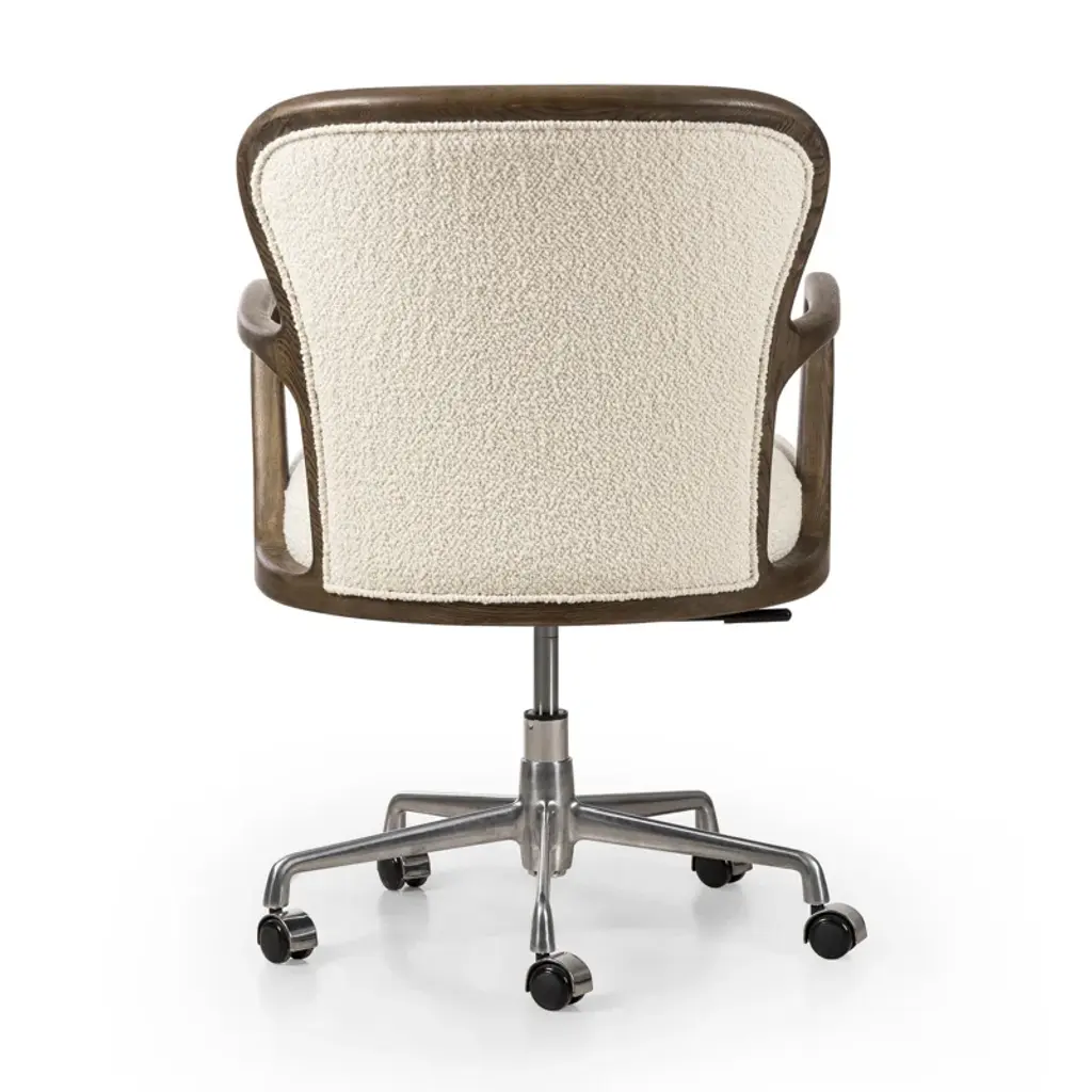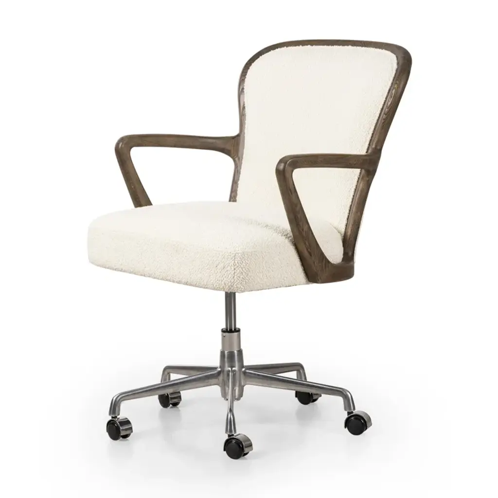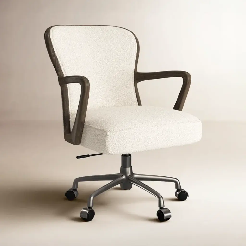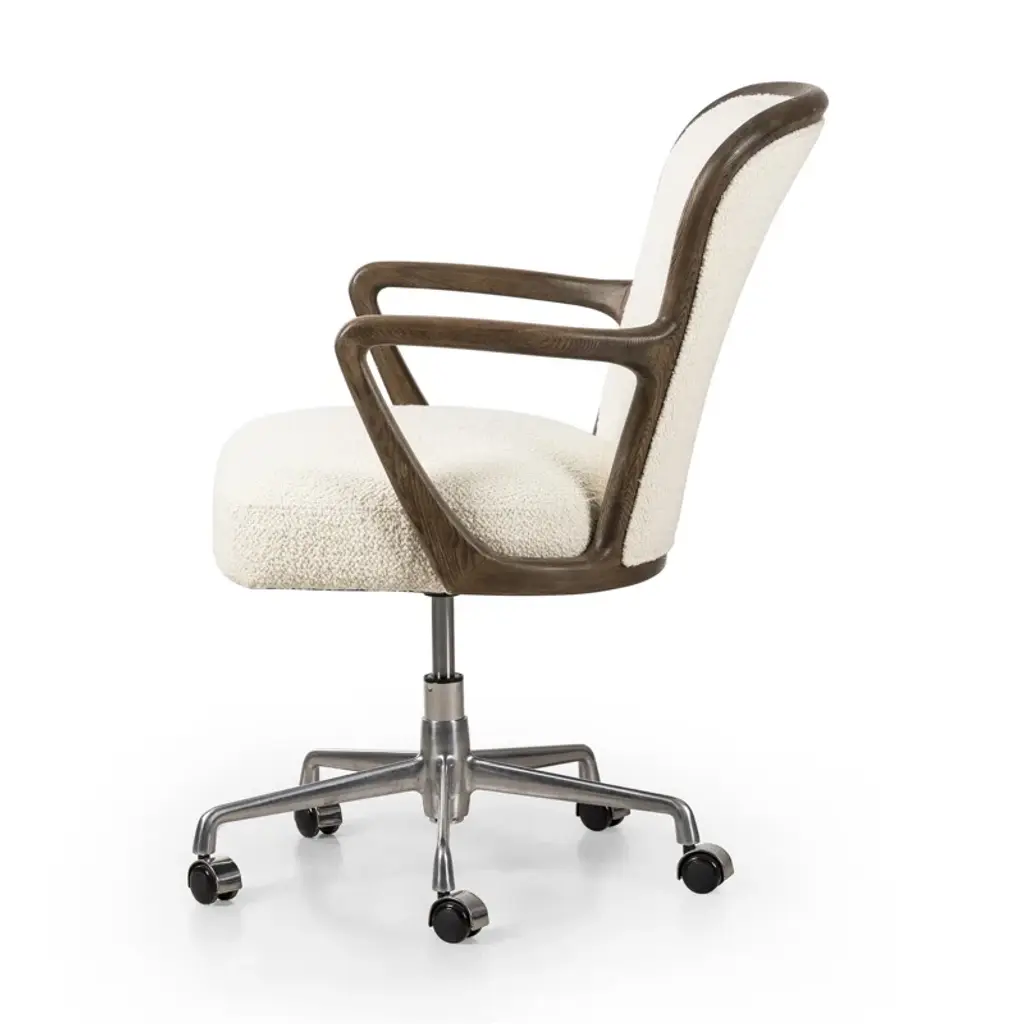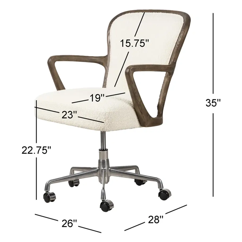 Heritage inspiration meets modern comfort in a desk chair - soft curves of a gray-finished wood frame and a seat of textural cream fabric. Height adjustable with a 360-degree swivel base and smooth-rolling casters ensure ease in the workplace.