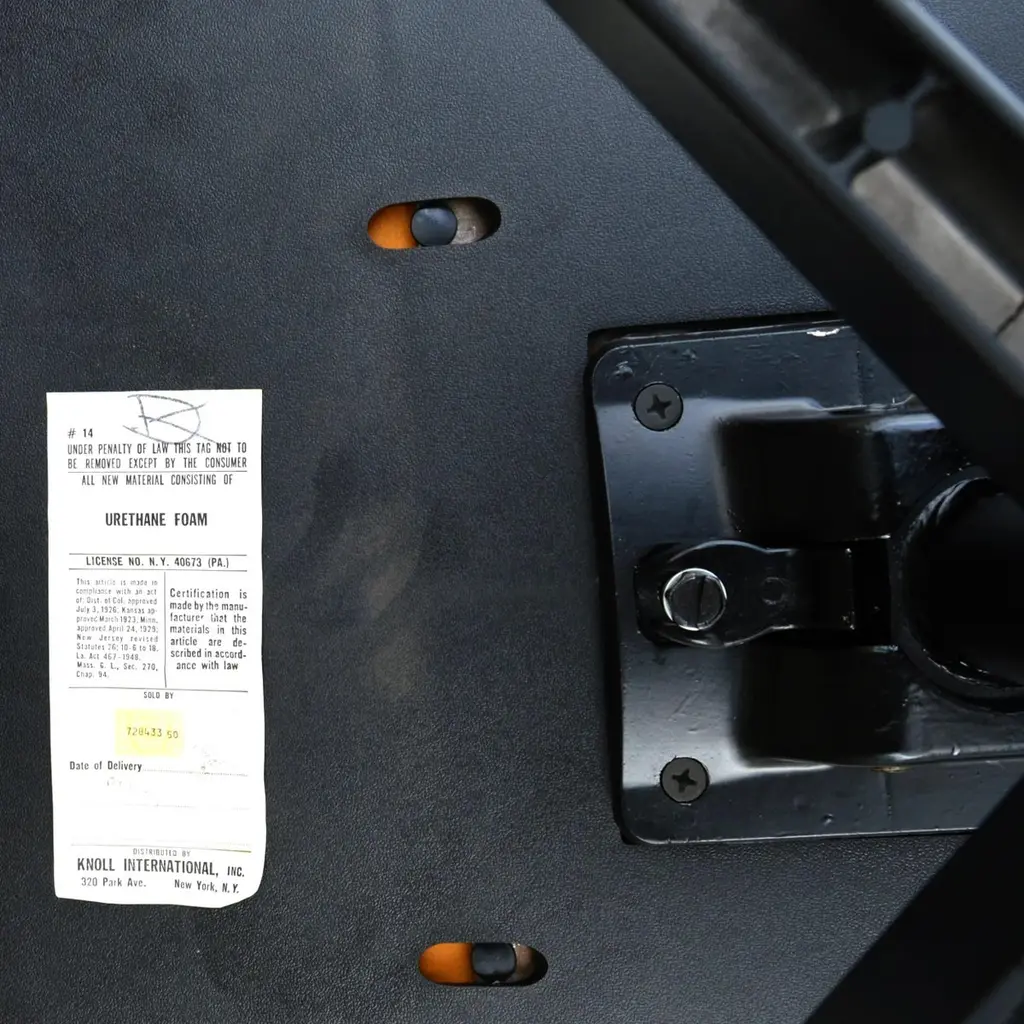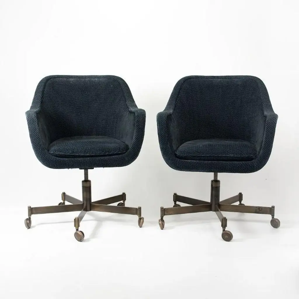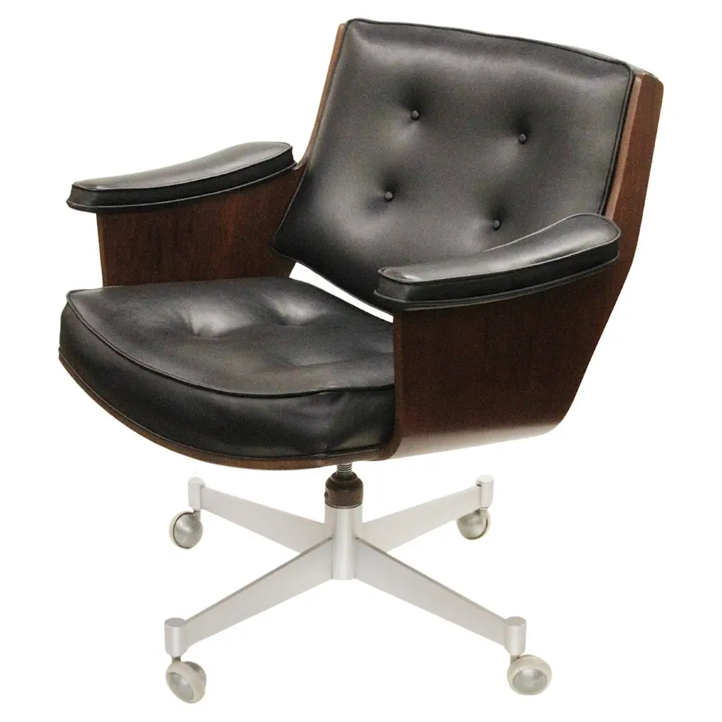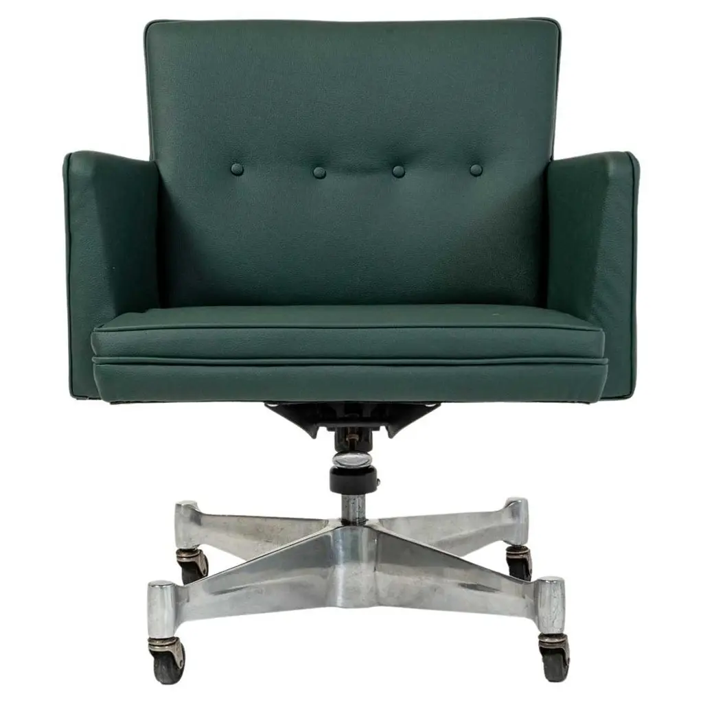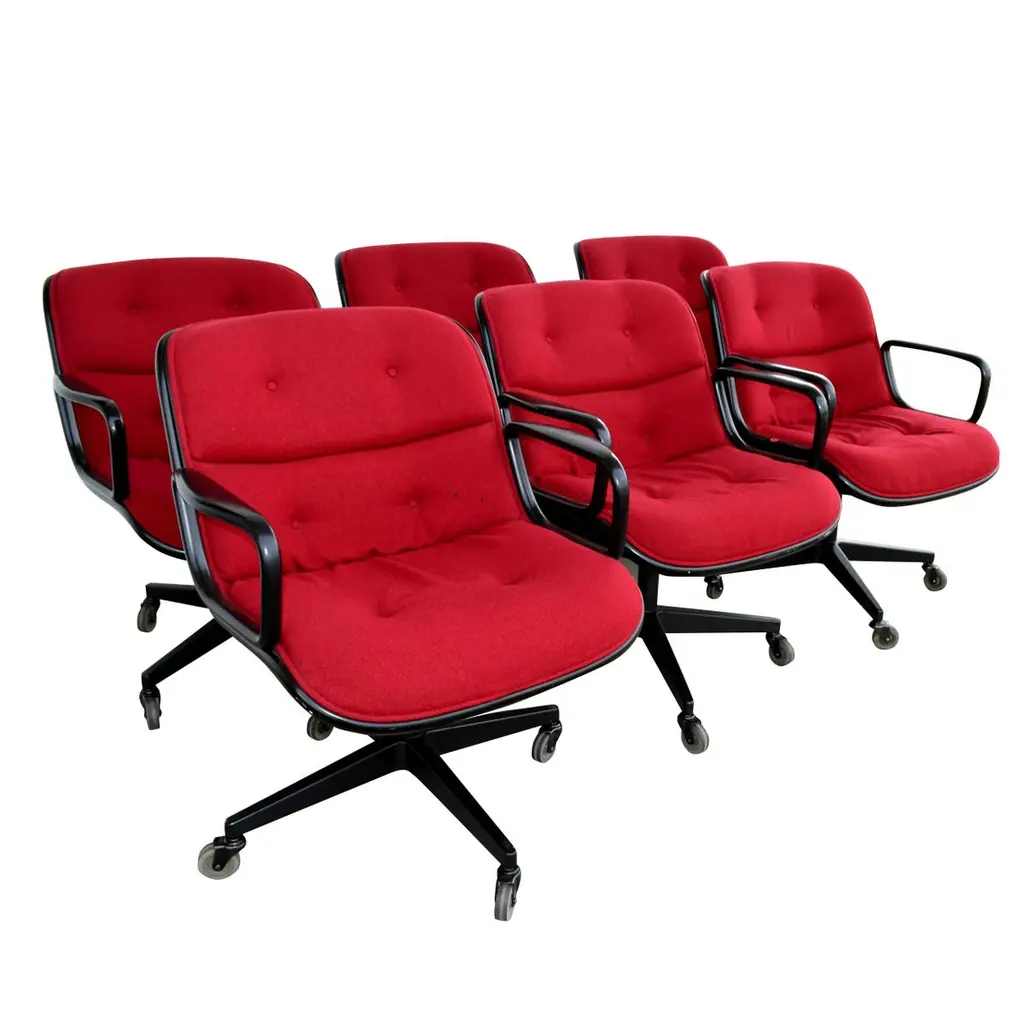 First designed in 1963, Charles Pollock’s timeless design continues to be produced by Knoll in a variety of finishes. The Pollock executive chair features what the designer described as “rim technology”—the use of a single aluminum band around the chair’s perimeter to hold the design together, structurally and visually. Fifty years after its introduction, the Pollock Chair continues to exude timeless elegance in any home or office. One red Pollock chair with anodized base. Six available. Tilt, swivel and height adjustable.
