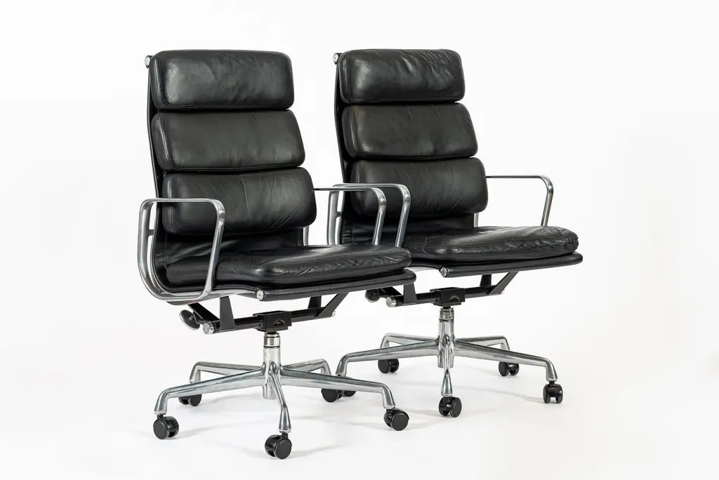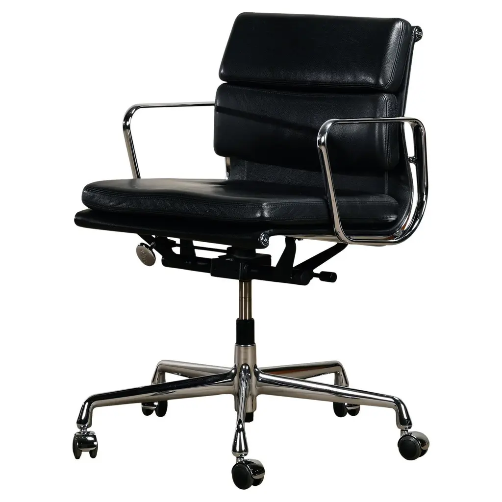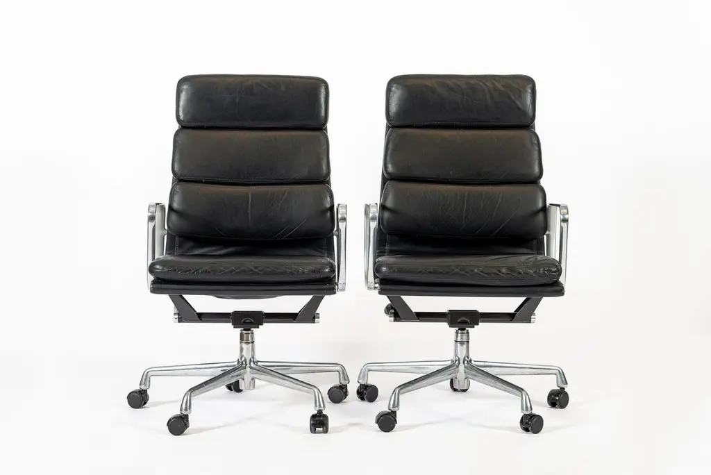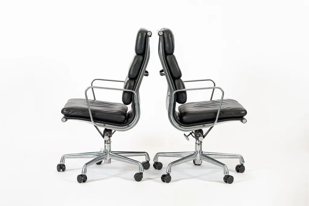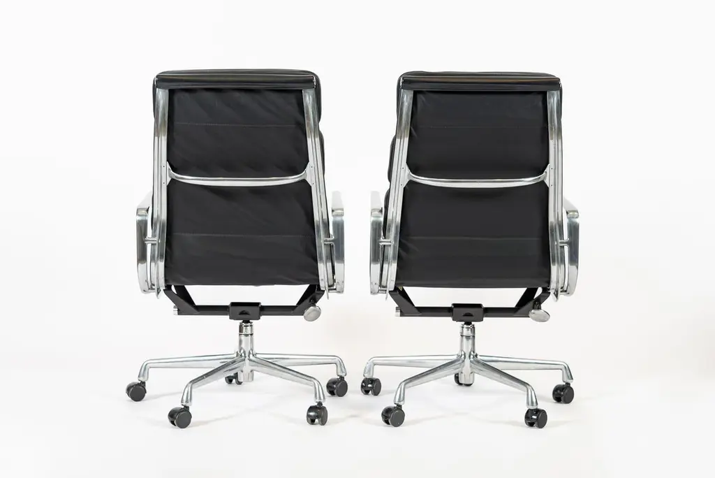 These authentic Eames for Herman Miller Soft Pad Executive Height office chairs from the Aluminum Group Collection were manufactured in 2001. These executive height chairs feature a taller backrest, original black leather upholstery, polished aluminum five-star swivel base, armrests and black rolling casters. The comfortable, contoured ergonomic design features thick, plush cushions and a 360 degree smooth swivel seat with manual lift adjustable height and backrest tilt. This classic mid century modern office chair was first introduced in 1969 by Charles and Ray Eames as the luxury model of the 1958 Aluminum Group line. Original Herman Miller label on underside. An iconic and collectible desk chair perfect for home or office.CONDITIONExcellent vintage condition with wear consistent with age and use. Leather is soft and supple and perfectly aged with expected wear from normal use.DIMENSIONSW 22.75” x D 23” x H 38.5”Seat Height: 19”NOTE: List price is for 2 chairs. May be purchased individually. We currently have 4 matching chairs available. We also have additional Eames Aluminum Group Soft Pad and Thin Pad chairs available for sale including a variety of colors. Please reach out for further details.Please reach out to us with any questions about this item or for further clarification of shipping options and discounts by clicking on the “Ask the Seller” button.