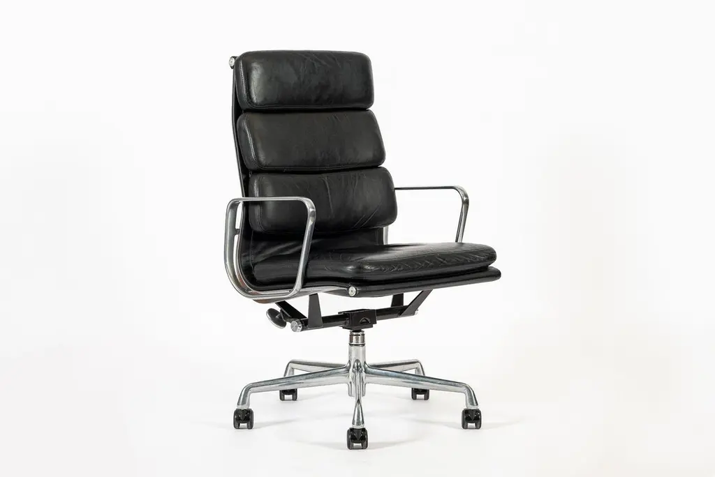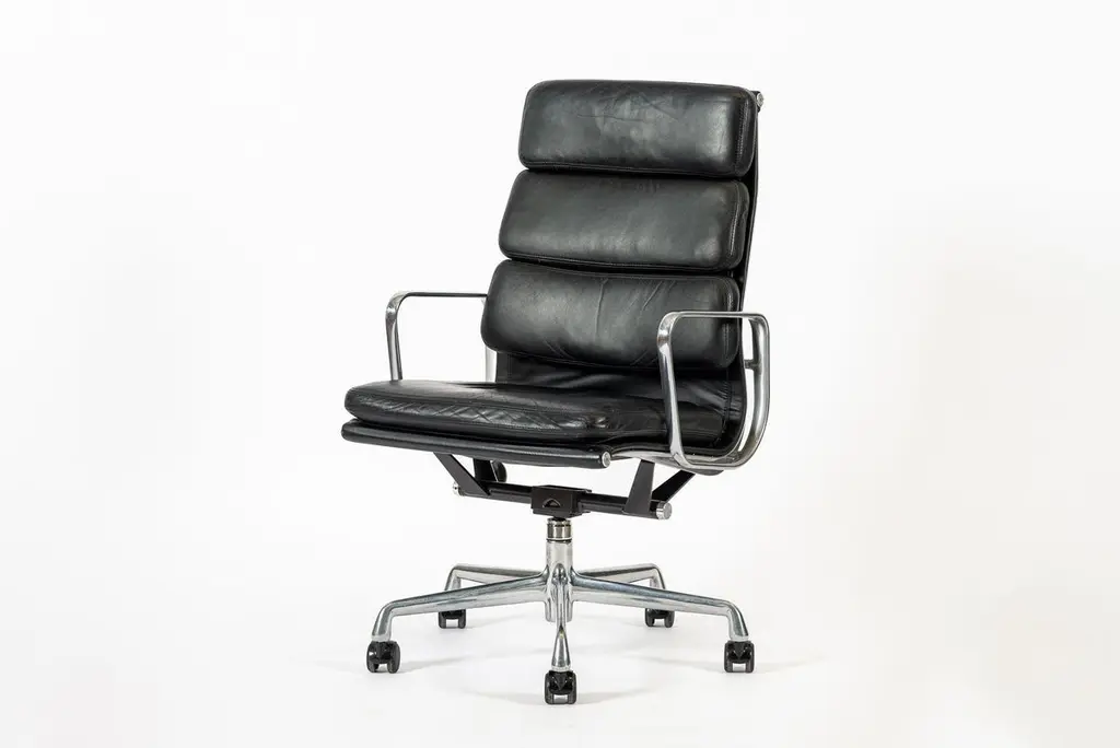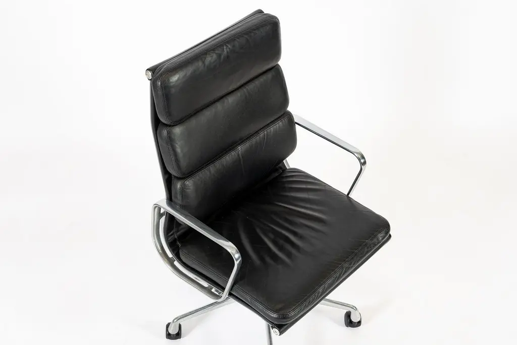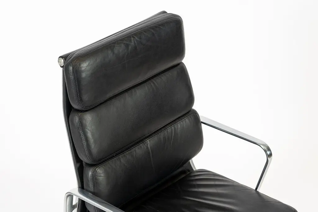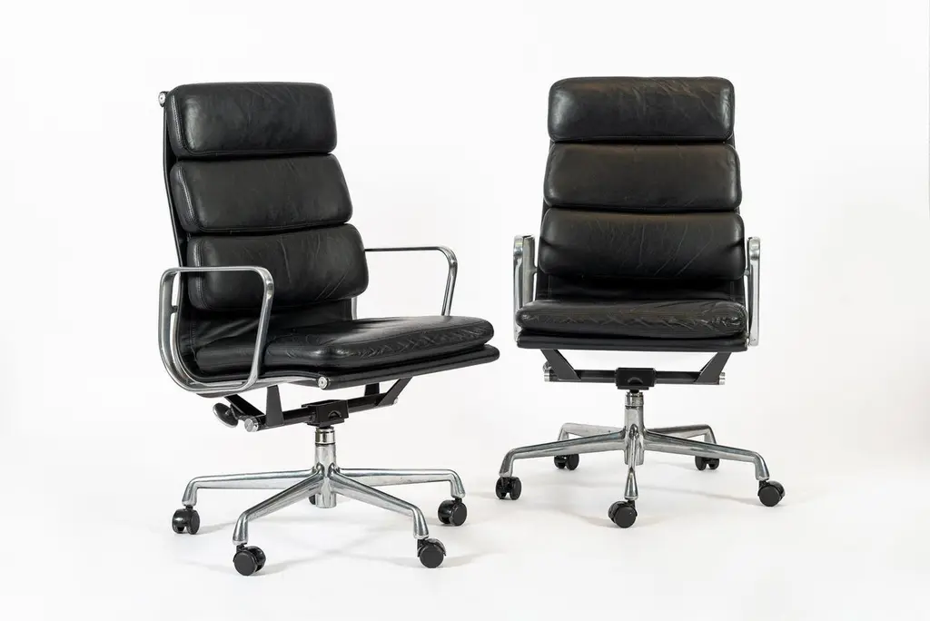 These authentic Eames for Herman Miller Soft Pad Executive Height office chairs from the Aluminum Group Collection were manufactured in 2001. These executive height chairs feature a taller backrest, original black leather upholstery, polished aluminum five-star swivel base, armrests and black rolling casters. The comfortable, contoured ergonomic design features thick, plush cushions and a 360 degree smooth swivel seat with manual lift adjustable height and backrest tilt. This classic mid century modern office chair was first introduced in 1969 by Charles and Ray Eames as the luxury model of the 1958 Aluminum Group line. Original Herman Miller label on underside. An iconic and collectible desk chair perfect for home or office.CONDITIONExcellent vintage condition with wear consistent with age and use. Leather is soft and supple and perfectly aged with expected wear from normal use.DIMENSIONSW 22.75” x D 23” x H 38.5”Seat Height: 19”NOTE: List price is for 2 chairs. May be purchased individually. We currently have 4 matching chairs available. We also have additional Eames Aluminum Group Soft Pad and Thin Pad chairs available for sale including a variety of colors. Please reach out for further details.Please reach out to us with any questions about this item or for further clarification of shipping options and discounts by clicking on the “Ask the Seller” button.