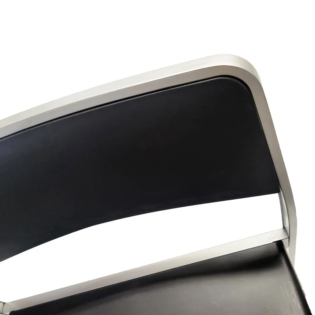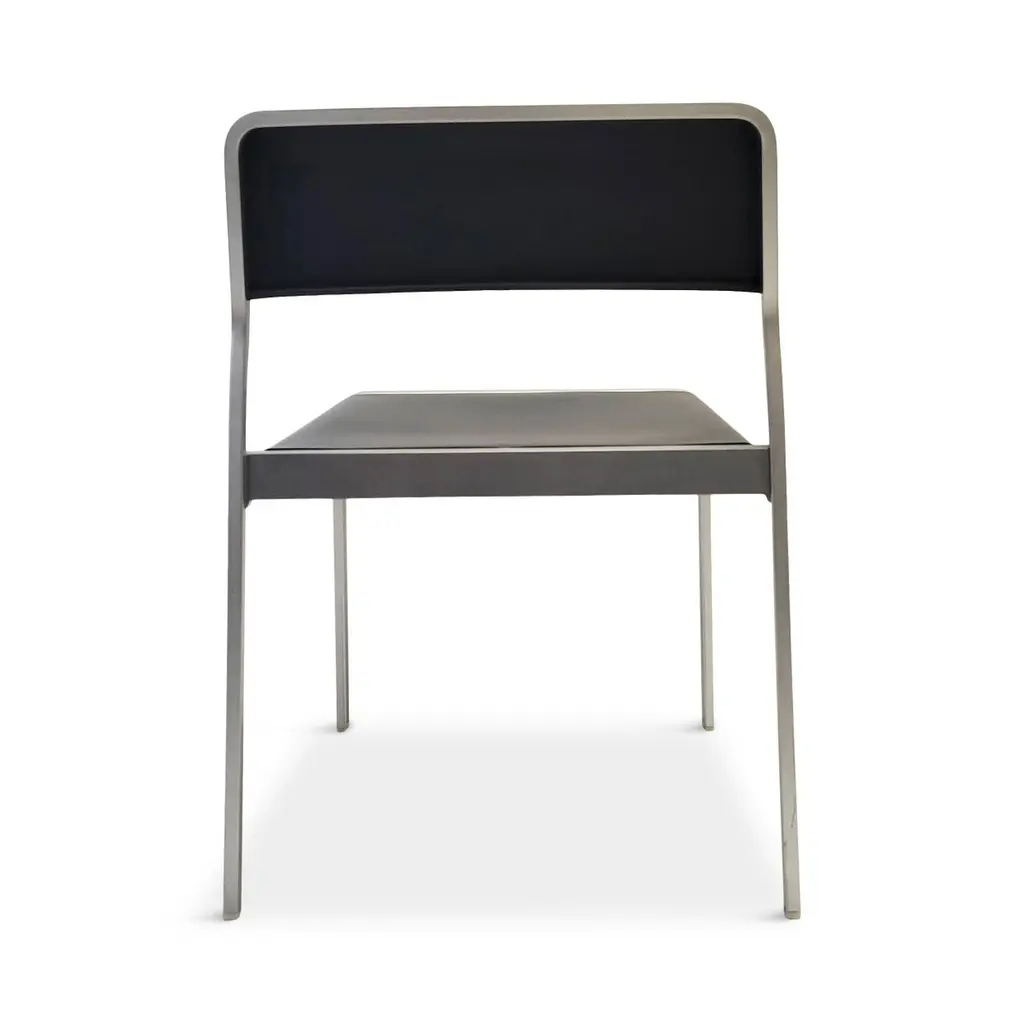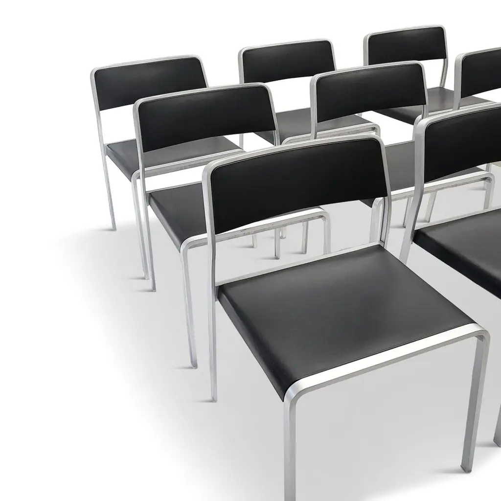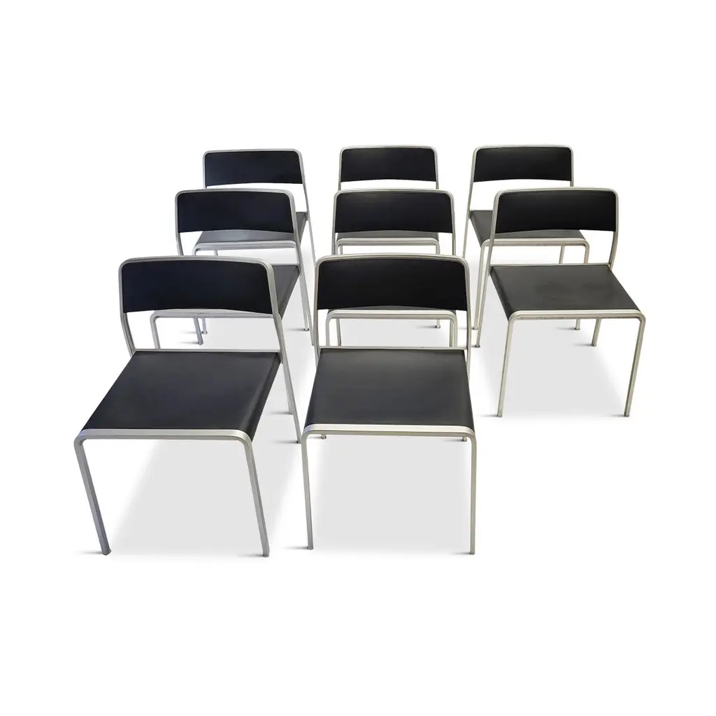 Designed in 2001 and produced by Pallucco in 2002, the Bridge is a Carlo Tamborini-designed stackable chair with a metal frame and plastic seat and back. The Bridge chair is very similar to Tamborini's later collaboration with Piero Lissoni that became the Lizz chair for Kartell. The Bridge was available with 4 legs or as a rolling desk chair and with and without arm rests. This pair has four silver legs and frame, grey anthracite seats and backs, and no armrests. Great for side chairs, dining chairs, accent or waiting area chairs, or for extra setting when there's a big gang coming over.In good vintage condition with some small scratches consistent with age and use. Little is known about this rare design as Pallucco has changed ownership several times in the 20 years since they were produced. Measures: 22" x 21" x 30" with 18" seat height.