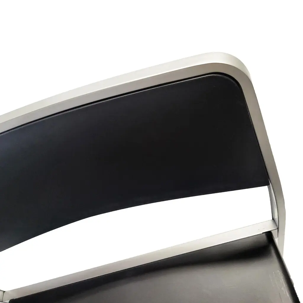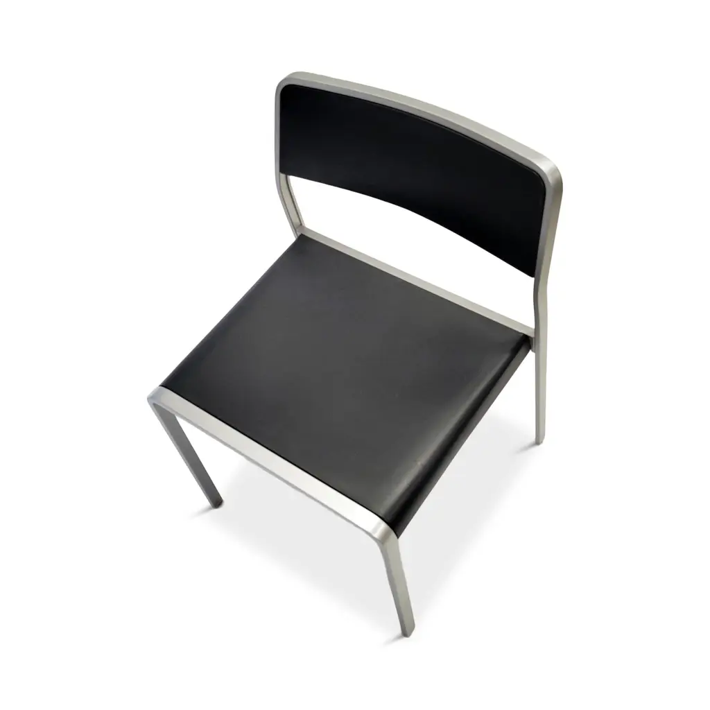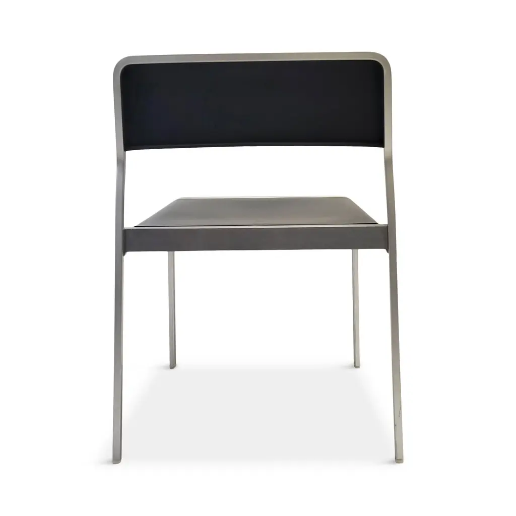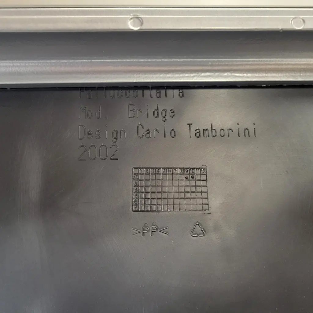 Designed in 2001 and produced by Pallucco in 2002, the Bridge is a Carlo Tamborini-designed stackable chair with a metal frame and plastic seat and back. The Bridge chair is very similar to Tamborini's later collaboration with Piero LIssoni that became the Lizz chair for Kartell. The Bridge was available with 4 legs or as a rolling desk chair and with and without armrests. This pair has four silver legs and frame, grey anthracite seats and backs, and no armrests. Great for side chairs, dining chairs, accent or waiting area chairs, or for extra setting when there's a big gang coming over. In good vintage condition with some small scratches consistent with age and use. Little is known about this rare design as Pallucco has changed ownership several times in the 20 years since they were produced. 22" x 21" x 30" with 18" seat height