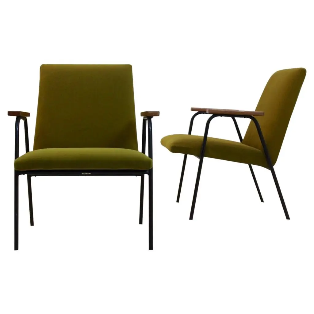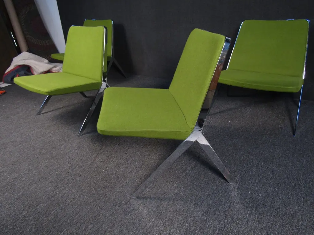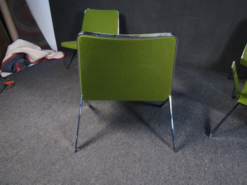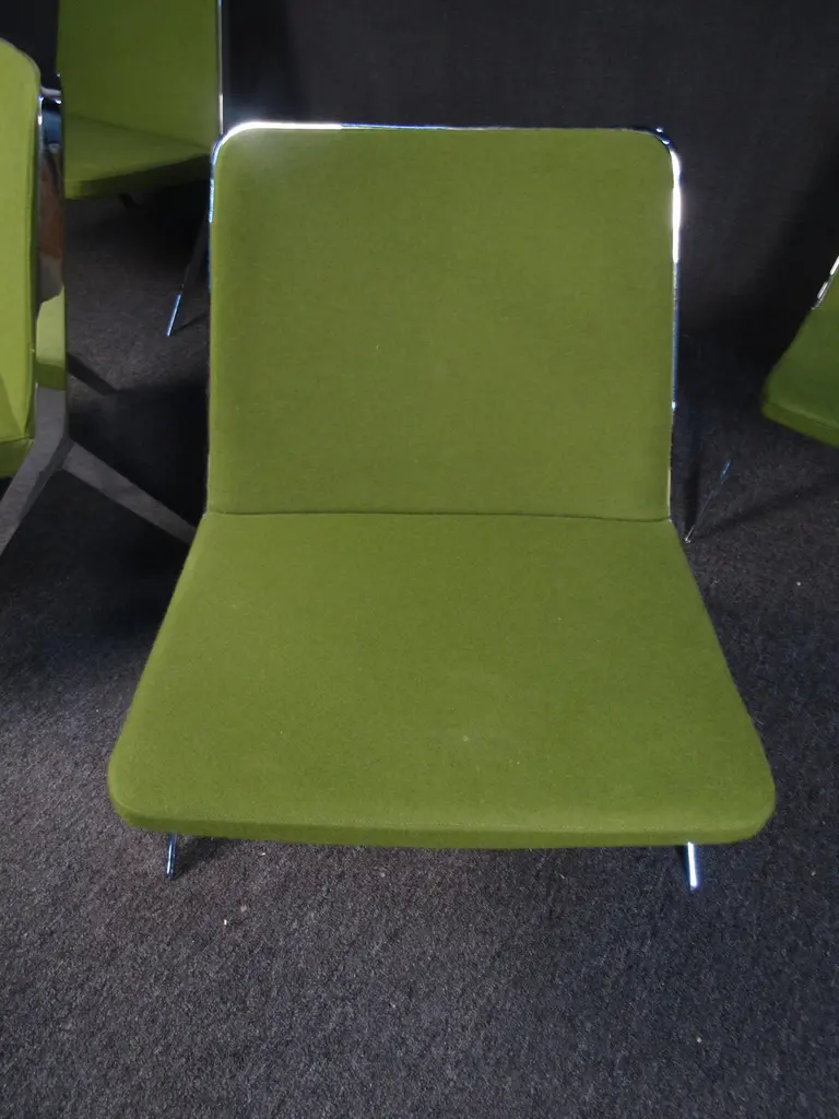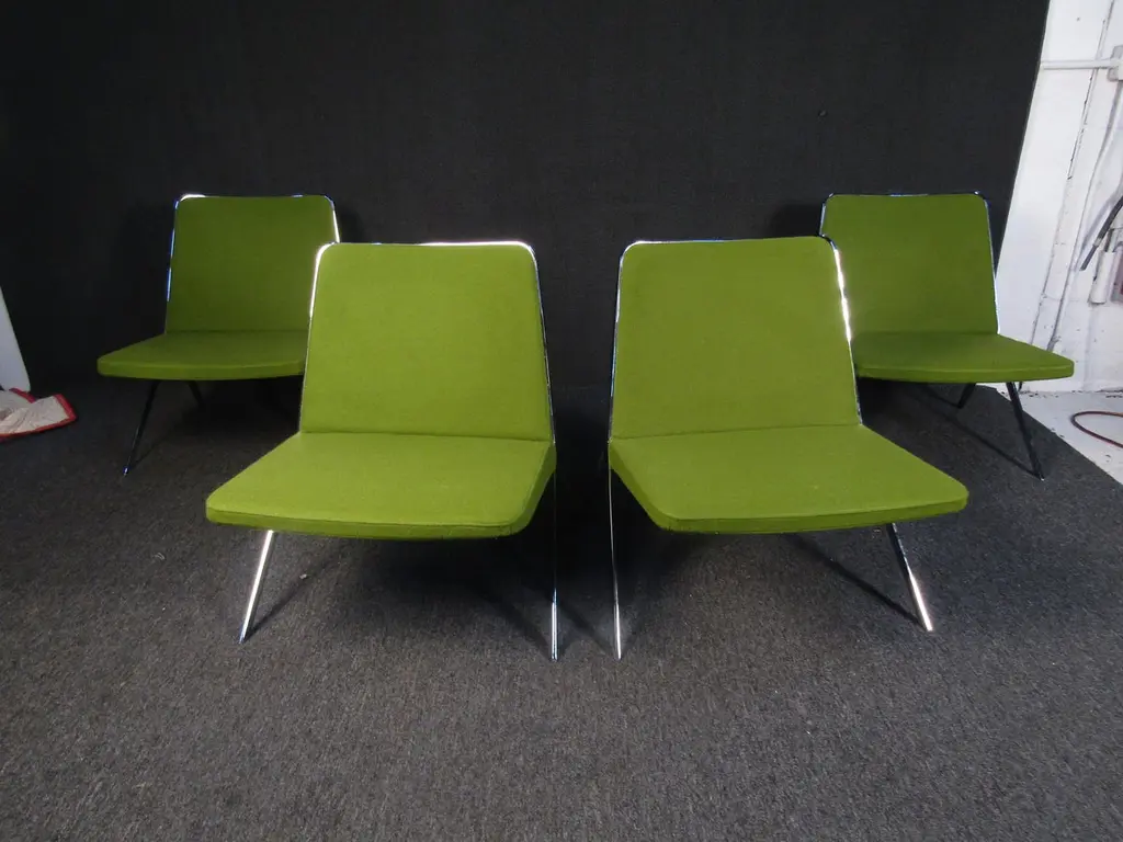 These Mid-Century Modern office chairs feature green fabric and a metal base. These chairs would be a perfect way to add vintage flare to an office or lounge space. Please confirm item location with seller (NY/NJ).
