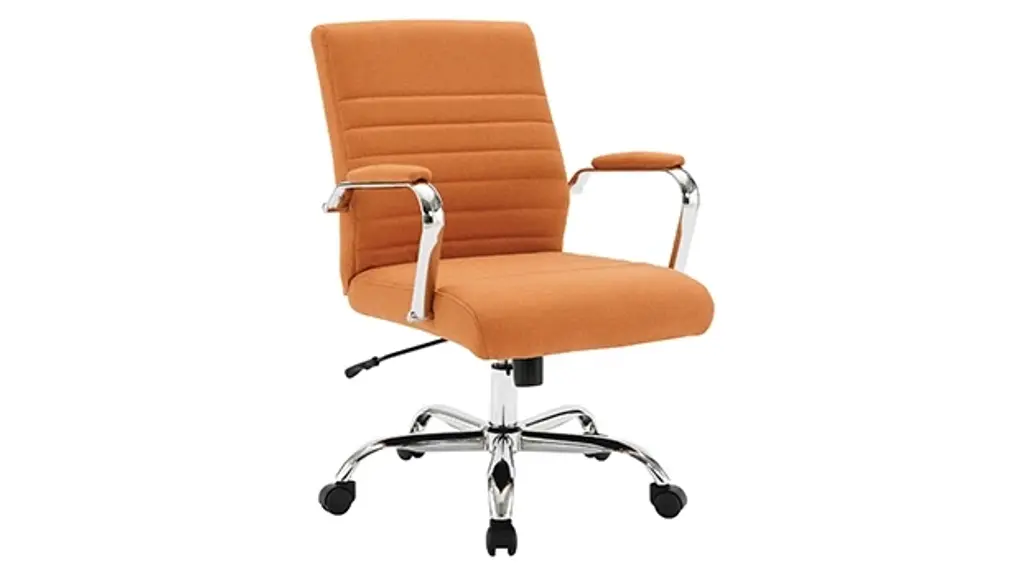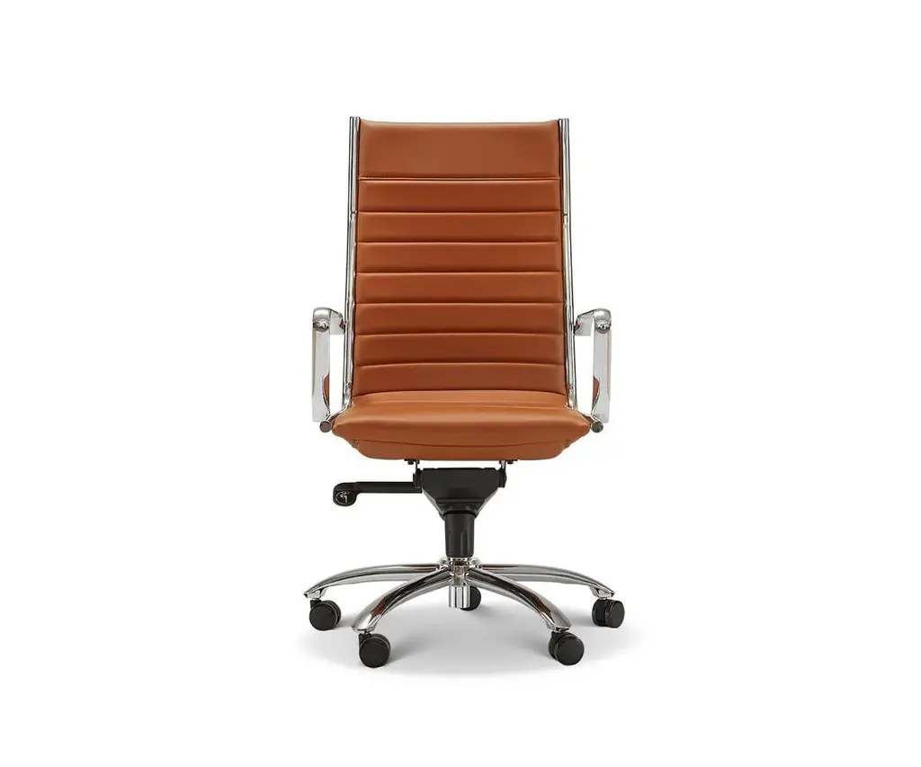 The Pandino Office Chair in Cognac is the perfect blend of modern refinement and reliable comfort. Crafted out of form fitting foam and draped in buttery regenerated leather, this chair features five legs in satin nickel finish atop black wheels for rolling mobility. The height can be adjusted by simply pushing on the lever below the seat. The Pandino Office Chair is the ideal look for any home office looking for a utility statement piece. *This would also go well with the Oria Office Desk Cognac.