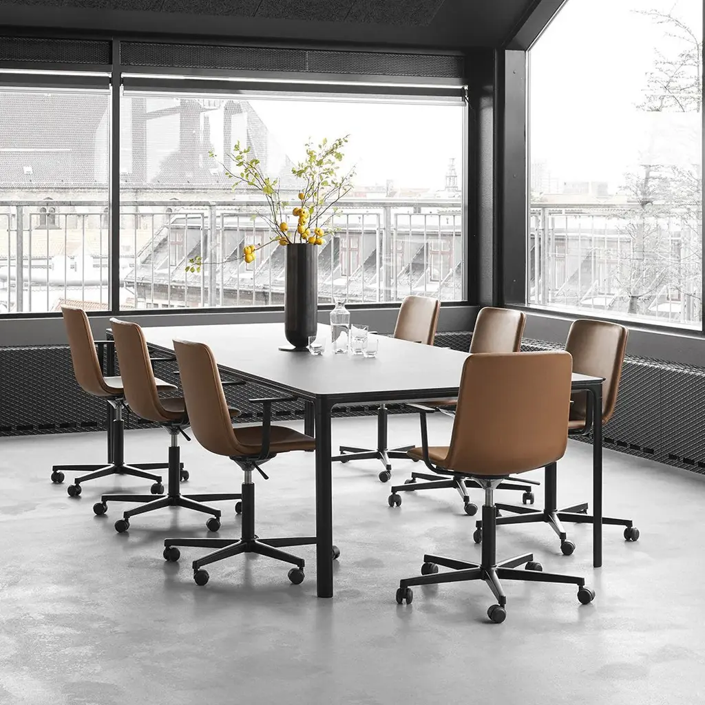 Full upholstered office chair with arms, mounted on 5-point swivel base on casters. The frame is height-adjustable with extended flexibility in the seat back. The chair has a higher back than the Pato shell, creating a strong visual appearance.