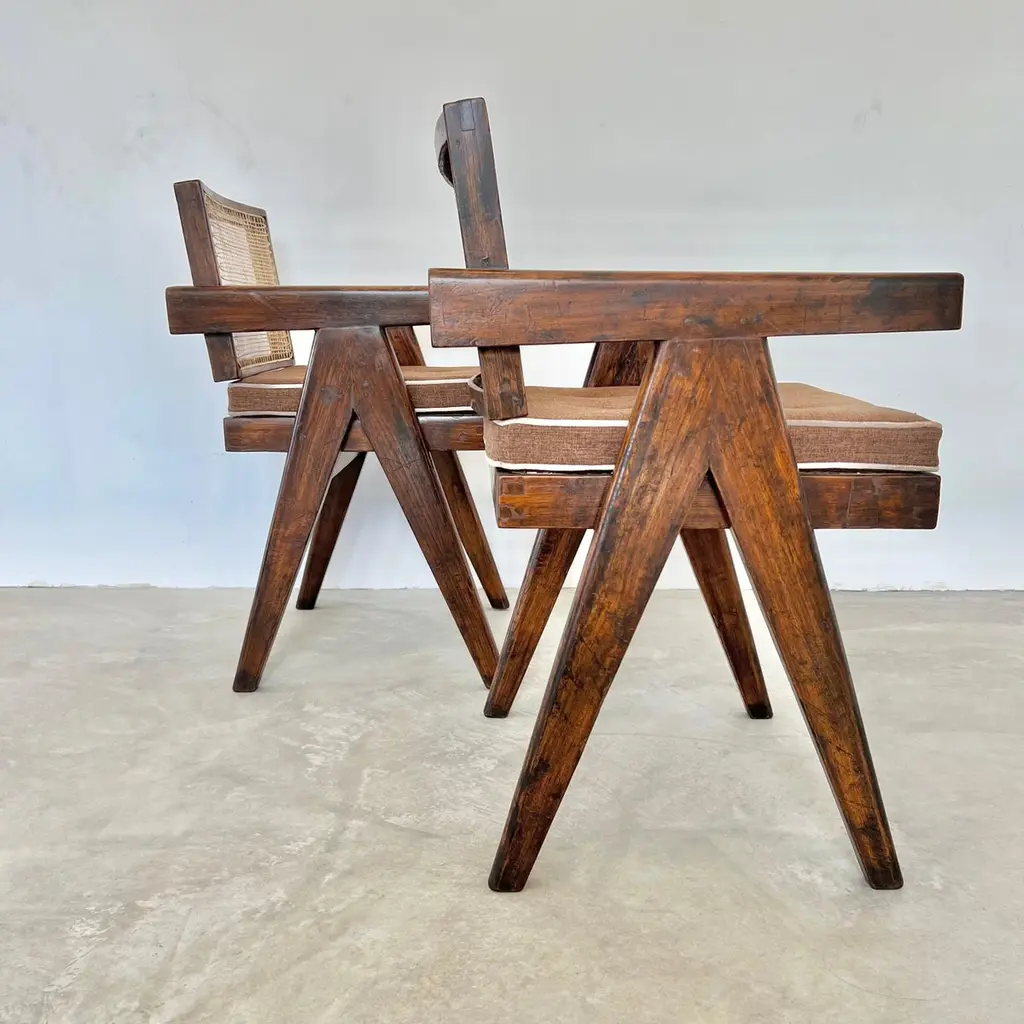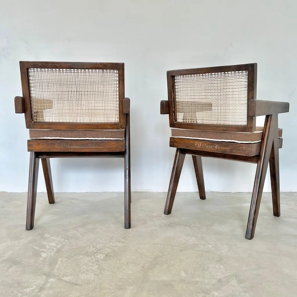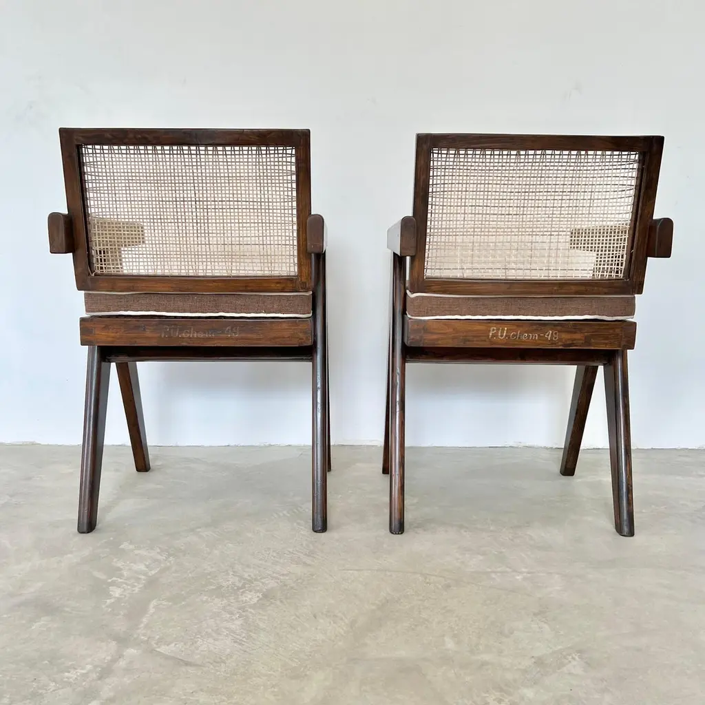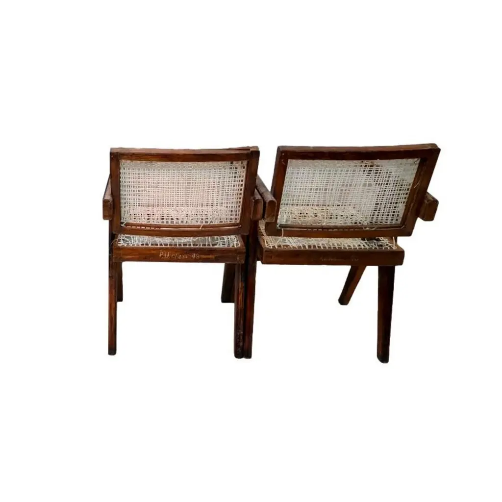 Fantastic collection of Pierre Jeanneret office chairs. Model PJ-0101-6S. Solid teak chairs with compass style legs, cane seat, and cane seat back. Slanted, slightly curved backrest. Hand stenciling on the back of both chairs reads : "P.U. chem - 48" and "P.U. chem - 49" respectively. These chairs came directly from India, and have never hit the open market for sale. Stenciling on each chair designating the location of the chairs in Chandigarh. Made for the university housing in Sector 14. Have all photos from before and after careful restoration. Restoration performed by artisans in India that specialize in Pierre Jeanneret. New cushions. Last 2 images on the listing are pre restoration.Seat height without cushion: 18"4 chairs available. Priced individually.Jeanneret Chandigargh Book - Jacques Dworczak - Page 102.