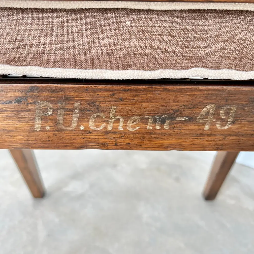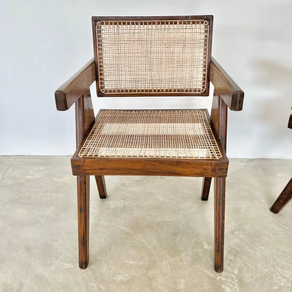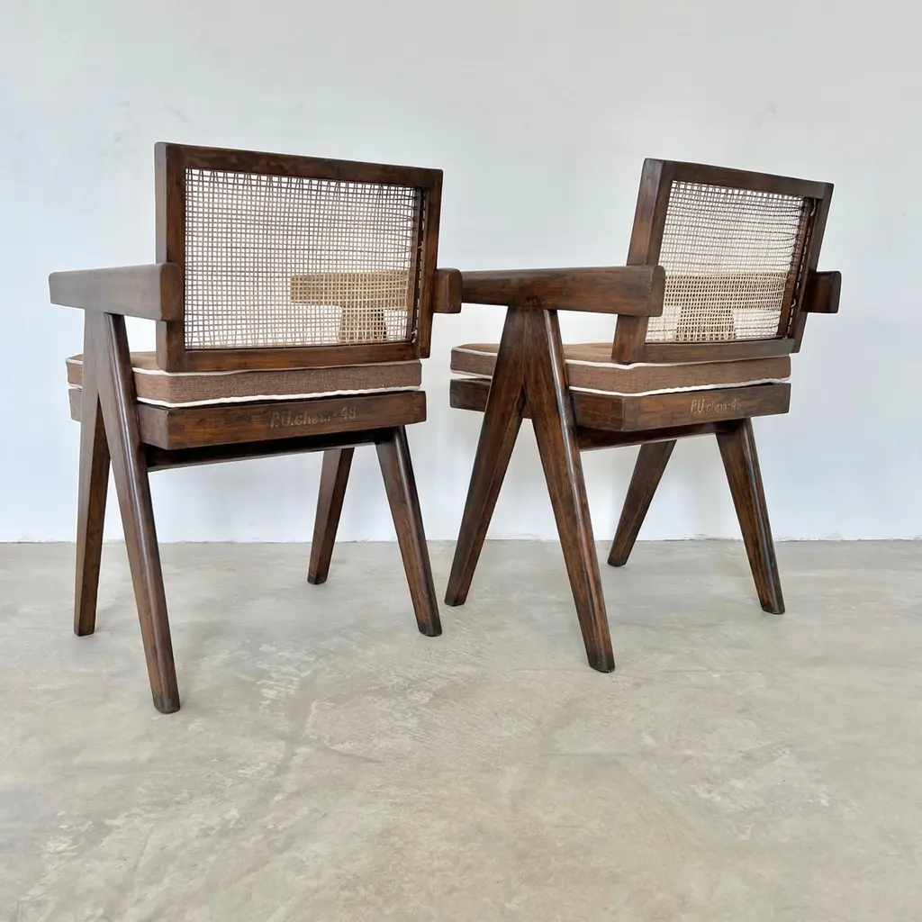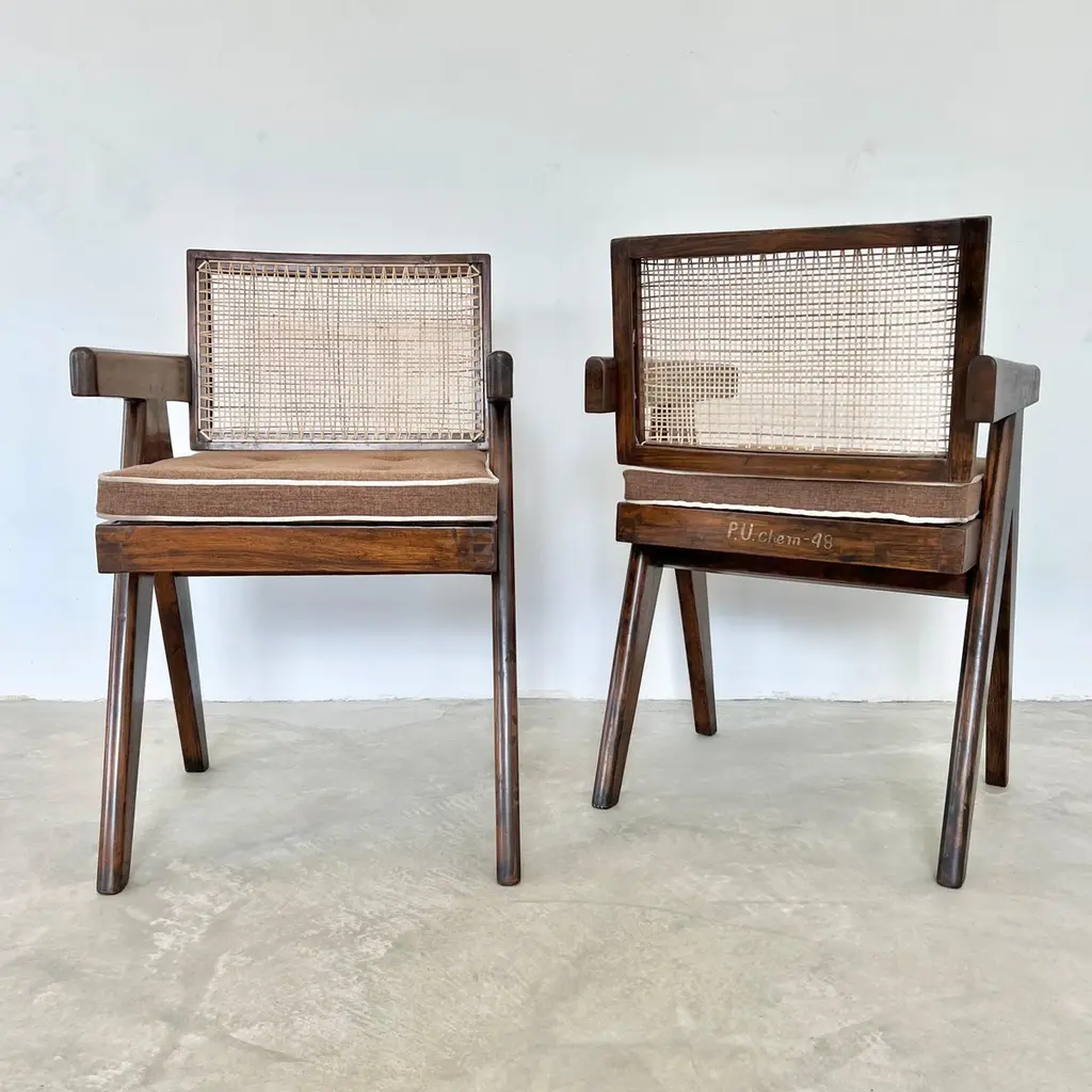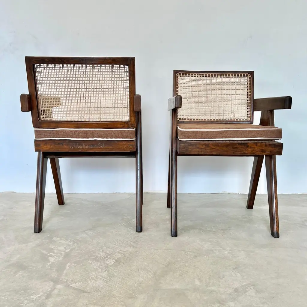 Fantastic collection of Pierre Jeanneret office chairs. Model PJ-0101-6S. Solid teak chairs with compass style legs, cane seat, and cane seat back. Slanted, slightly curved backrest. Hand stenciling on the back of both chairs reads : "P.U. chem - 48" and "P.U. chem - 49" respectively. These chairs came directly from India, and have never hit the open market for sale. Stenciling on each chair designating the location of the chairs in Chandigarh. Made for the university housing in Sector 14. Have all photos from before and after careful restoration. Restoration performed by artisans in India that specialize in Pierre Jeanneret. New cushions. Last 2 images on the listing are pre restoration.Seat height without cushion: 18"4 chairs available. Priced individually.Jeanneret Chandigargh Book - Jacques Dworczak - Page 102.