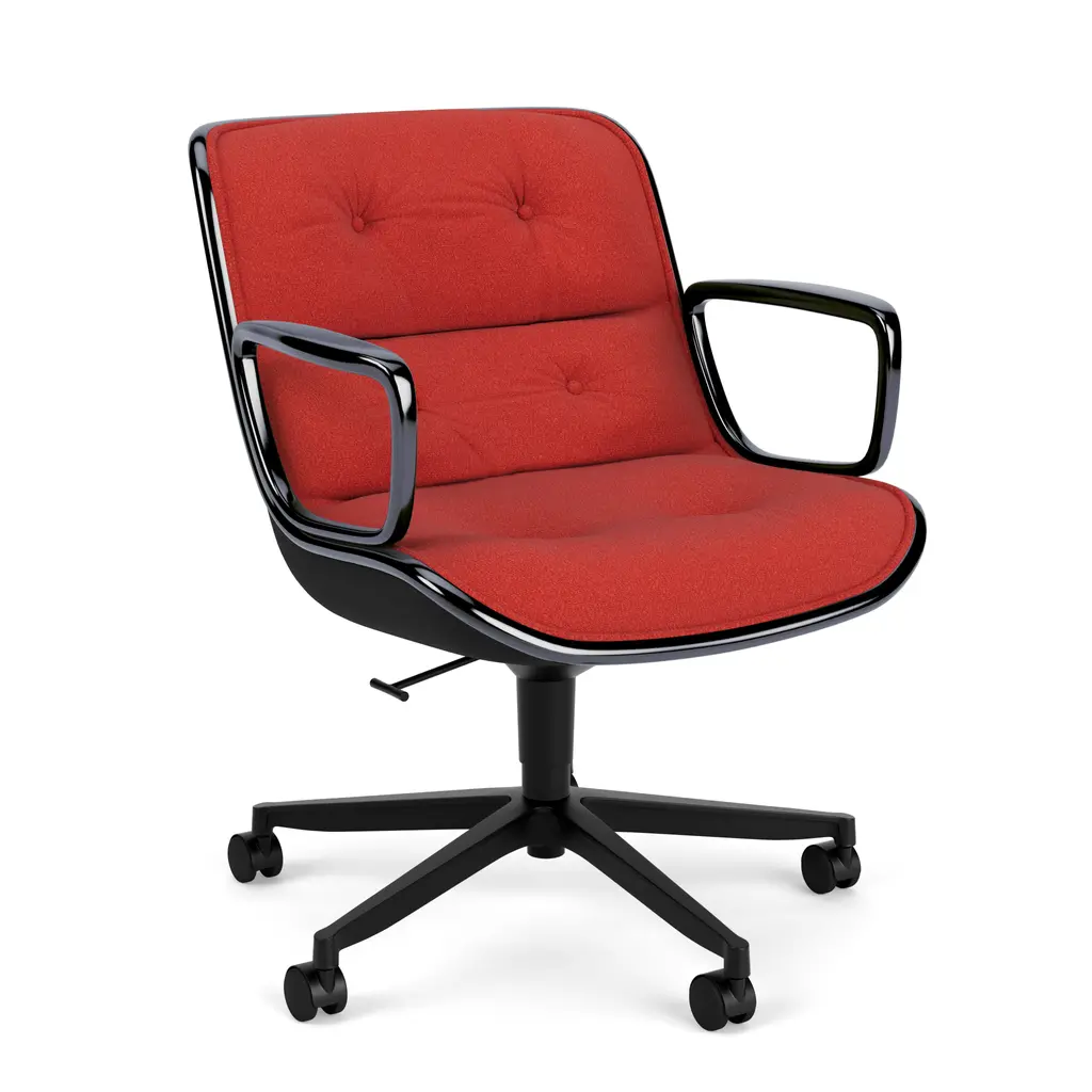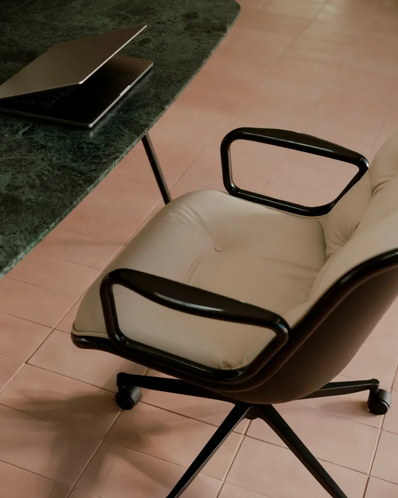 The Pollock Executive Chair features what the designer described as "rim technology"—the use of a single aluminum band around the chair's perimeter to hold the design together, structurally and visually. Fifty years after its introduction, the Pollock Chair continues to exude timeless elegance in any home office.