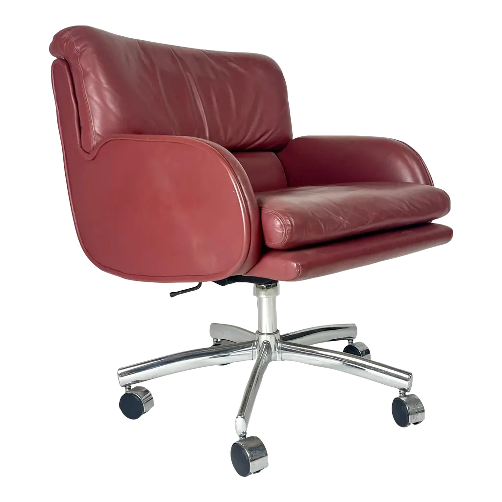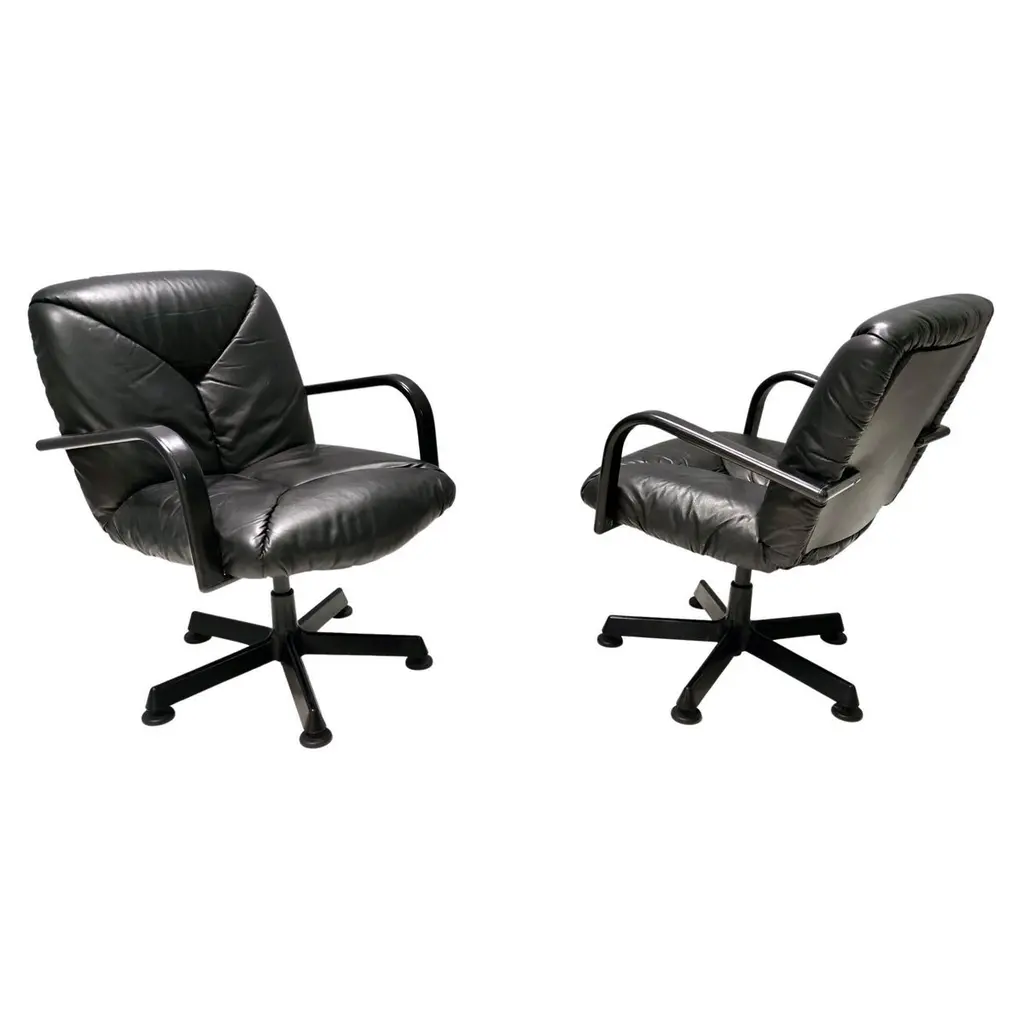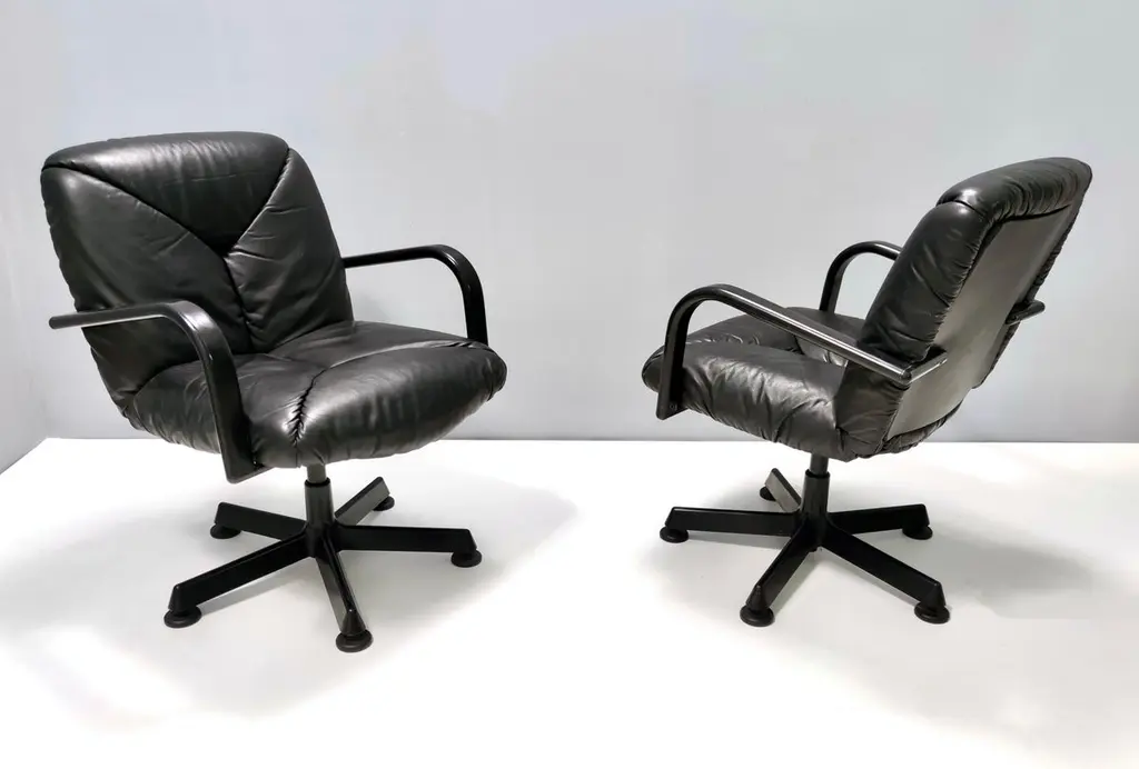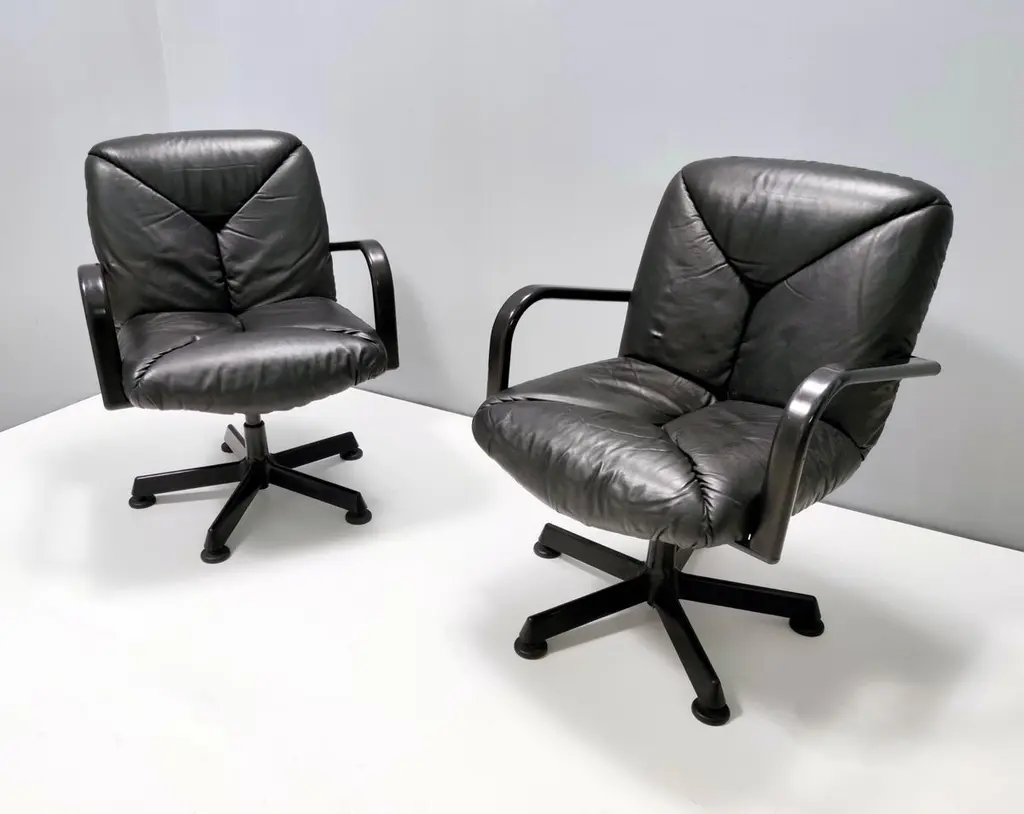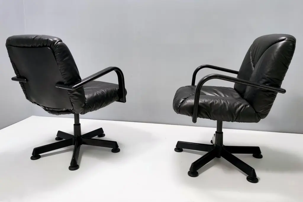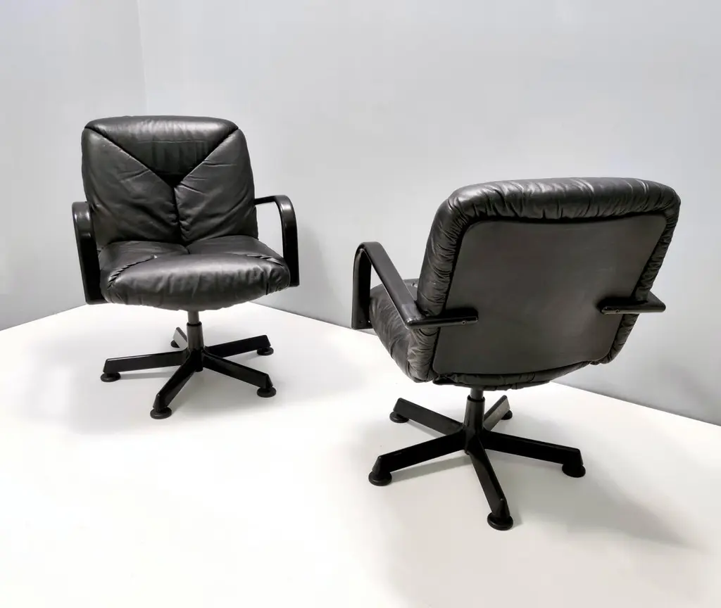 Made in Italy in 1978 and designed by Vico Magistretti for ICF De Padova.These office chairs feature a solid varnished metal and hard plastic frame and their original high-quality leather upholstery.Their padding is original and still soft and comfortable.These chairs are vintage, therefore they might show slight traces of use, but they can be considered as in very good original condition, with no rips or stain.Literature: "Domus n 580 - marzo 1978" p. 32Sold separately: price is per item. Measures: Width 72 cmDepth 66 cm Height 85 cm.Order it now!We sell the best quality pieces and we offer an amazing service: if it's not during night time, we answer within 2 hours and we absolutely love to follow every step of the purchase and even after. As matter of fact we really appreciate our customers’ feedback and when we receive pictures of our pieces in their new homes.We assist you during the process and answer all your questions. In addition to this, we always review the pieces before shipping, so that you receive the goods at its very best. We provide the best possible quotes and professionally and carefully pack the items. Insurance is included. And if there is any issue, it is our mission to make so you don't have to worry: we will always be there for you to assist in any way possible.