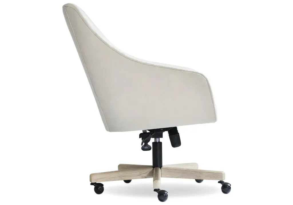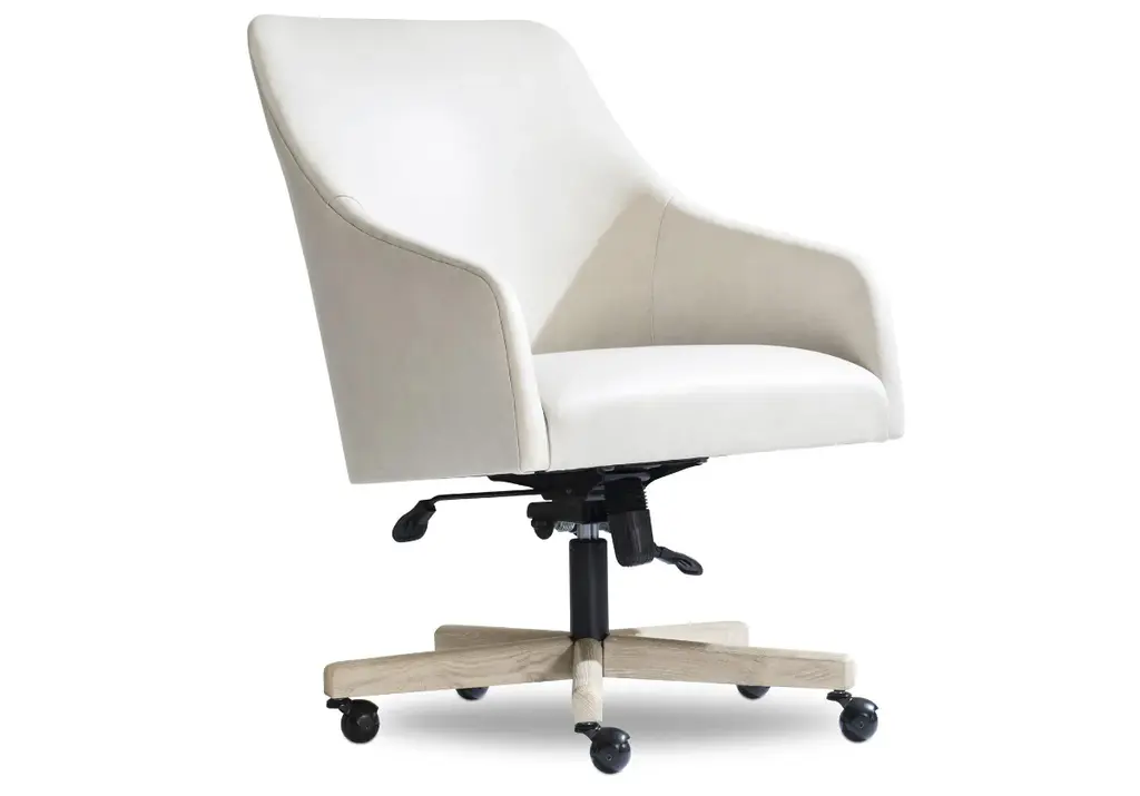 The Prado Chair features a tall back with gently sloping arms fully upholstered in leather. An adjustable metal base with casters and wood caps adds functionality and interest. Style in an office with a desk for a tasteful design.