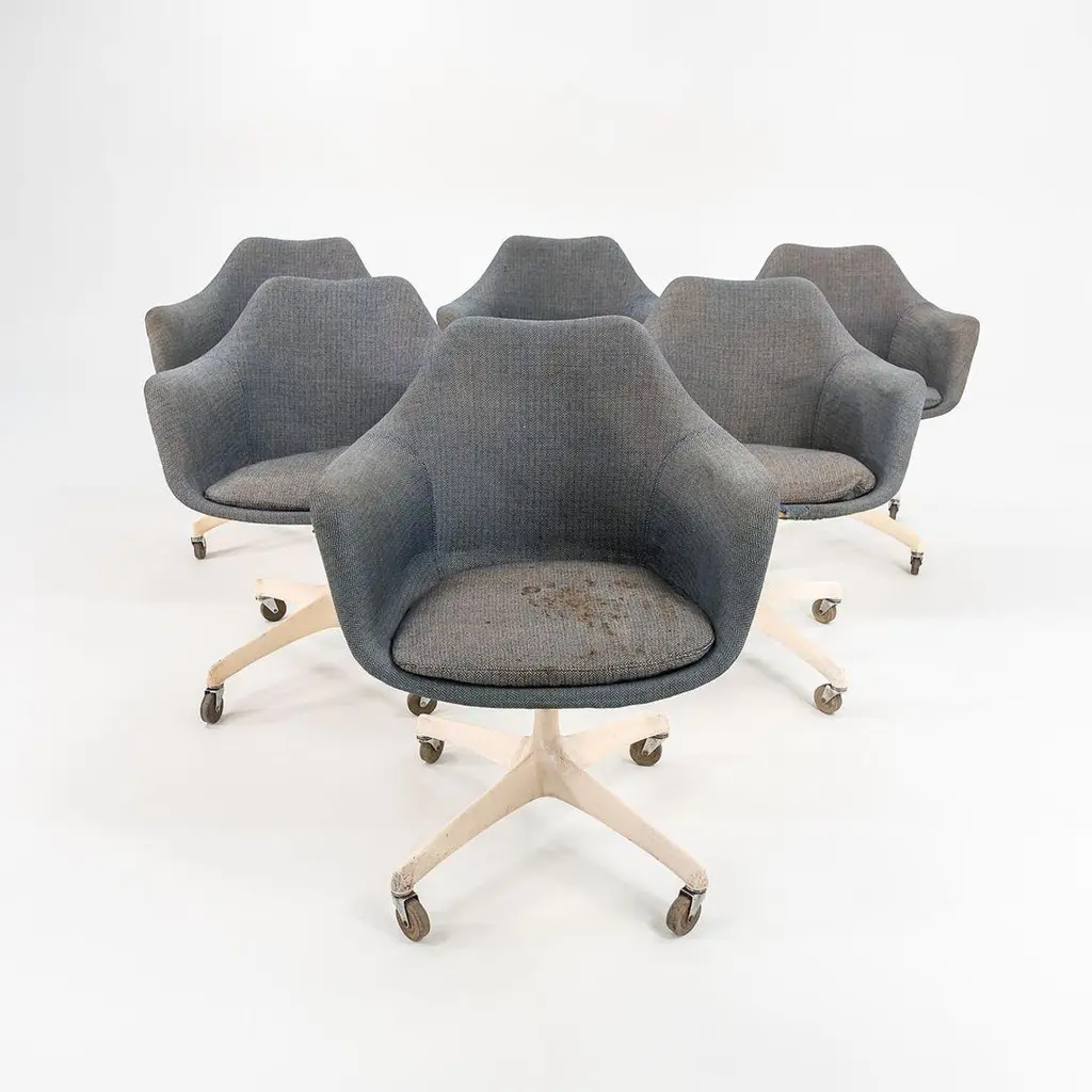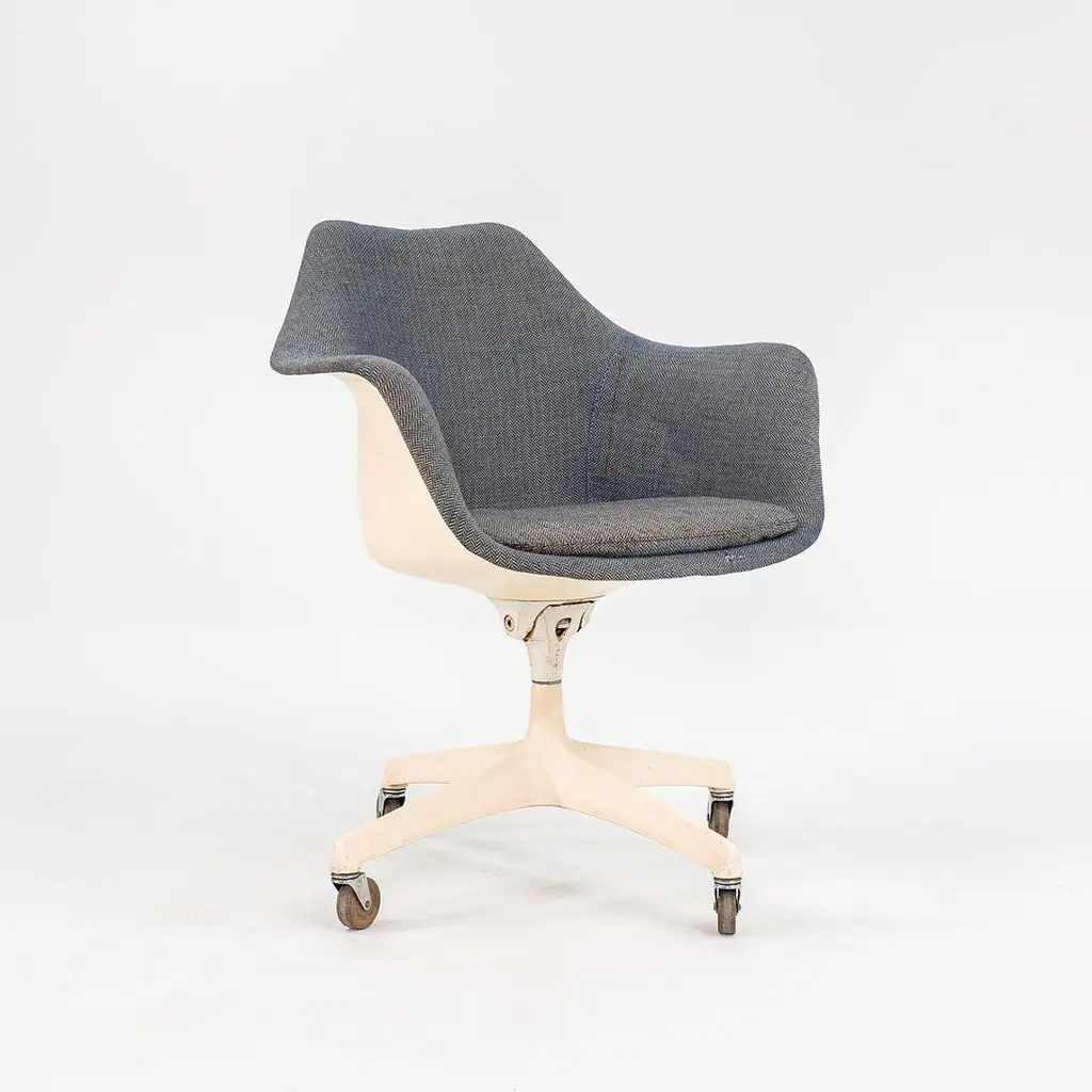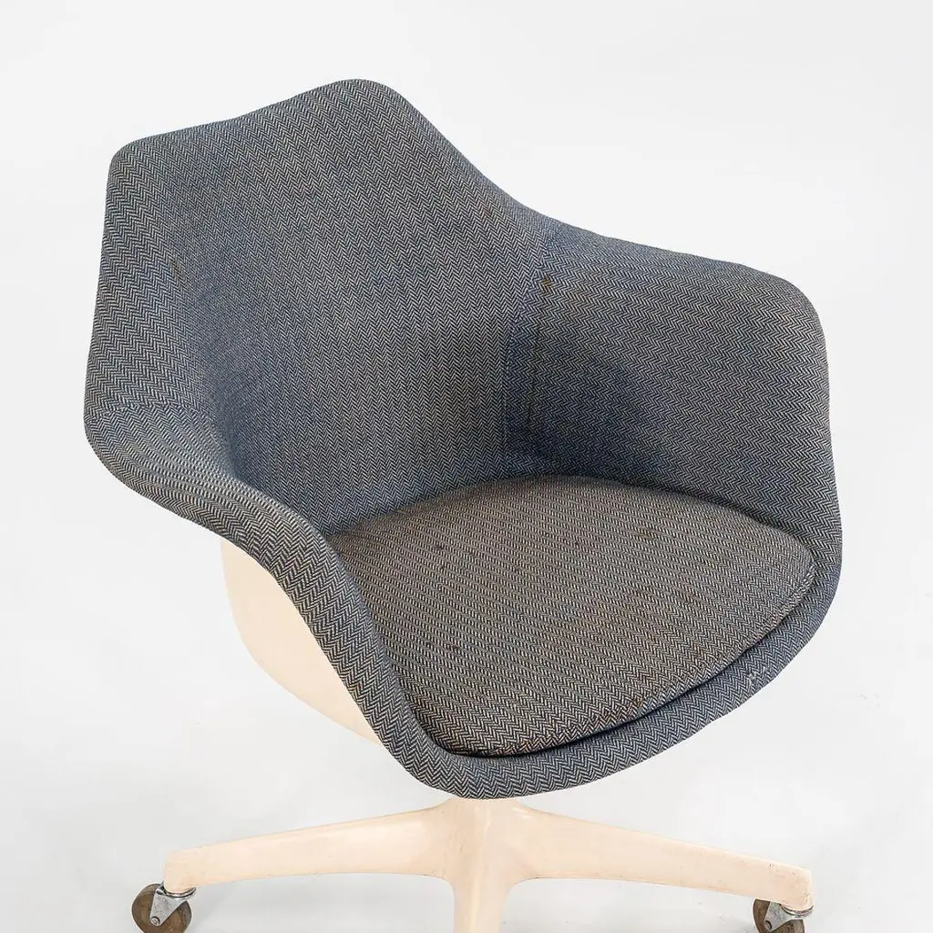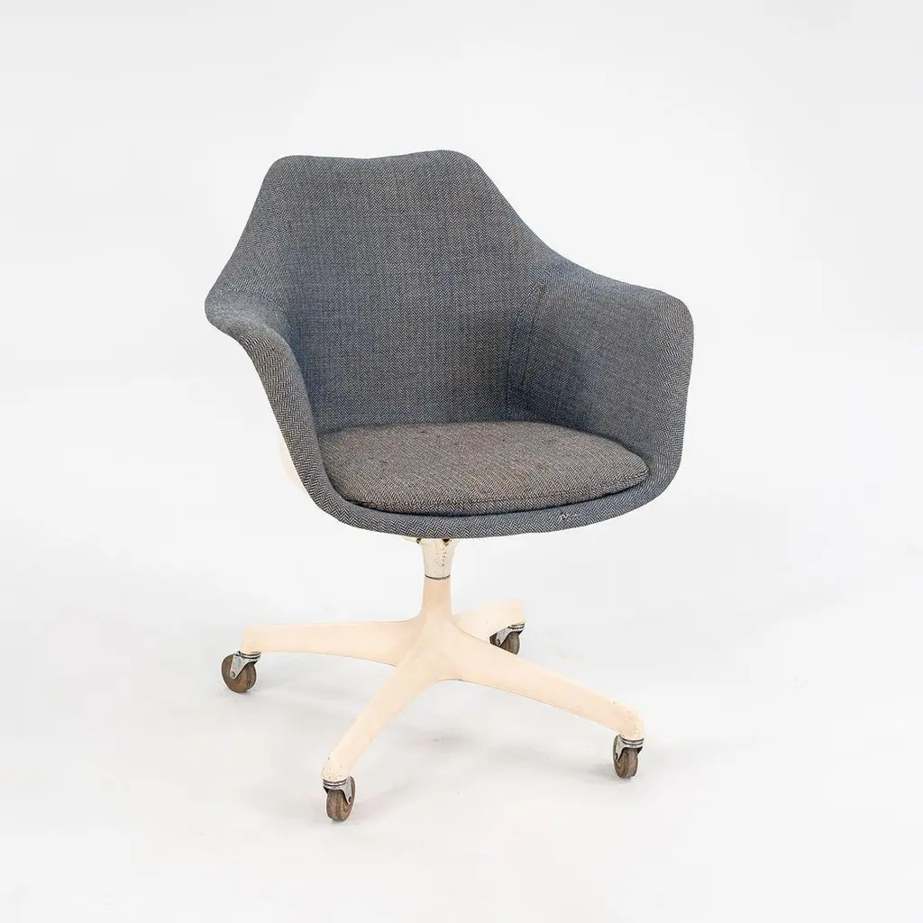 These are Executive desk chairs, designed by Eero Saarinen for Knoll Associates in the 1960s. This is a rather rare model, 150UDS. The listed price includes one chair, and we have several available for purchase. They have a four-point cast aluminum base with a white finish and retain their original rubber casters. Some of the chairs also retain their original 320 Park Avenue Knoll labels, which further verify the production period. Each chair measures 27 inches deep, 26 inches wide, and 33.5 inches high. They have a seat height of 20 inches. This set retains its original grey/blue fabric upholstery that is in need of replacement. There are marks and scuffs on the bases and the casters. Overall, these chairs are in original untouched condition with age and use apparent. Please see photos. Genuinely faulty goods will be replaced or money refunded on a case by case basis, however we must be advised of any faulty goods upon receipt of the item. It is the customer's responsibility to pay for return shipping and ship the item back to us. If the item is found to be faulty, we will also refund the postage cost. If there is no damage to the item, but a return is approved, the buyer will be responsible for both the initial and return shipping cost. It is at our discretion to refuse the refund of undamaged goods. If an order is placed and you would like to cancel the order, please notify us immediately. Any refunds will be processed via the same means that payment was made.