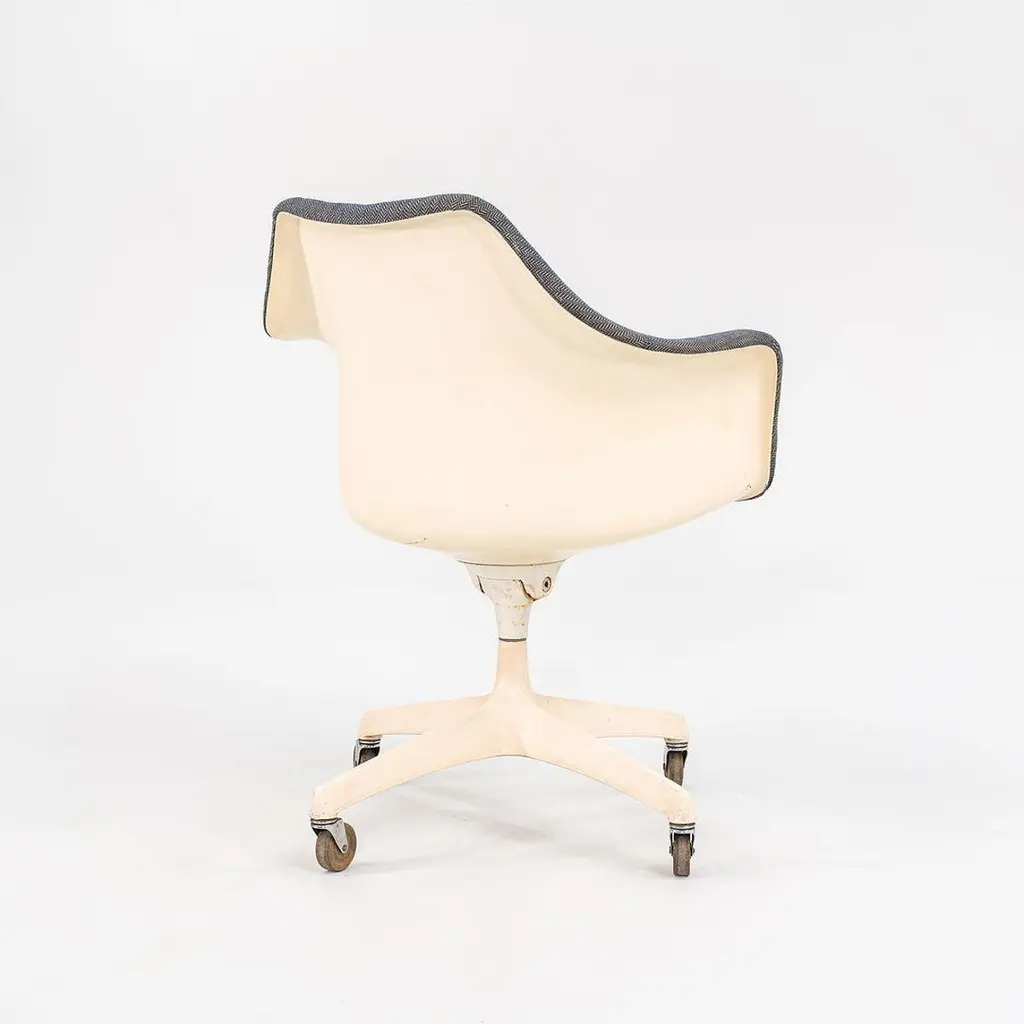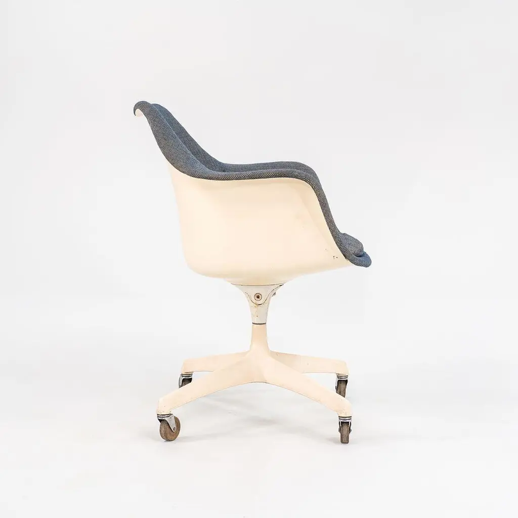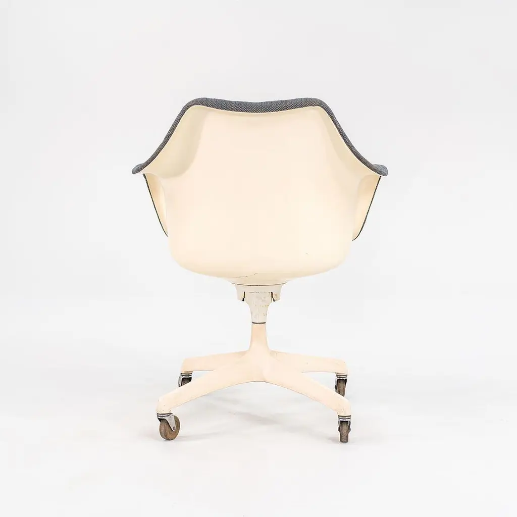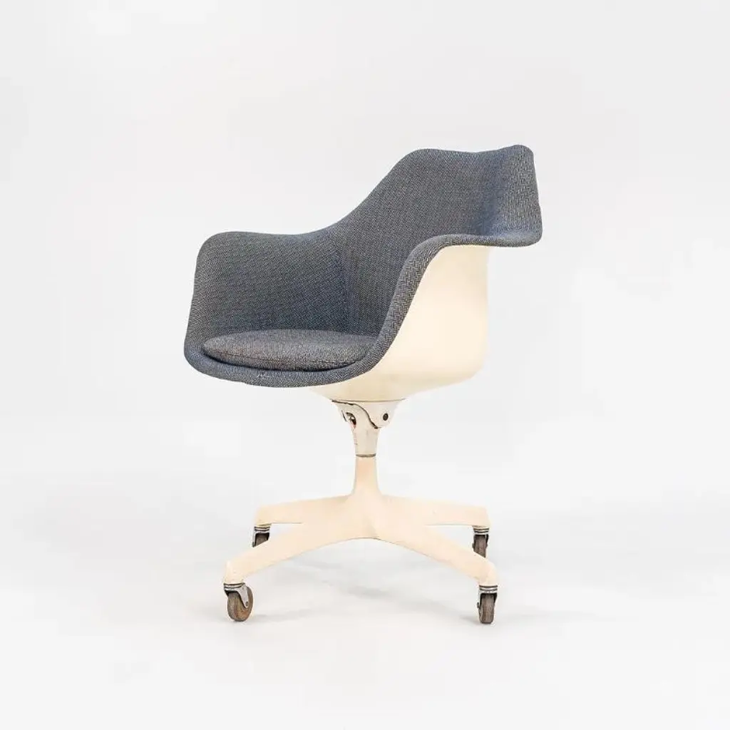 These are Executive desk chairs, designed by Eero Saarinen for Knoll Associates in the 1960s. This is a rather rare model, 150UDS. The listed price includes one chair, and we have several available for purchase. They have a four-point cast aluminum base with a white finish and retain their original rubber casters. Some of the chairs also retain their original 320 Park Avenue Knoll labels, which further verify the production period. Each chair measures 27 inches deep, 26 inches wide, and 33.5 inches high. They have a seat height of 20 inches. This set retains its original grey/blue fabric upholstery that is in need of replacement. There are marks and scuffs on the bases and the casters. Overall, these chairs are in original untouched condition with age and use apparent. Please see photos. Genuinely faulty goods will be replaced or money refunded on a case by case basis, however we must be advised of any faulty goods upon receipt of the item. It is the customer's responsibility to pay for return shipping and ship the item back to us. If the item is found to be faulty, we will also refund the postage cost. If there is no damage to the item, but a return is approved, the buyer will be responsible for both the initial and return shipping cost. It is at our discretion to refuse the refund of undamaged goods. If an order is placed and you would like to cancel the order, please notify us immediately. Any refunds will be processed via the same means that payment was made.