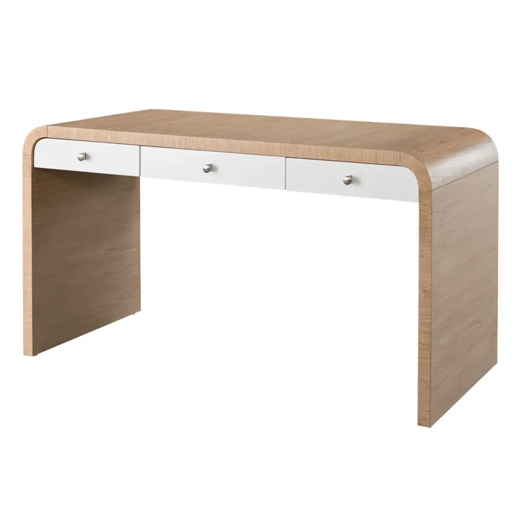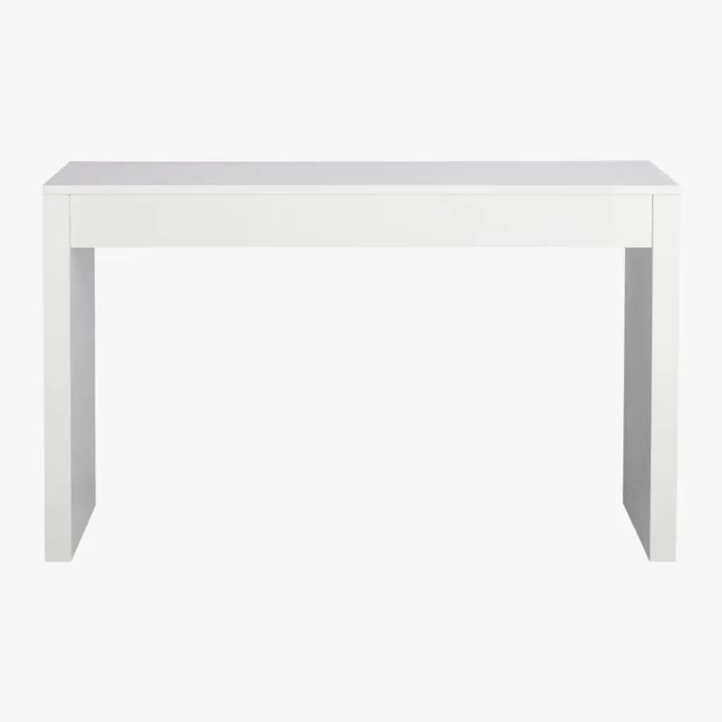 Hi-gloss white lacquer desk downsizes for space but ups the style quotient for office, entryway or bedroom. Discreet sleek dual drawers organize desk supplies and papers, keys and mail (perfect entry console), even cosmetics (makes a great vanity, too). Pair with a modern office chair for a chic and functional space.