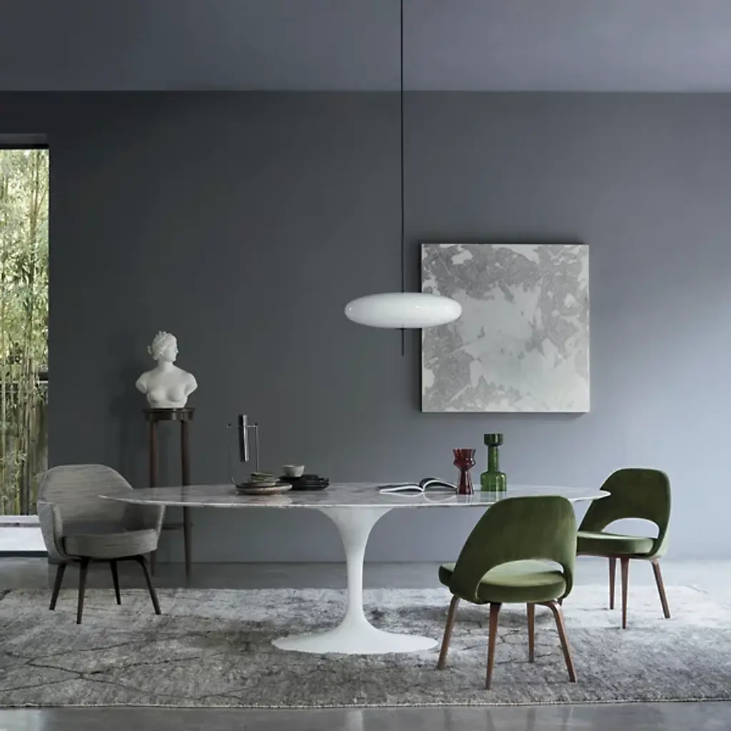 Designed by Eero Saarinen in 1946. The Saarinen Executive Chair with Wood Legs from Knoll has a fluid shape with a timeless quality, allowing it to complement a broad range of established decors. Eero Saarinen wanted to create a chair that provided comfort through the shape of its shell instead of the thickness of its cushions, and this resulting chair has helped shape how people view executive seating. The shell is made out of molded, reinforced polyurethane, and the seat is made out of contoured plywood.