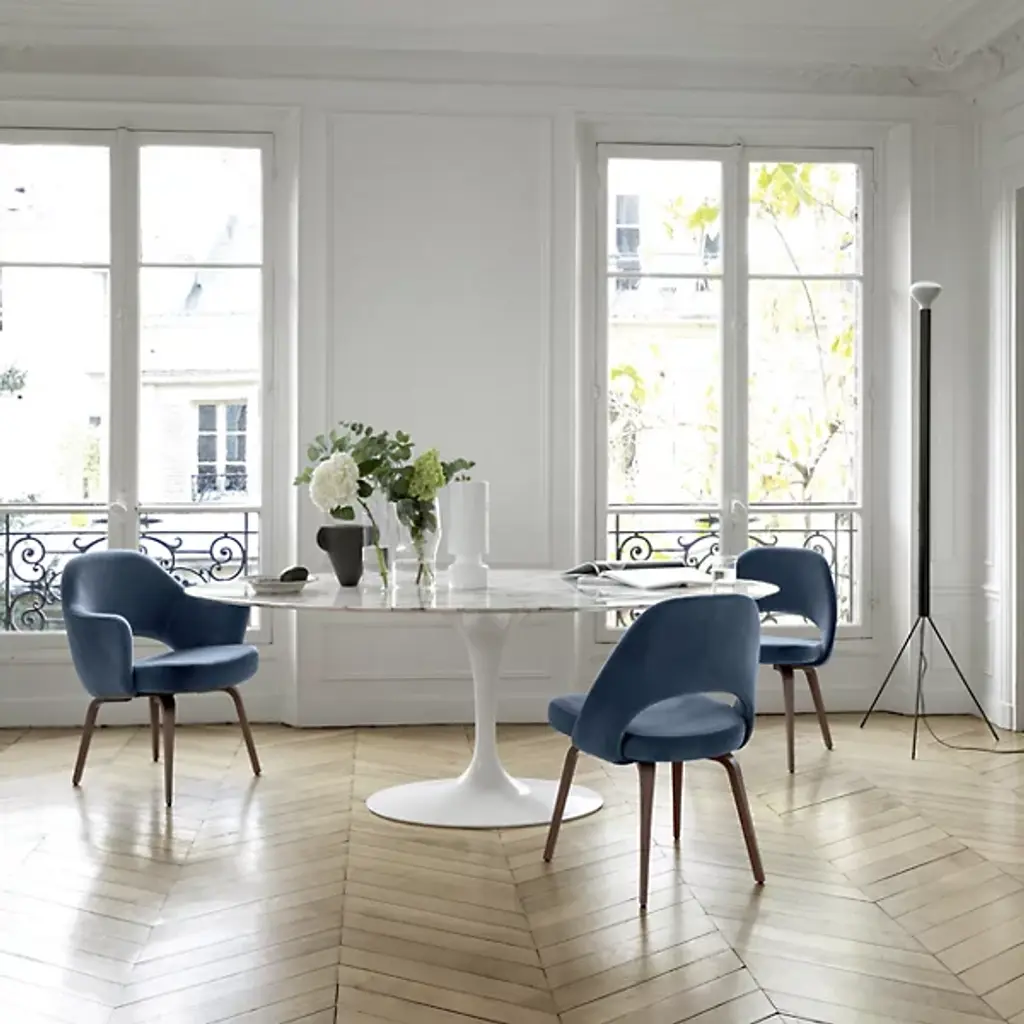 Designed by Eero Saarinen in 1946. The Saarinen Executive Chair with Wood Legs from Knoll has a fluid shape with a timeless quality, allowing it to complement a broad range of established decors. Eero Saarinen wanted to create a chair that provided comfort through the shape of its shell instead of the thickness of its cushions, and this resulting chair has helped shape how people view executive seating. The shell is made out of molded, reinforced polyurethane, and the seat is made out of contoured plywood.