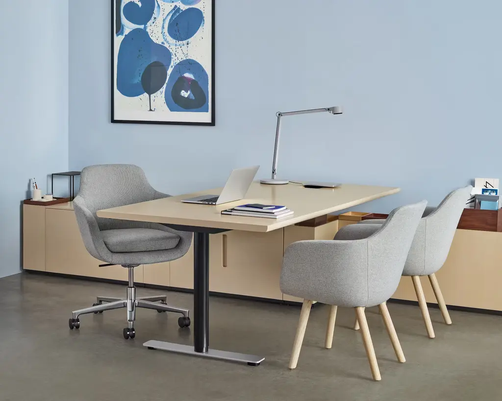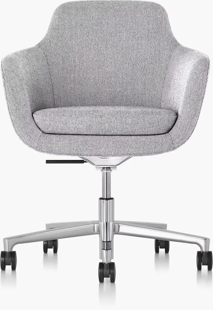 Celebrating the virtues of simple design and the way it seamlessly intertwines itself with the environments in which it's found and the people who interact with it, the Saiba Chair (2016) is right at home wherever elegant seating is needed. Its comfortable lounge-like bucket seat is crafted with gentle curves and fine tailoring. A swiveling height-adjustable base completes the look of this warm, familiar form. Crafted in North Carolina by skilled artisans using globally sourced materials.