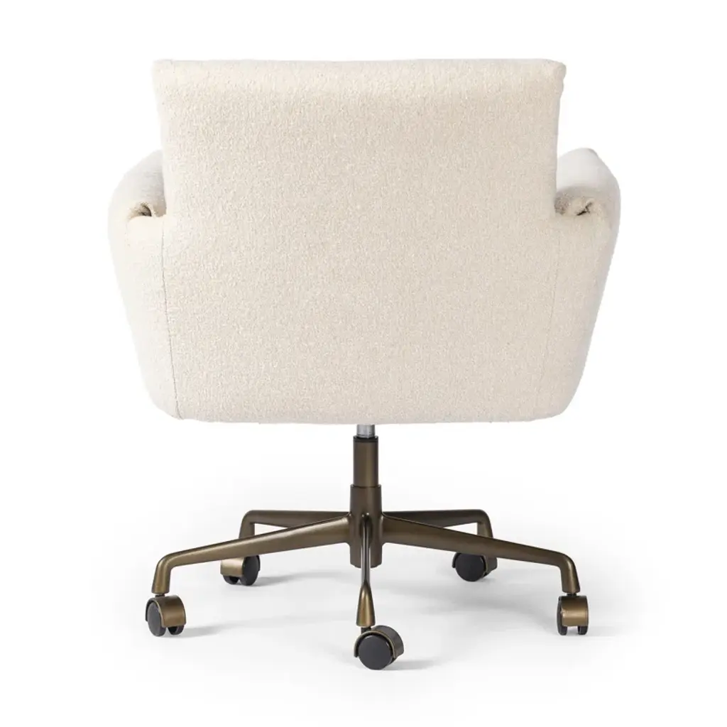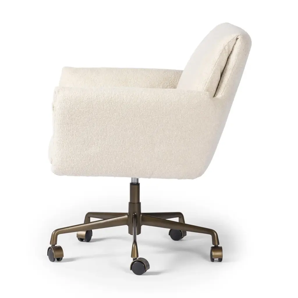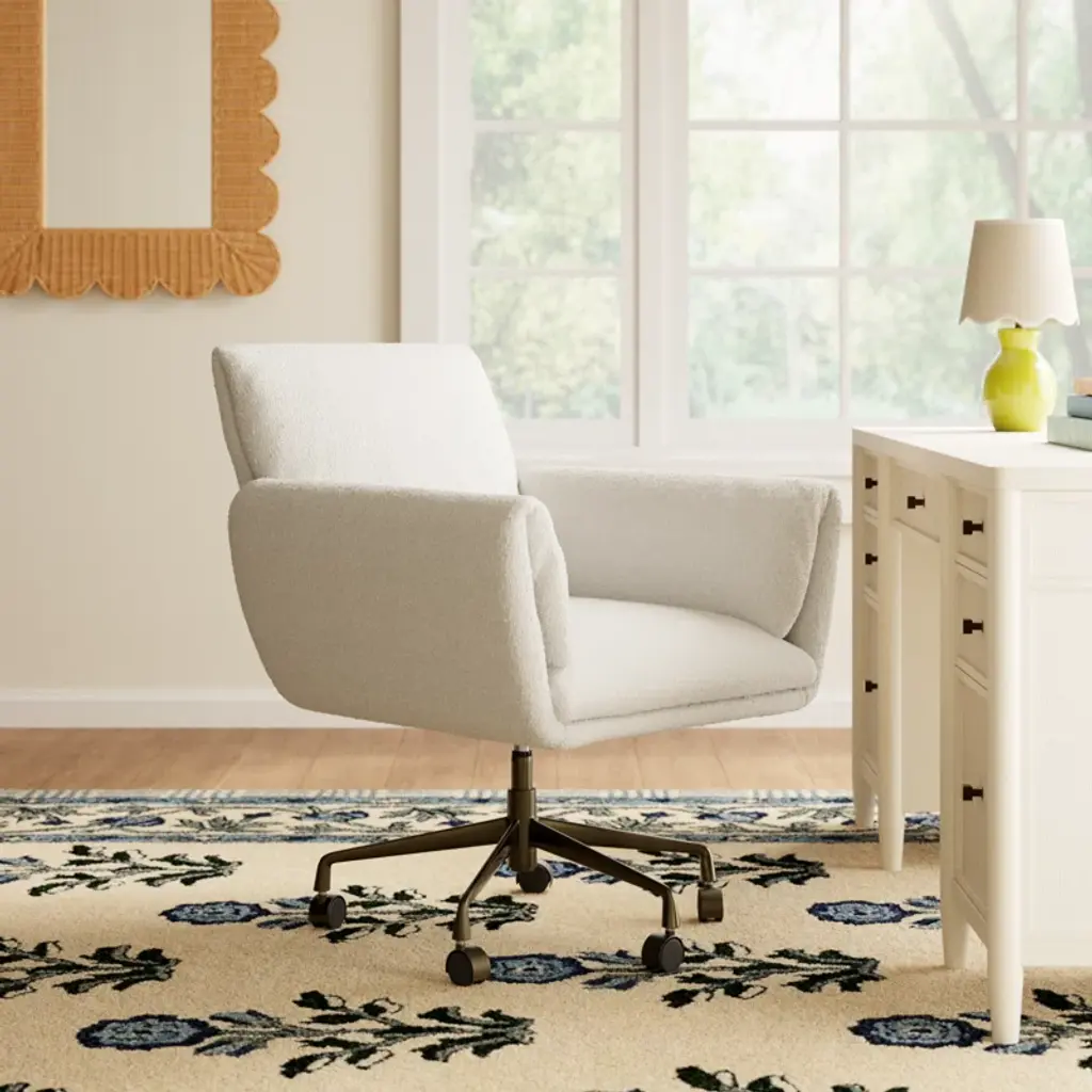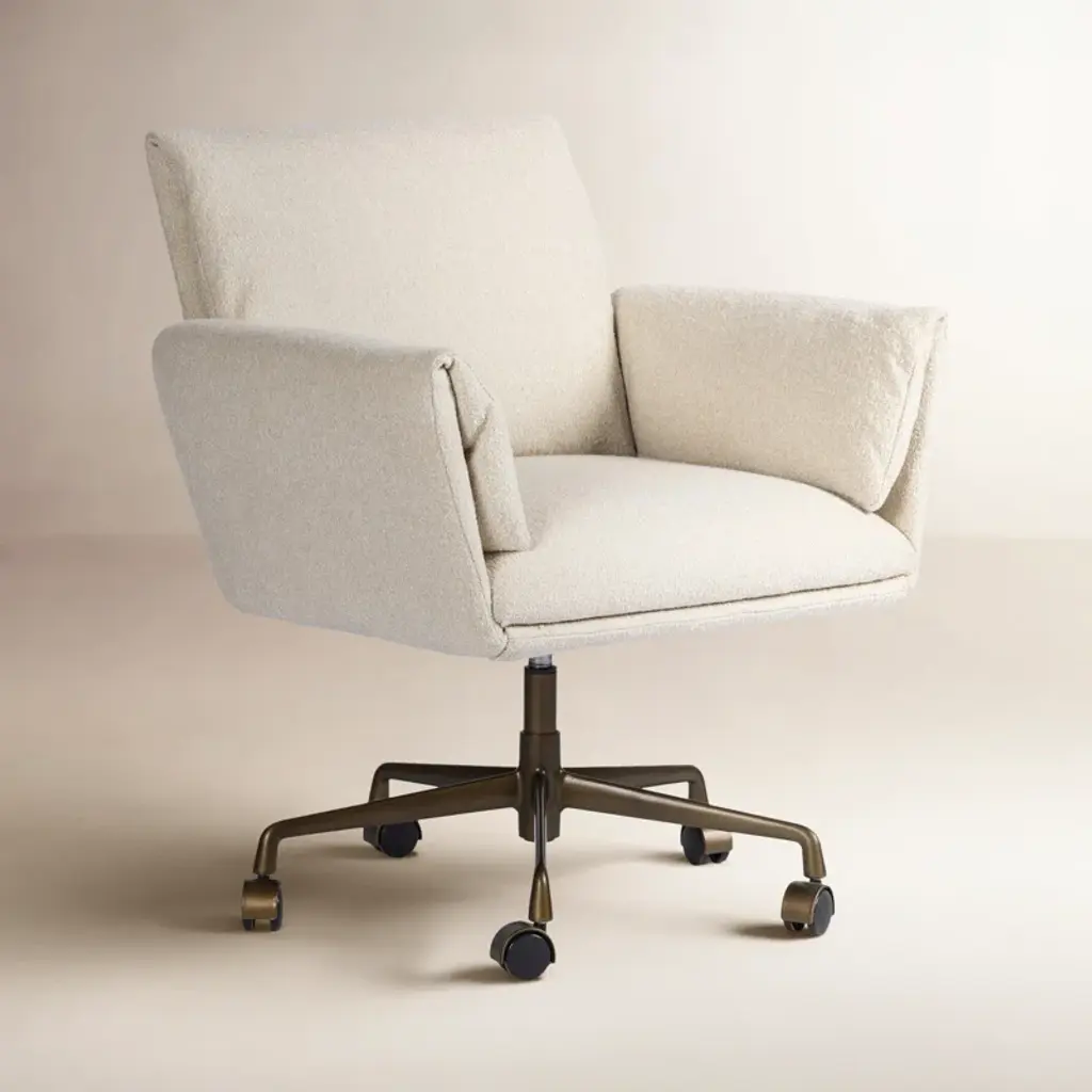 A design collaboration by Amber Lewis and Four Hands. A chair pairs an inviting backrest and fold-over seat. 360-degree swivel feature and rolling casters for effortless mobility.