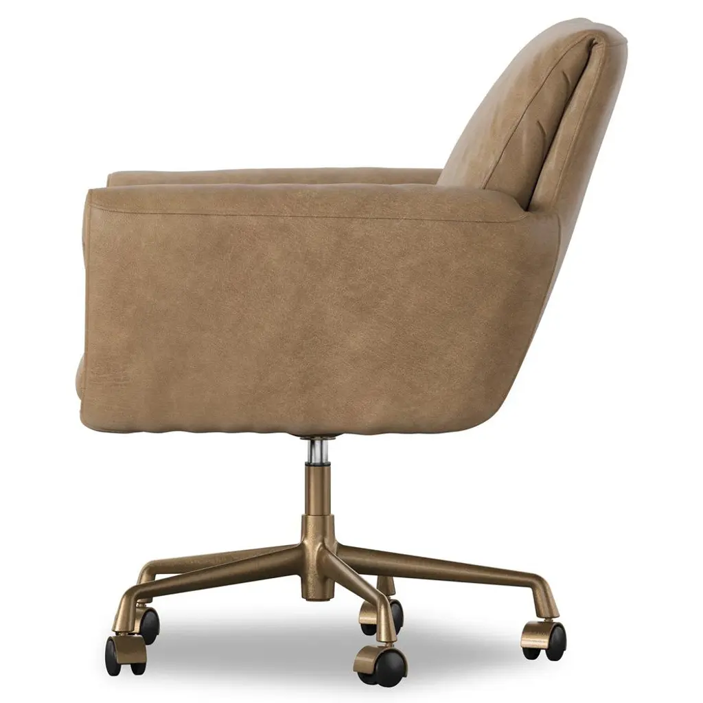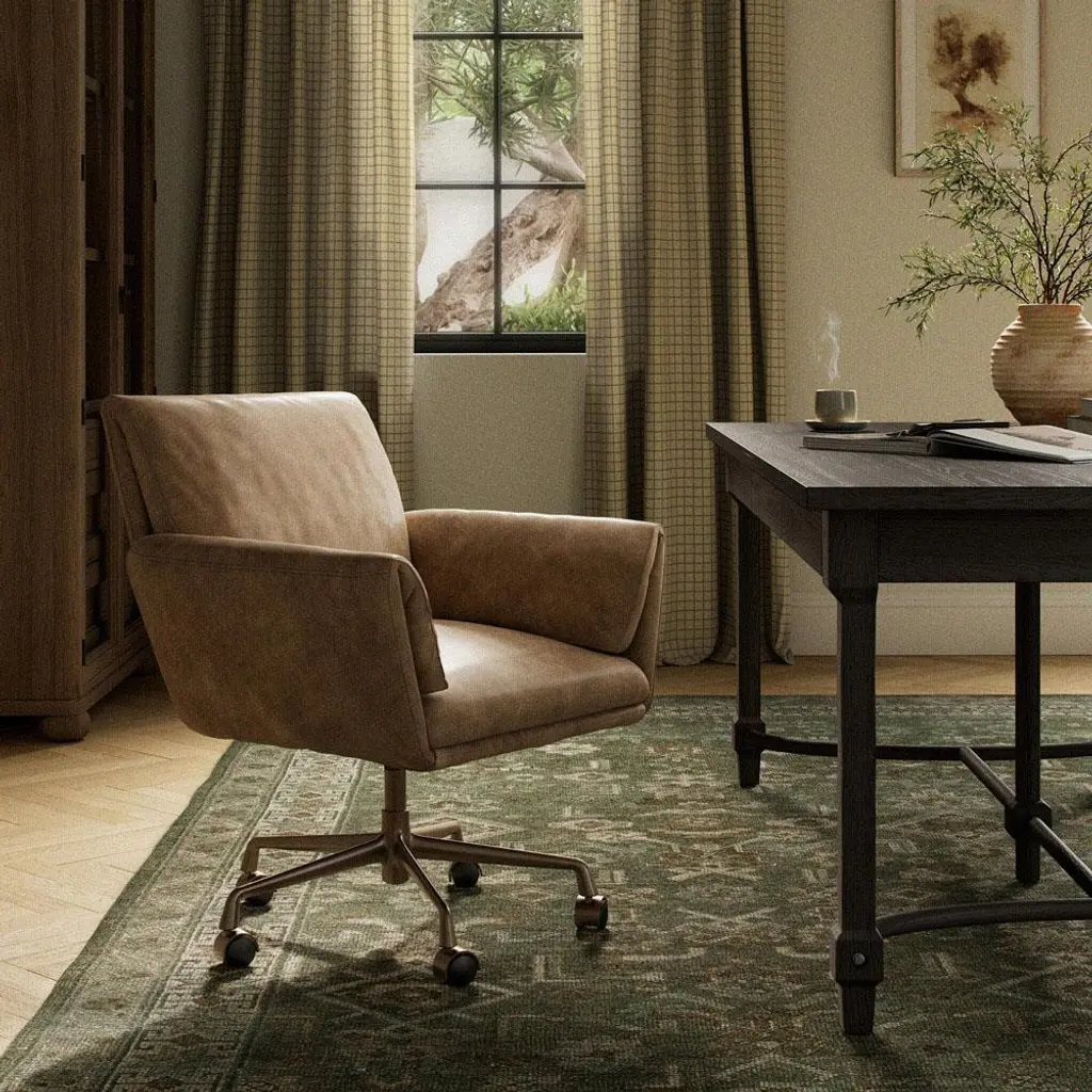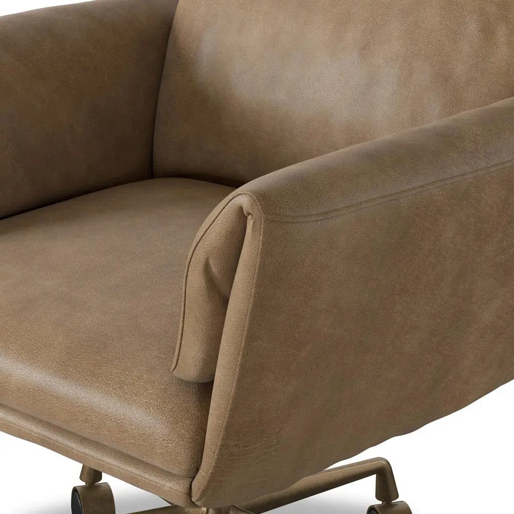 A design collaboration by Amber Lewis and Four Hands. A top-grain leather desk chair pairs an inviting backrest and foldover seat. 360-degree swivel feature and rolling casters for effortless mobility.