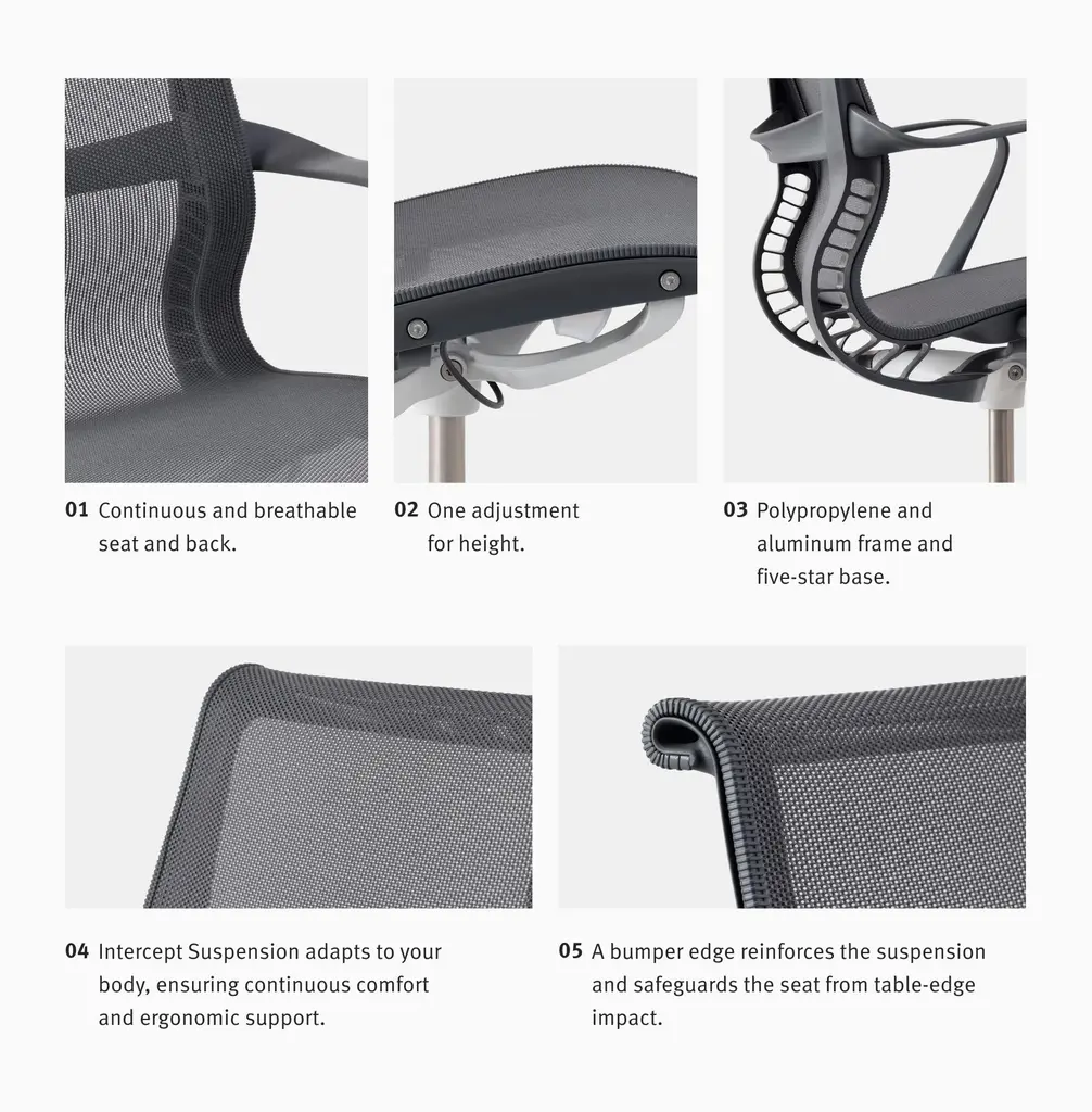 We increasingly expect to be able to work anywhere and everywhere. Designed as a response to our observations that people are spending a lot less time sitting in one spot, this multipurpose office chair provides comfort the second you sit down without requiring any adjustments. Setu is a responsive office chair featuring a Kinematic Spine that intuitively balances resistance and ease. It's simple yet effective design results in an airy, lightweight chair that still supports up to 300 pounds. Eco-Friendly Description: LEVEL Certified and Indoor Advantage Certified. LEVEL® by BIFMA is an evaluation and certification system for environmentally preferable and socially responsible office furniture. The LEVEL program has three performance tiers: LEVEL 1, 2, and 3. The higher the number, the more criteria considered and met across 4 key areas: materials, environmental impact, human health, and social responsibility. Indoor Advantage Gold certification is SCS Global Services’ highest level of indoor air quality performance for furniture. The certification assures that furniture products support a healthy indoor environment by meeting strict chemical emission limits for volatile organic compounds (VOCs).