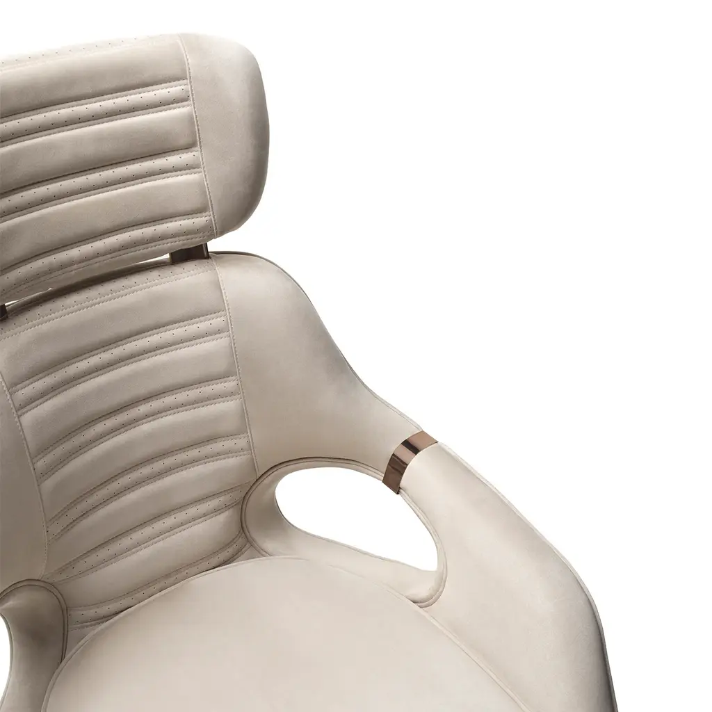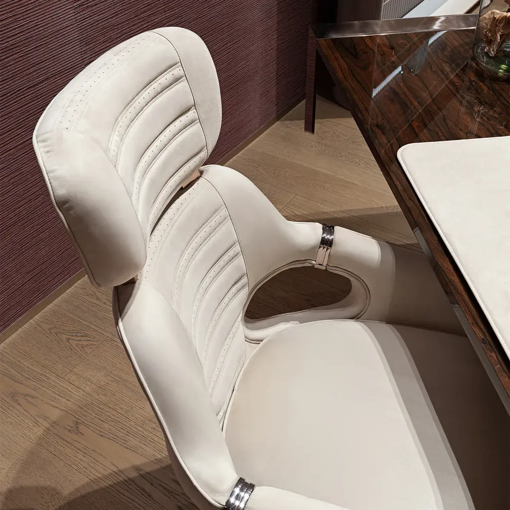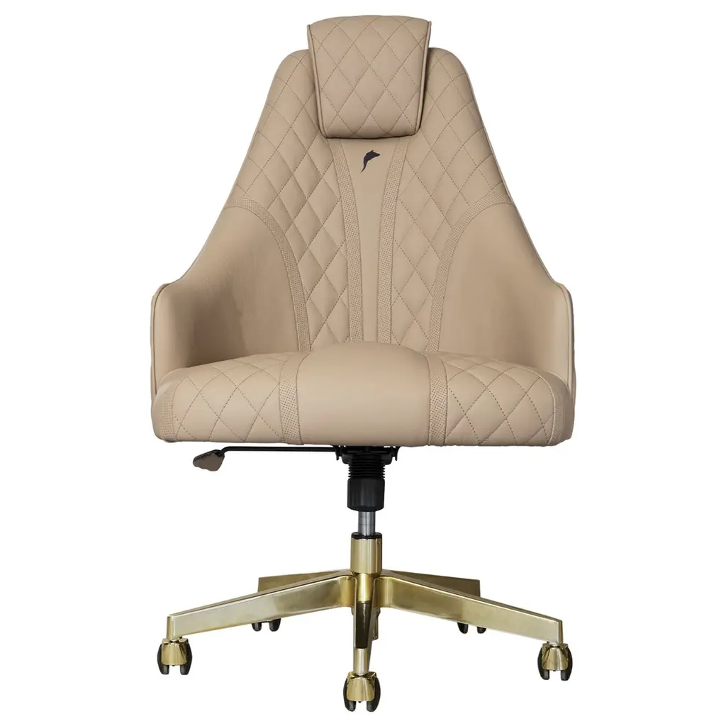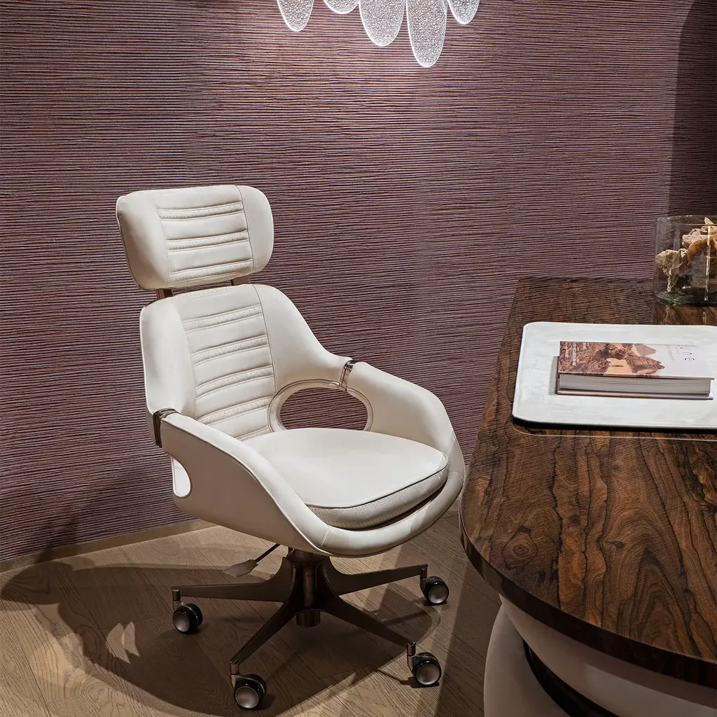 The Stilgar office chair exudes sophistication with its Sean Avorio upholstery and matching pipings. Polished Siena metal accents enhance its refined look, while black nickel leg tips add a modern touch. Designed to blend luxury and functionality, it’s a perfect addition to any executive workspace.