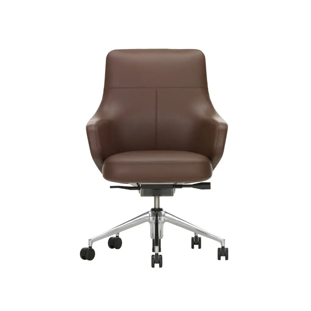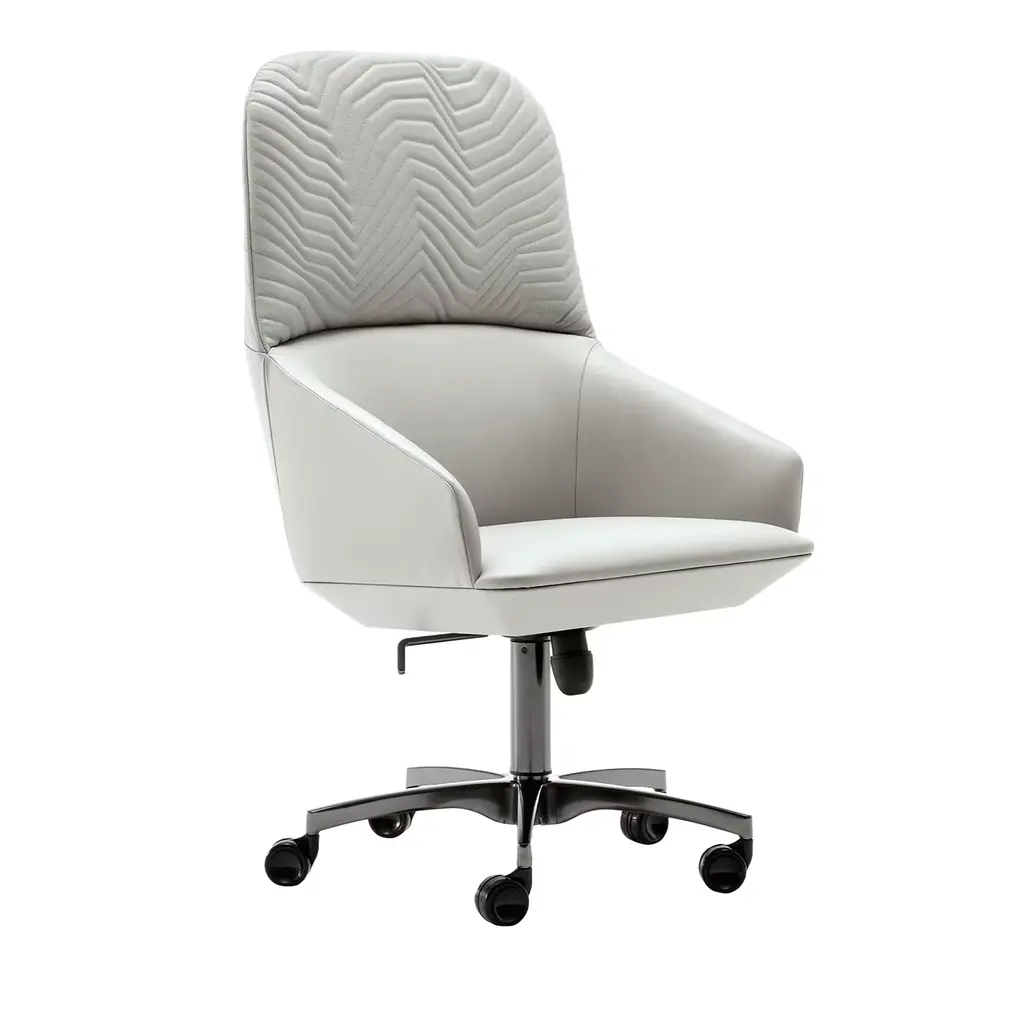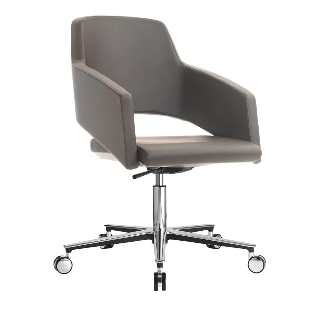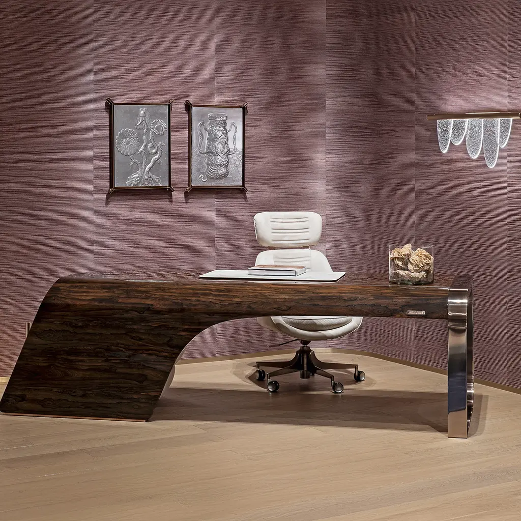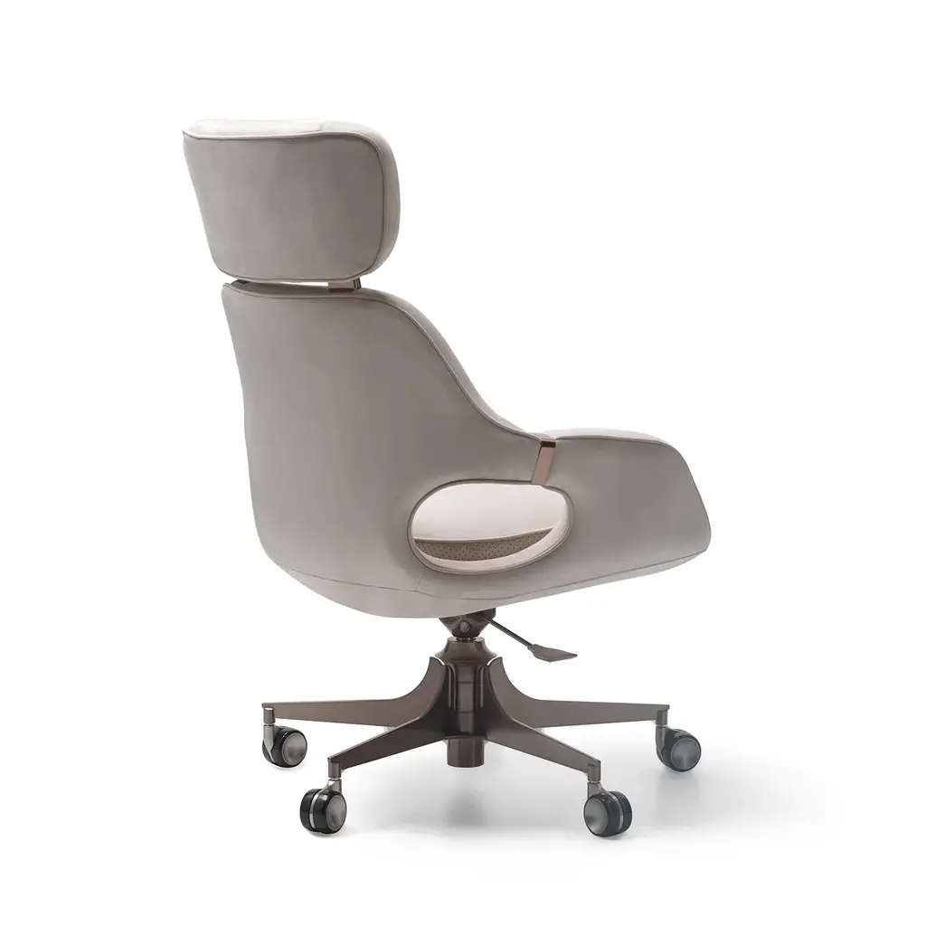 The Stilgar office chair exudes sophistication with its Sean Avorio upholstery and matching pipings. Polished Siena metal accents enhance its refined look, while black nickel leg tips add a modern touch. Designed to blend luxury and functionality, it’s a perfect addition to any executive workspace.