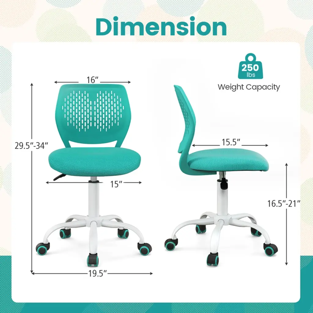 If you are looking for a stylish yet practical study chair for your kid, ours can well suit your demands. The ergonomic backrest perfectly fits kid's body curve and develops good sitting posture. More, 4.5" seat height adjustment is capable of catering to people of different ages and heights. Breathable mesh backrest and seat promote air flow and circulation. Stuffed with high density sponge, the seat cushion offers more comfortable feeling. In addition, reinforced frame, durable PU casters and 5-claw base are all in one chair, with good quality and high reliability.FeaturesErgonomic backrest provides optimal support for kids' back and waist Breathable mesh back and seat keep good air circulation Sponge padded seat cushion for more sitting comfort Height adjustable seat from 16.5" to 21" can fit most desks and ages Simply lift the lever up and down to adjust seat heightSpecifications:Color: Blue / Turquoise / Purple Material: Sponge, Mesh, Metal Overall Dimension: 19.5" x 19.5" x 29.5"-34" (L x W x H) Backrest Size: 16" x 12" (L x W) Seat Size: 15" x 15.5" (L x W) Seat Height: 16.5"-21" Net Weight: 10 lbs Weight Capacity: 250 lbs Package Includes: 1 x Kids Desk Chair 1 x User Guide