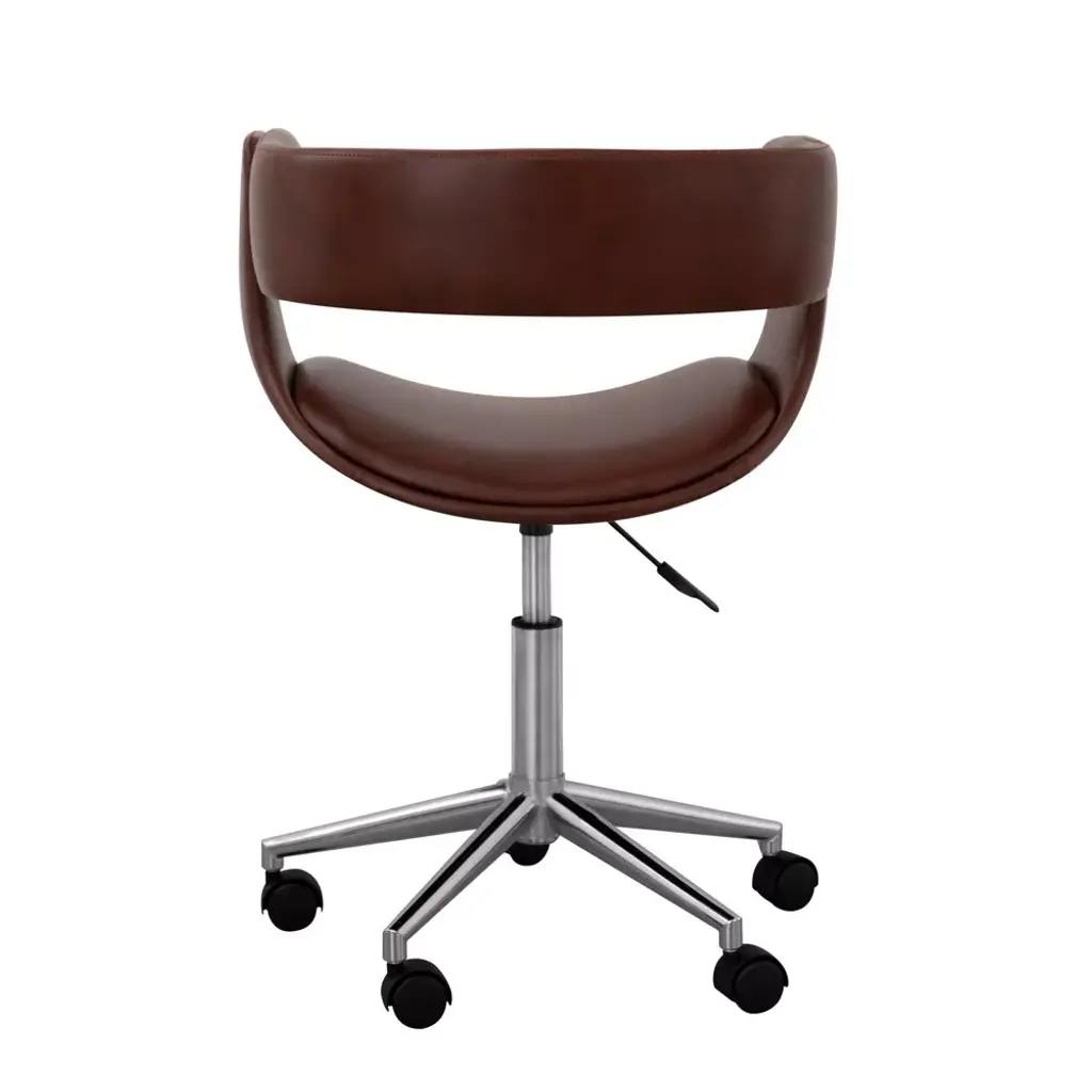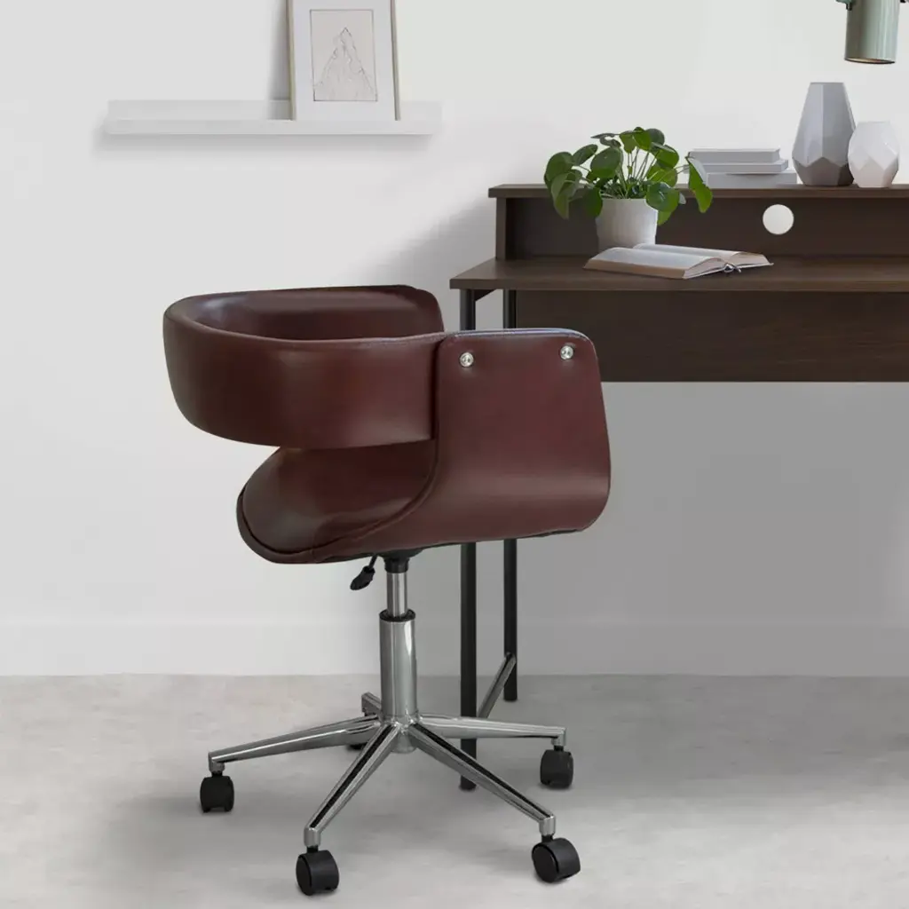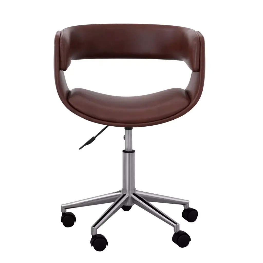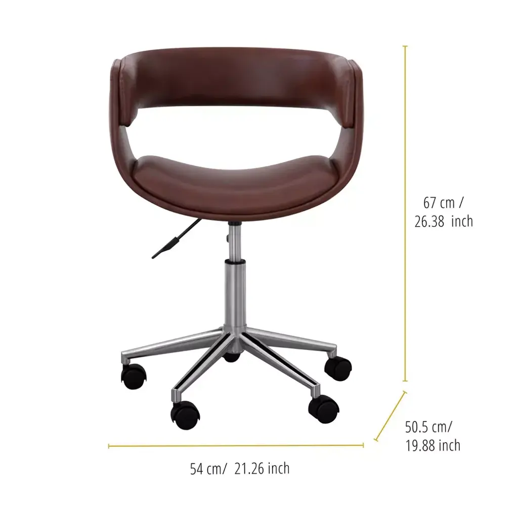 Bring modern comfort into your home with the Teamson Home Modern PU Leather Office Swivel Chair with Wheels. This desk chair features a sleek brown PU leather seat with a polished chrome base for a stylish and comfortable addition to any home office. This mid-back chair is designed with an ergonomic curved upholstered seat and open back to make working long hours more comfortable, and the curved armrests are designed to fit your elbows comfortably. The full 360 degree swivel base with 5 rolling wheels allows the chair to be moved around easily, and the seat adjusts from 26.5" to 29.5" in height to provide comfortable seating at any desk. For quick assembly and easy cleaning, this swivel chair includes step-by-step instructions. The Teamson Home PU Leather Swivel Chair measures 20" x 21.26" x 26.38" to fit in any office space. Teamson is a global lifestyle home designs brand bringing joy into every home through beautiful, quality pieces made for stylishly comfortable everyday living. Teamson Home is our flagship brand continuing our tradition of beautiful high-quality designs including versatile indoor and outdoor furniture, bathroom furniture, indoor and outdoor lighting, and outdoor heating and décor.