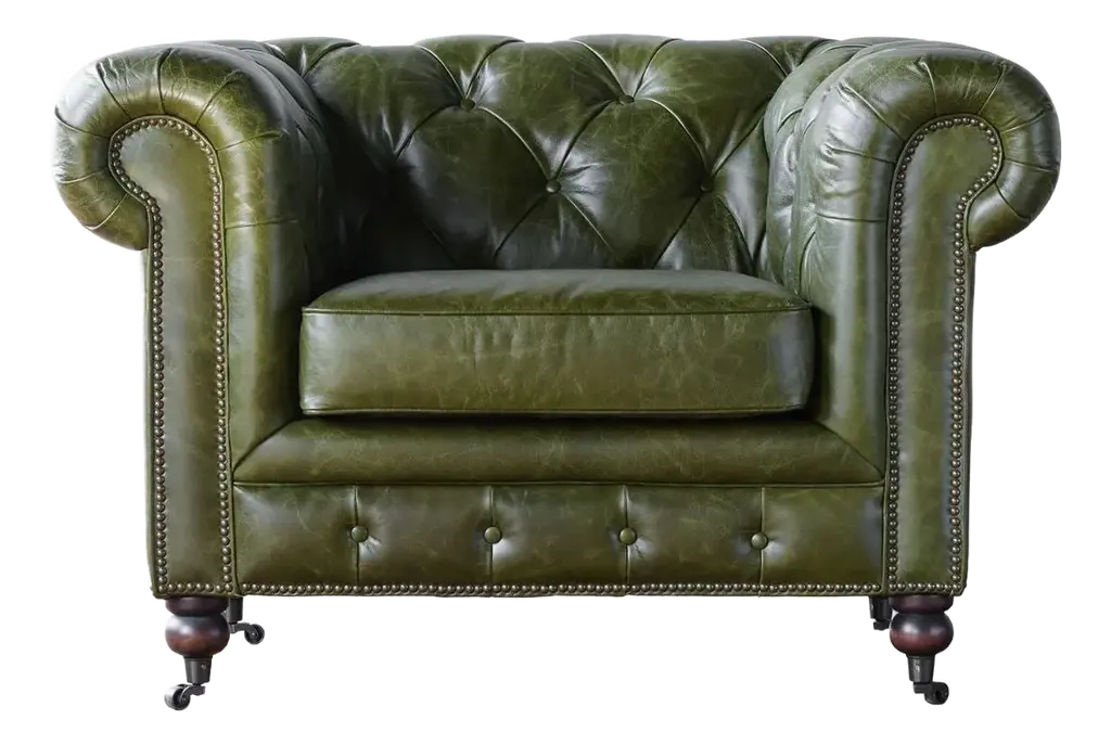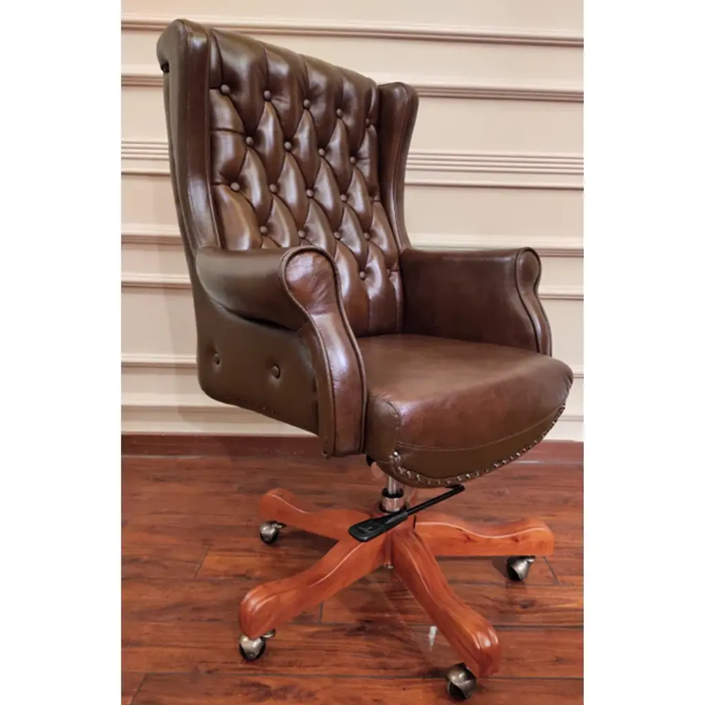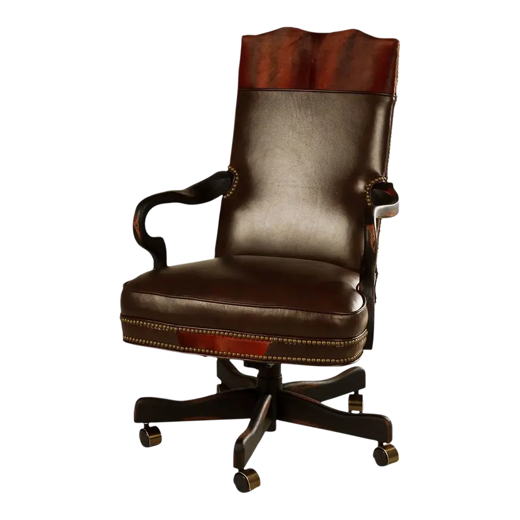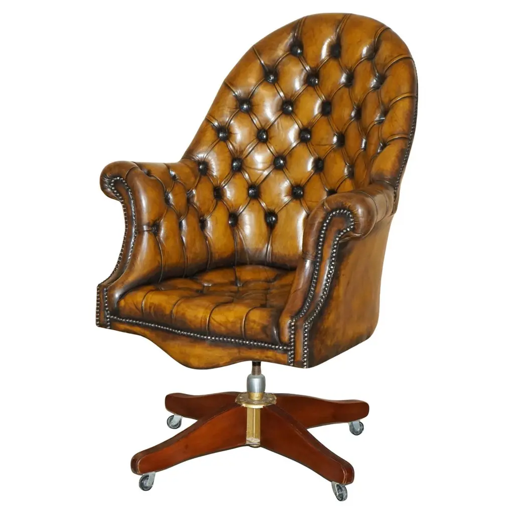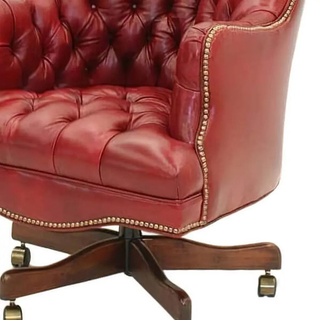 A fine customizable English style tufted Barrel back desk chair with tufted back and seat, an arched backrest with padded and upholstered arms, a shaped front rail with brass nailhead finishing details, a hydraulic lift to raise the seat and a mahogany polished five-legged base on casters.Dimensions: 29" W x 35" D x 42" HSeat height 19"Seat depth 22"Arm height 26"These chairs are customizable. Select from 100's of high-grade leathers and choose your finish and nail head details.Lead time 6 - 8 weeks.Pricing is based on a standard leather upholstered option as pictured.