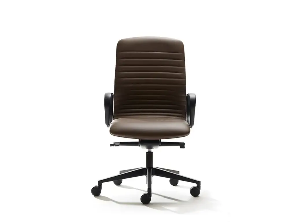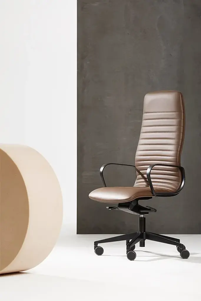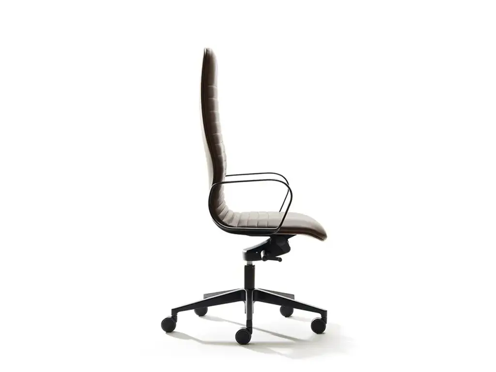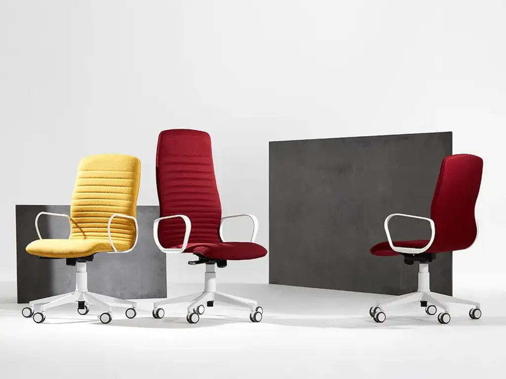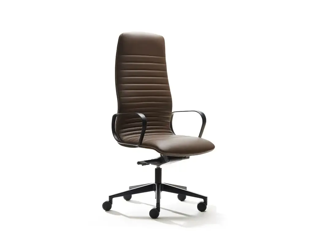 Union Executive is a high-back, reclining armchair with swivel and elevating seat, fixed armrests in metal or aluminum tube and aluminum base and Ø65 rubber wheels. Shell with quilted padding.Available with:- central fulcrum oscillating mechanism- advanced fulcrum swing mechanismUpholstery in fabric or leather.ArmrestsU3 | Aluminium armrests and base.U5 | Steel armrests.CERTIFICATIONSEN 1335
