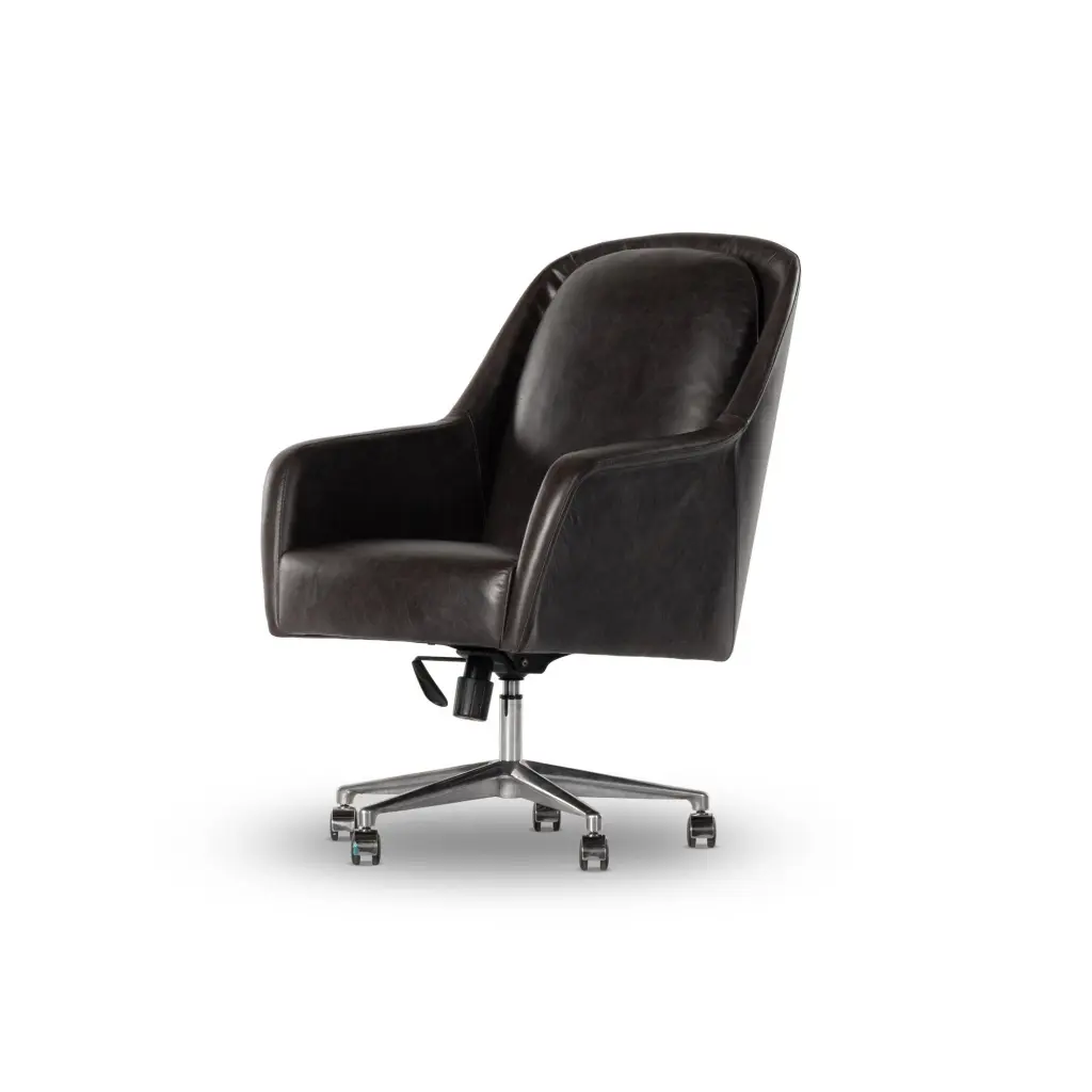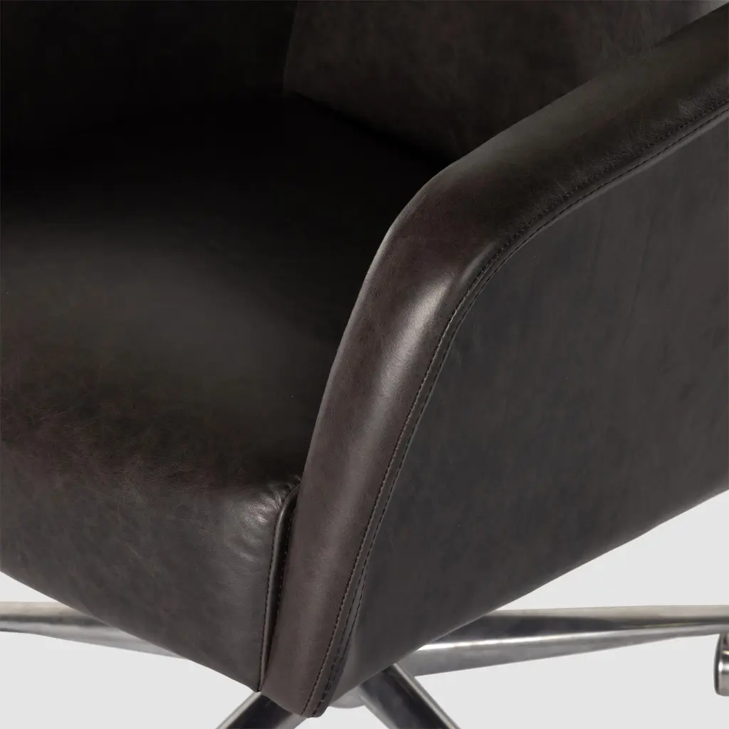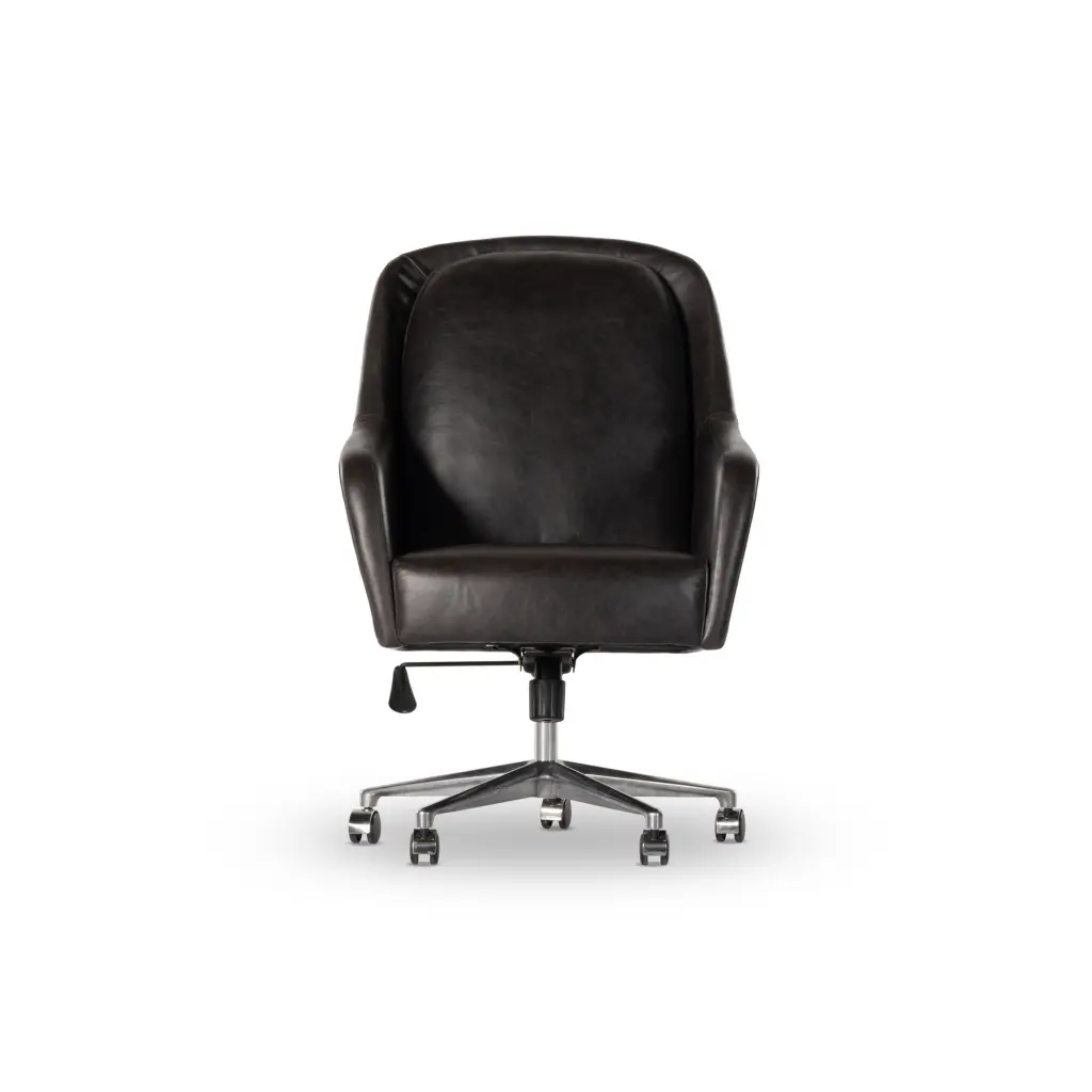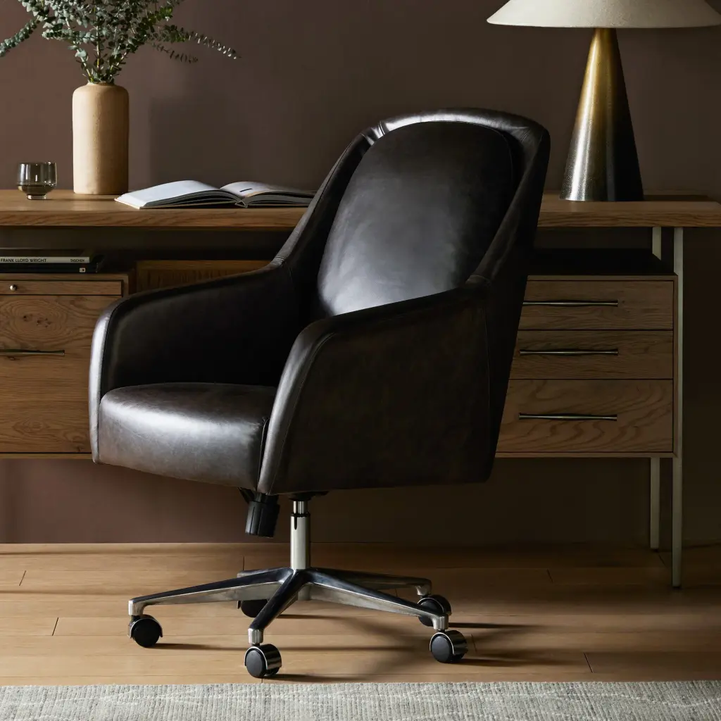 Fully upholstered in black top-grain leather, this desk chair brings an executive look to the office, finished with a 360-degree swivel atop casters. The Verne collection also includes a fabric desk chair (sold separately).