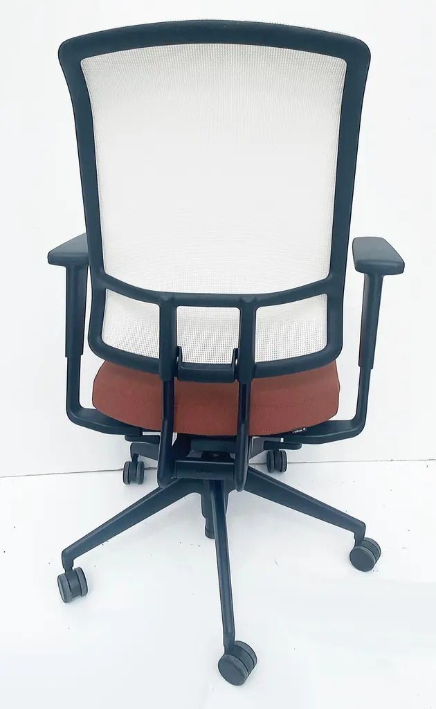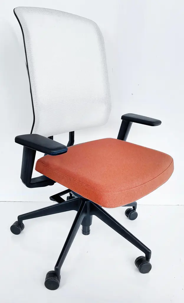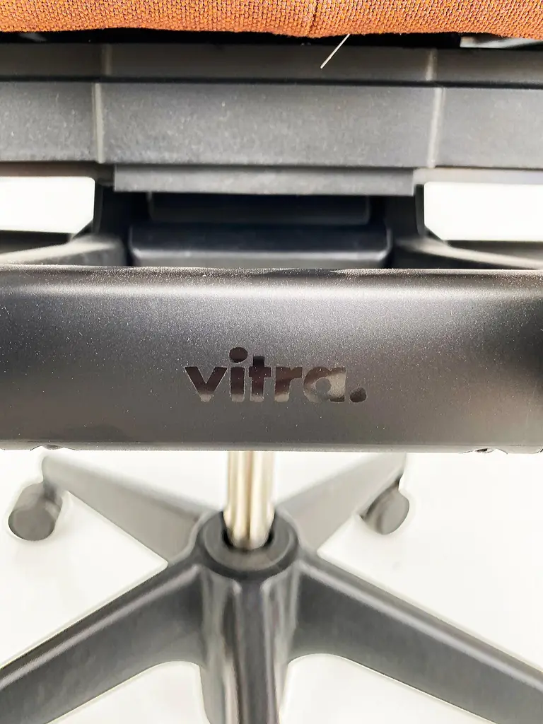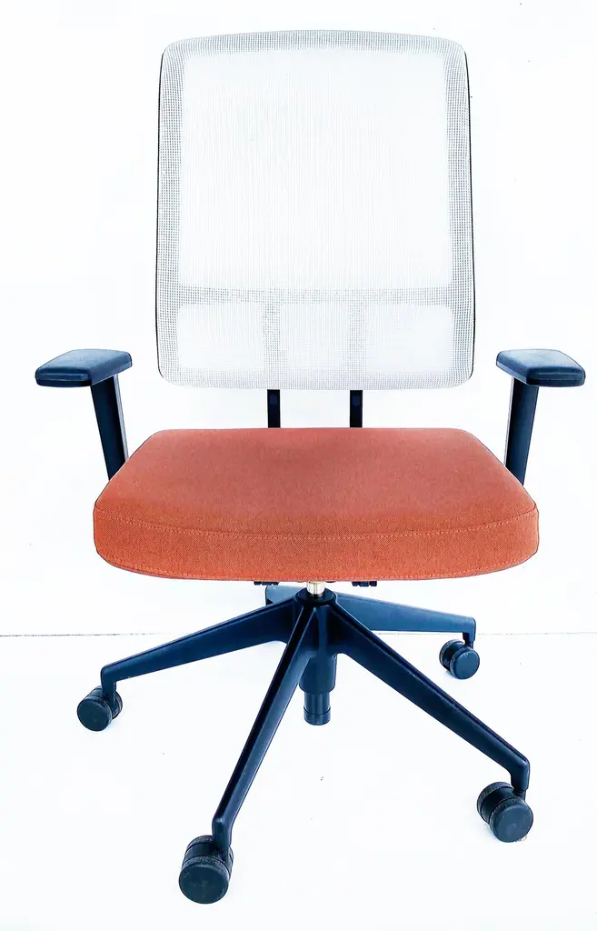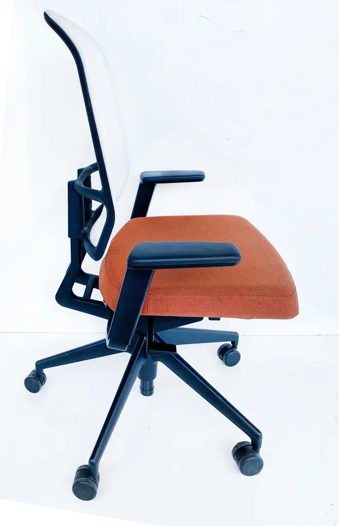 Vitra AM Fully Adjustable Ergonomic Office Chairs by Alberto Meda 2021Offered for sale individually are six Vitra AM fully adjustable, ergonomic office chairs designed by Alberto Meda and manufactured by Vitra in Germany. They are priced per chair. Two of the six are upholstered in orange and 4 are upholstered in brown.These chairs are fully adjustable including seat height and width. These are from an office that was open less than a year. They are contemporary office chairs with rust-colored upholstered seats, white mesh backs & black frames, and swivel black metal bases with casters. Additionally, they have adjustable back lumbar supports and adjustable armrests. They are offered individually.