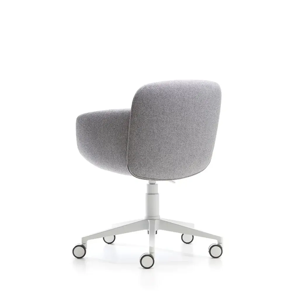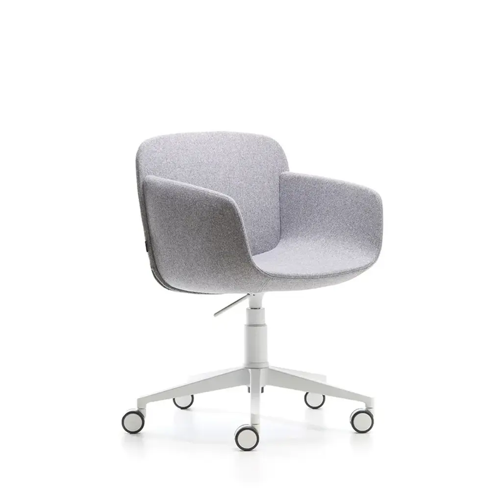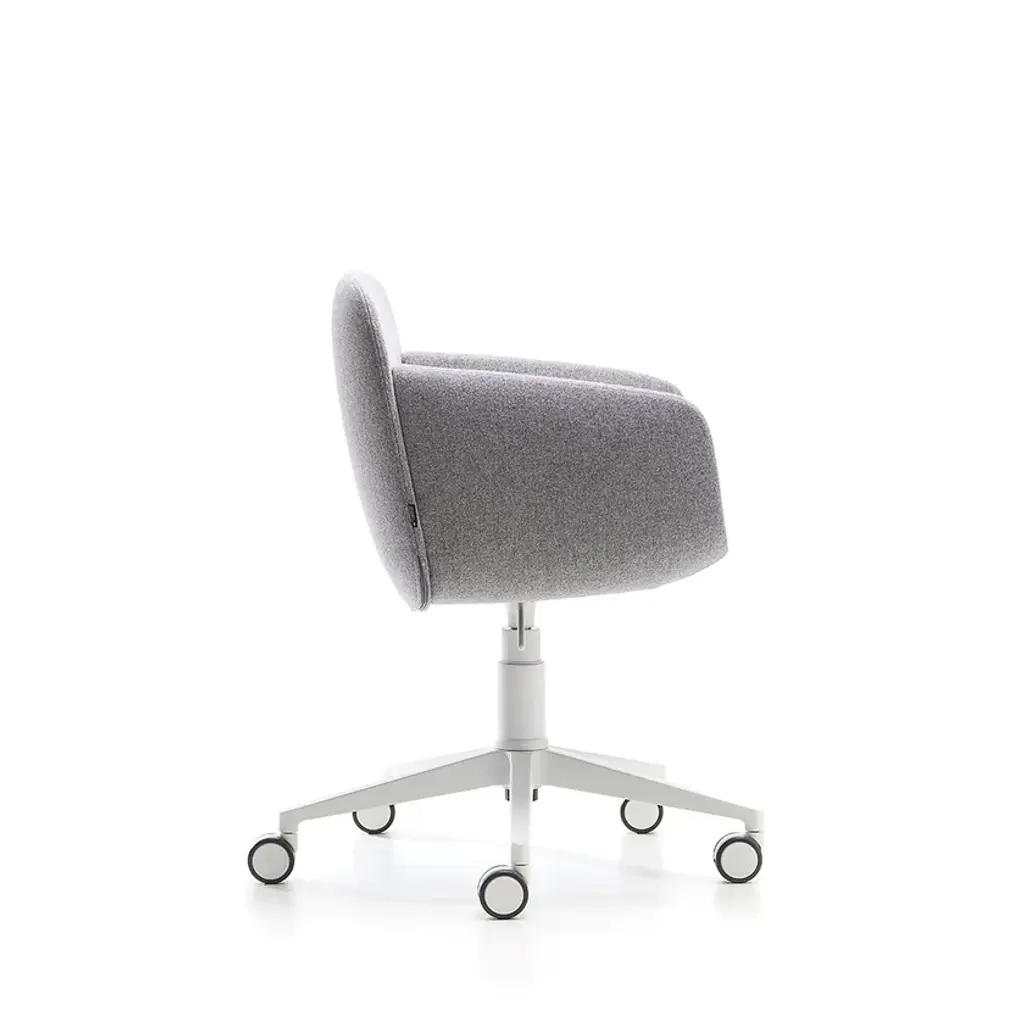 Viva is a low back armchair, swivel and height adjustable seat, fixed upholstered armrests, rubber castors and 5 Stars aluminium base. Upholstery in fabric or leather.CERTIFICATIONSEN 16139 / EN 1022 / EN 1728