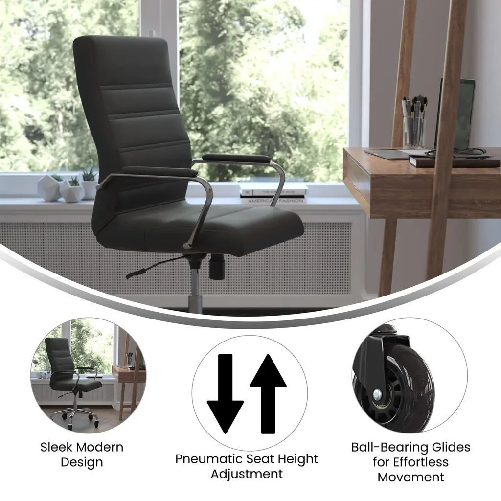 Comfort and style abound in this high-back LeatherSoft office chair with a complementary frame and updated ball-bearing roller style wheels making it the perfect seating solution for your workspace. Crafted from premium materials, the ergonomic design brings a sleek look with ample durability and support for long-term use. Designed for exceptional comfort, this computer desk chair features a LeatherSoft upholstered, cushioned seat and back with padded arms for additional comfort. Horizontal stitching along the seat and back adds a touch of refinement that appeals in any space. The high-back office chair features extended height to support your upper back and help relieve back tension. A waterfall front seat edge removes pressure on your lower legs. Complete your custom fit with the pneumatic seat height adjustment lever and a tilt-lock mechanism for a rocking and reclining motion. Easily maneuver through a variety of tasks with the full 360-degree swivel seat atop transparent polyurethane roller style wheels with smooth ball-bearing motion. The classic styling pairs effortlessly with any office decor style, creating a comfortable and elegant impression that's perfect for residential or corporate workspaces.