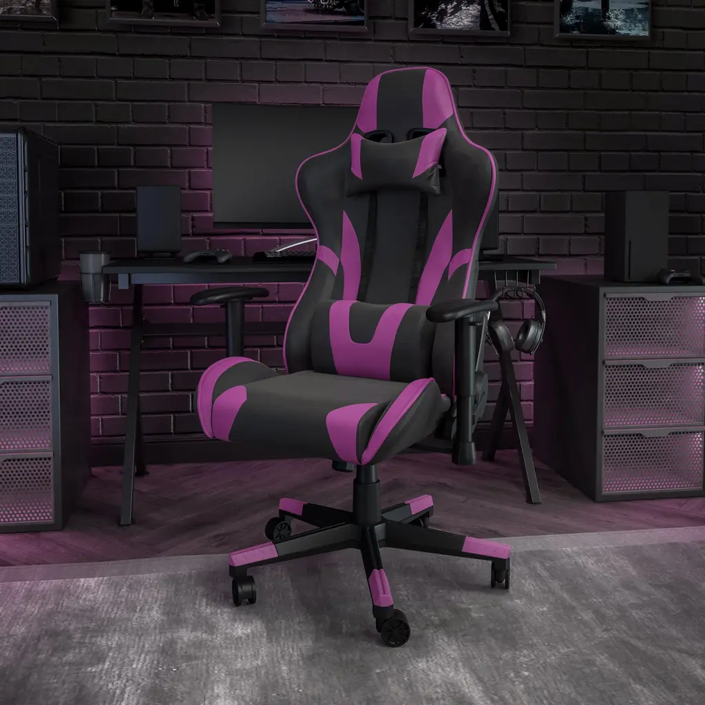 Gear up for game day any day of the week at your gaming computer desk or TV whenever you pull out this racing gaming chair. Designed to give you the ultimate gaming experience this computer game chair has a reclining back with adjustable lumbar support. If you need support, you have a headrest pillow and lumbar pillow that are adjustable and can be removed by unsnapping while the adjustable pivot arms offer pressure relief from your upper body. Gamers need ergonomic office chairs that'll keep them comfortable for many hours and this reclining gaming chair with adjustable lumbar support will provide optimal support. There's a separate lever to recline the back 87° ~ 145° while the lever underneath the seat controls the seat height and locks the chair in an upright position. You'll enjoy endless hours playing your favorite video games on this ergonomic PC chair. Now this is the way to get your game on, relaxed and reclined in your desired position. Whether you need to lean back just a little or a lot this adjustable back office chair has your back. Complete your gaming experience with our red gaming ergonomic desk with cup holder and headphone hook or black gaming desk with cup holder, headphone hook, and monitor/smartphone stand.