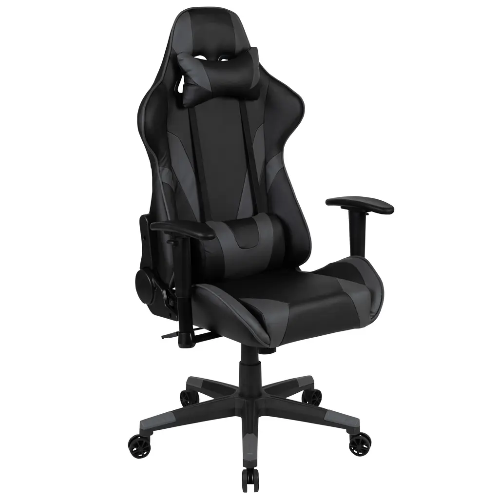 Surpass your game achievements when you are seated comfortably atop this racing gaming chair with extended footrest to properly elevate your feet. Designed to give you the ultimate gaming experience this computer game chair has a reclining back with adjustable lumbar support. If you need support, you have a headrest pillow and lumbar pillow that are adjustable and can be removed by unsnapping while the adjustable pivot arms offer pressure relief from your upper body. Gamers need ergonomic office chairs that'll keep them comfortable for many hours and this reclining gaming chair with adjustable lumbar support will provide optimal support. There's a separate lever to recline the back 87° ~ 145° while the lever underneath the seat controls the seat height and locks the chair in an upright position. You'll enjoy endless hours playing your favorite video games on this ergonomic PC chair. Enjoy a good game after work to release the stresses of the day. Slide the footrest out by pulling the loop then flipping the footrest up. Whether you need to lean back just a little or a lot this adjustable back office chair has your back. Complete your gaming experience with our red gaming ergonomic desk with cup holder and headphone hook or black gaming desk with cup holder, headphone hook, and monitor/smartphone stand.