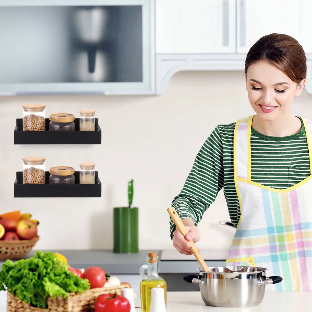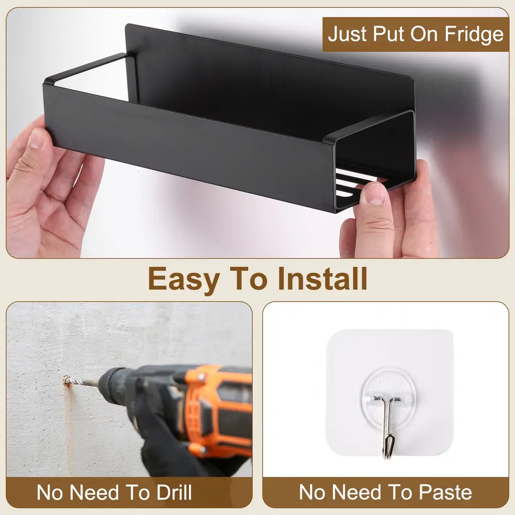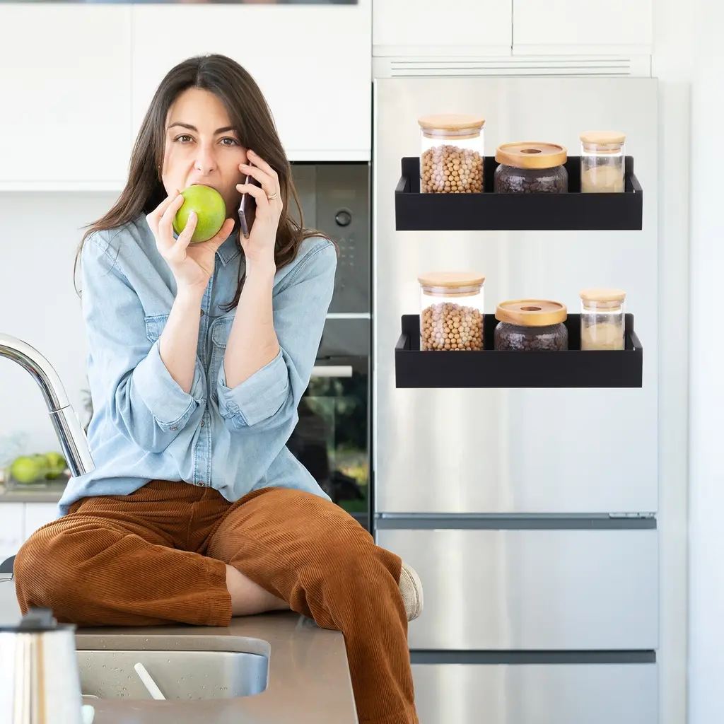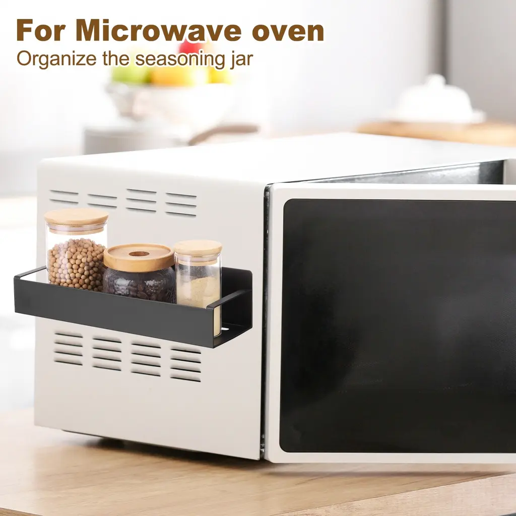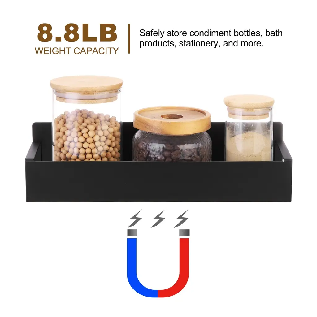 Description:QUALITY MATERIAL - Our magnetic spice racks are made of sturdy iron materials, with a black matte finish, rust-proof, waterproof, stable, and durable. They keep spices conveniently within reach and keep your kitchen looking organized. Hollow-out bottom design, ventilation, moisture-proof; Smooth rounded corner design to prevent collision.MULTI-PURPOSE MAGNETIC SHELF - The spice rack organizer is designed with a solid magnetic to hold up to 8.8 lbs of storage weight. Just stick it on the side of the refrigerator door, microwave, oven (or other metal surfaces) won't move or fall off easily. You can adjust the distance between the shelves according to your needs.EASY TO INSTALL - The magnetic spice organizer does not require drilling or assembly. You can stick the magnet spice rack to the fridge or the side of other metal surfaces. They are easy to adhere to and adjust placement as needed, even if they hold a lot of bottles and don't move out of place. They make the most of space around the refrigerator and microwave to keep your countertops tidy and unclutteredEASY TO CLEAN AND SAVE SPACE - Our magnetic spice rack for refrigerators possess a smooth surface that is resistant to oil and dust, making it easy to clean. Rinse it with water or wipe it with a damp cloth for easy cleanup. WIDELY USED - The magnetic spice rack suits refrigerators, microwave ovens, coffee makers, washing machines, dryers, or other metal surfaces.Specification:Color: Black Small Magnetic Spice: 27x8.5x7.2cm/10.6x3.3x3 inches (L*W*H)Large Magnetic Spice: 29.5x9.5x7.2cm/11.6x3.7x3inches (L*W*H)Package Content: 2pcs including 1pcs Small Magnetic Spice and 1pcs Large Magnetic Spice