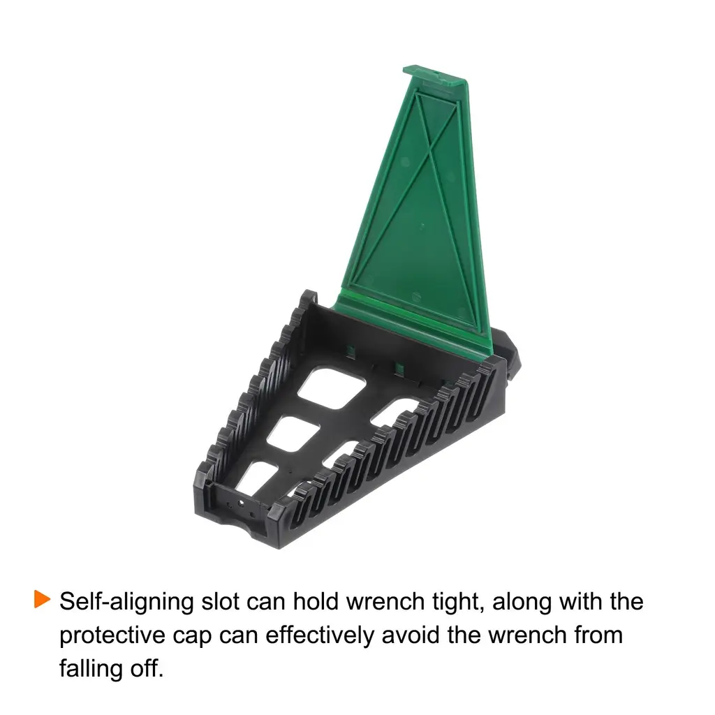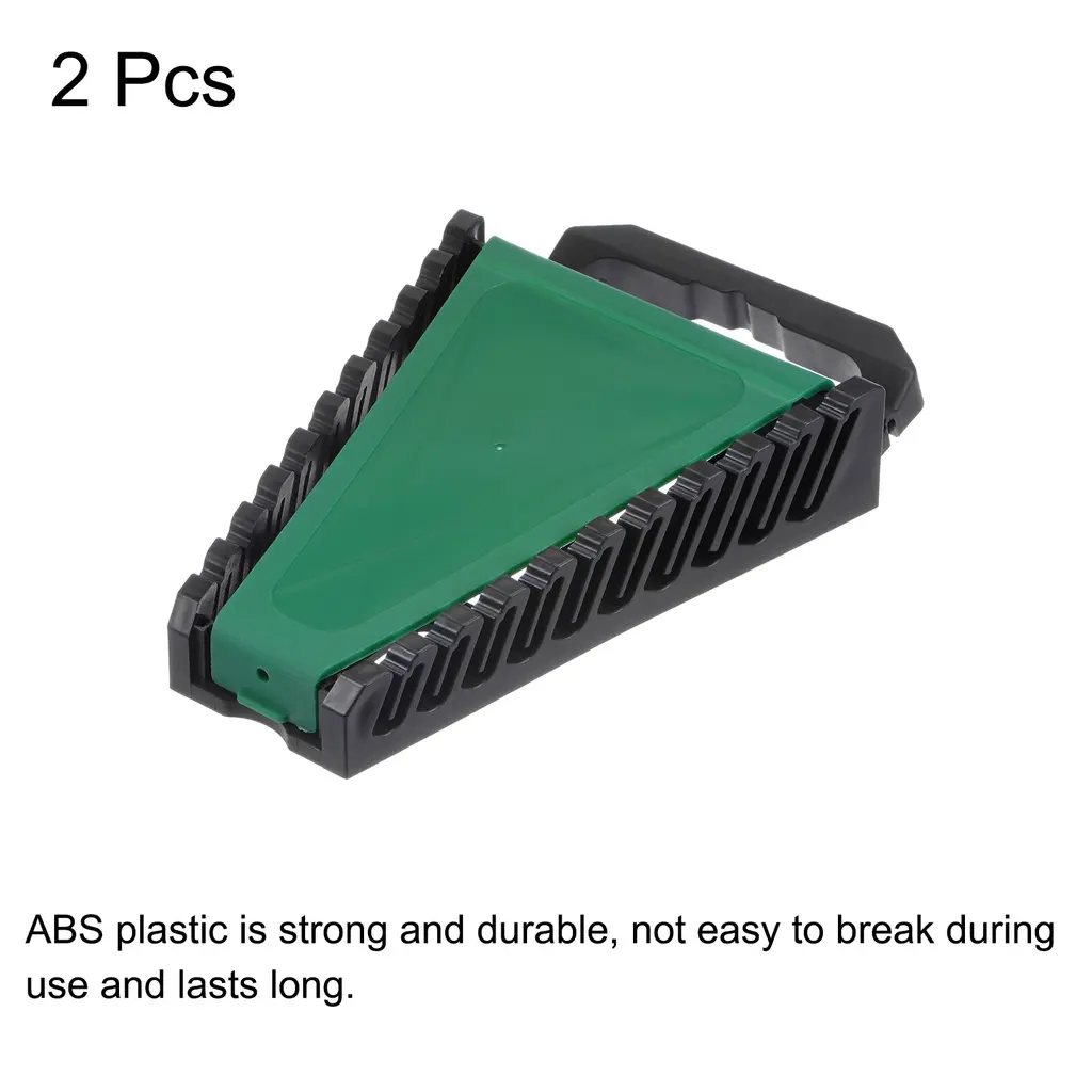 Size - Total Size: 175mm x 130 mm / 6.9" x 5.1" (L*W), Slot Quantity: 10.Material - Made of ABS plastic, which is strong and durable, not easy to break during use and lasts long.Feature - Self-aligning slot can hold wrench tight, along with the protective cap can effectively avoid the wrench from falling off.Application - Great tool for carpenters, woodworkers, electricians, machinists, master technicians, mechanics, painters, and anyone working on home improvement projects, cleaning and more.Package Content - 2 piece of wrench organizer with multi slots for organizing SAE or metric wrench.Multi slots of various sizes to organize SAE or metric wrench, you can find all your wrench at one glance in the tools.ABS plastic is strong and durable, not easy to break during use and lasts long.Self-aligning slot can hold wrench tight, along with the protective cap can effectively avoid the wrench from falling off.Portable design, foldable handle for easy carrying and storing with less space.Great tool for carpenters, woodworkers, electricians, machinists, master technicians, mechanics, painters, and anyone working on home improvement projects, cleaning and more.Notice: Please keep the wrench rack stay away from fire.
