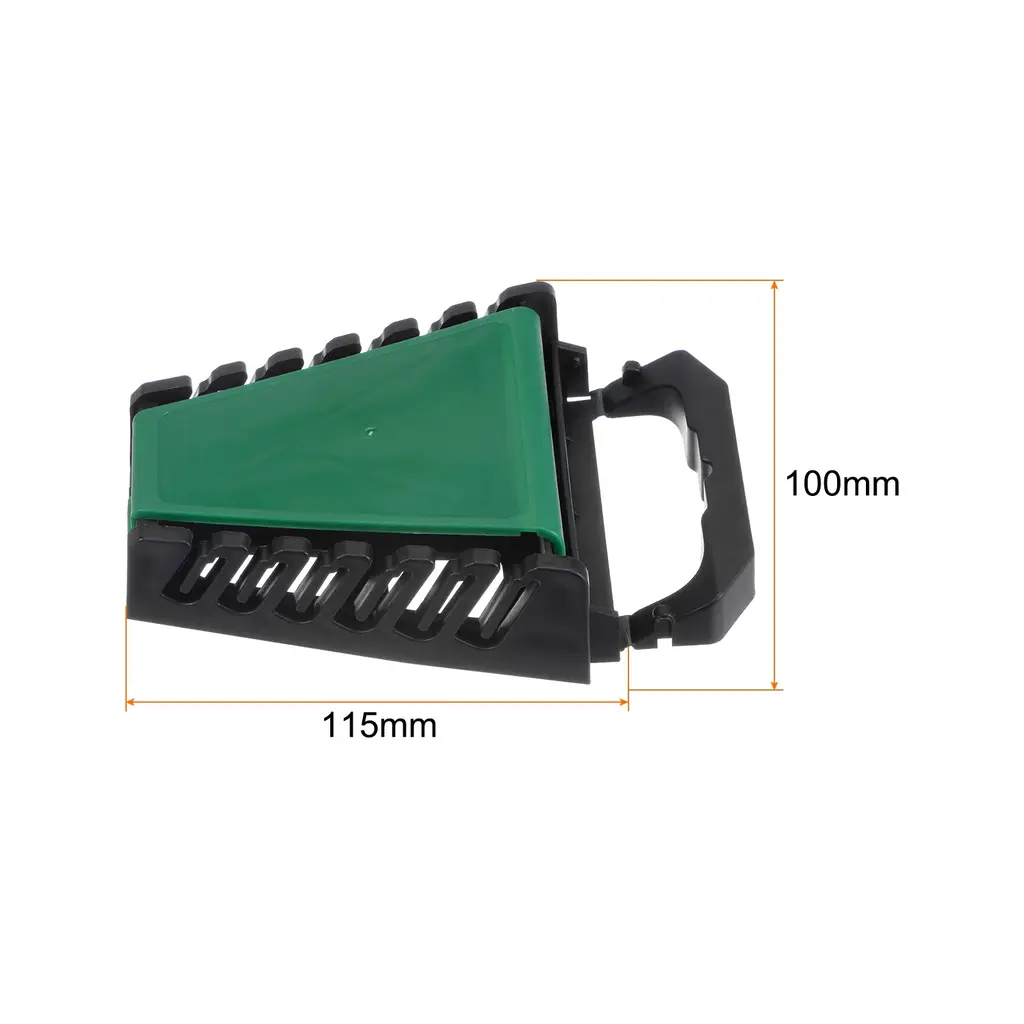 Size - Total Size: 115mm x 100 mm / 4.5" x 3.9" (L*W), Slot Quantity: 6.Material - Made of ABS plastic, which is strong and durable, not easy to break during use and lasts long.Feature - Self-aligning slot can hold wrench tight, along with the protective cap can effectively avoid the wrench from falling off.Application - Great tool for carpenters, woodworkers, electricians, machinists, master technicians, mechanics, painters, and anyone working on home improvement projects, cleaning and more.Package Content - 2 pieces of wrench organizer with multi slots for organizing SAE or metric wrench.Multi slots of various sizes to organize SAE or metric wrench, you can find all your wrench at one glance in the tools.ABS plastic is strong and durable, not easy to break during use and lasts long.Self-aligning slot can hold wrench tight, along with the protective cap can effectively avoid the wrench from falling off.Portable design, foldable handle for easy carrying and storing with less space.Great tool for carpenters, woodworkers, electricians, machinists, master technicians, mechanics, painters, and anyone working on home improvement projects, cleaning and more.Notice: Please keep the wrench rack stay away from fire.
