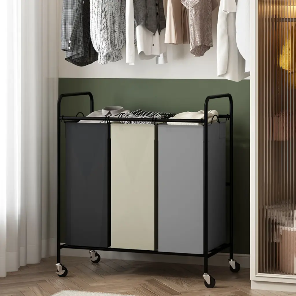 Laundry Hamper Cart: Simplifies laundry organization and enhances your home's tidiness.Highlights at a Glance:- Spacious Capacity: Each bag holds 40 liters, perfect for efficient organization of laundry and items.- Durable Bags: Made from strong non-woven material for long-lasting use and easy maintenance.- Easy Mobility: Features smooth-rolling, lockable wheels for effortless movement between rooms.- Ergonomic Handles: Detachable bags with sturdy metal handles for easy transport.- Effortlessly sort dark from light and separate adults' clothes from kids'.- Easy Assembly: Quick setup in under ten minutes with straightforward instructions.Specification:Shape: RectangularMaterial: Polyester + IronBag Capacity: 40L Each Bag3 Section Laundry Sorter Size: 30 x 16 x 34.6 inches2 Section Laundry Sorter Size: 19.7 x 15.7 x 32.7 inchesPacking List:1 x Rolling Laundry HamperFriendly Note:1. Assembly: Follow the included instructions carefully for easy assembly. Ensure all parts are secure before use.2. Weight Limit: Each laundry bag can hold approximately 11-17.6 pounds. Do not exceed this weight to maintain the sorter’s integrity.3. Mobility: Utilize the lockable wheels to secure the laundry sorter in place when stationary. For easy transport, ensure wheels are unlocked.