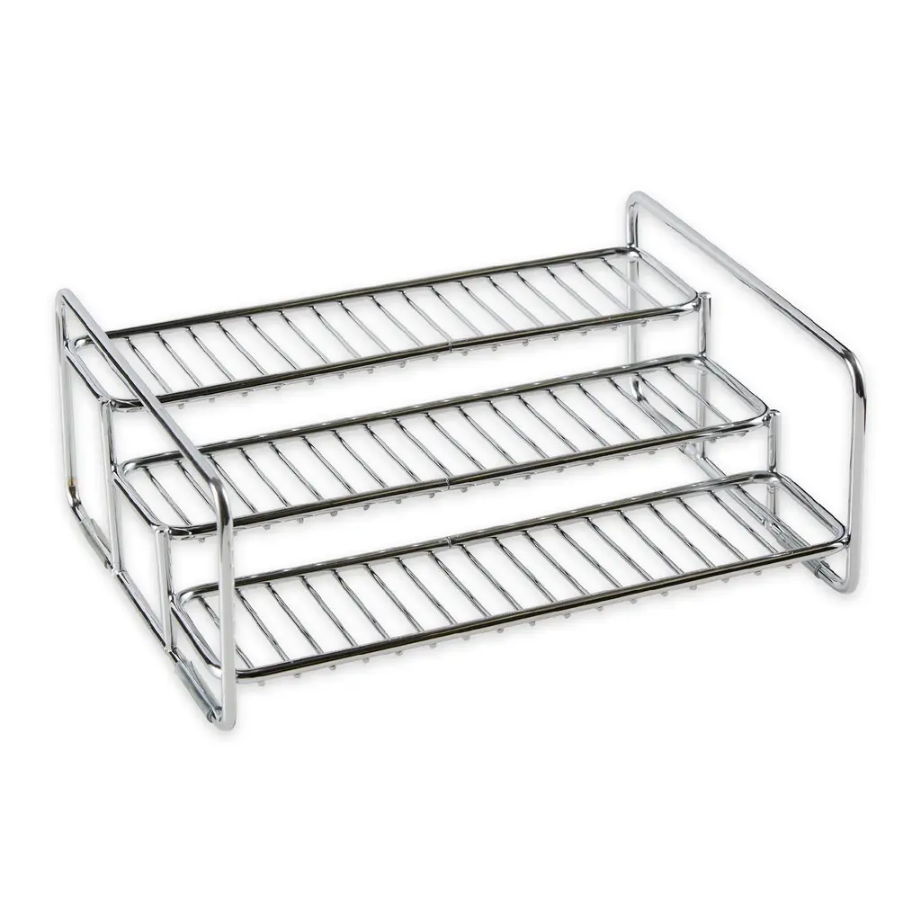 Rack measures 11 x 8.5 x 4.375-inches. Three-tier design can hold multiple cans, jars, and bottles on each shelf. Perfect for your pantry or kitchen countertop, this rack provides additional storage and organization. Fits in most kitchen or pantry spaces. Staggered tiers allow you to see individual items on each shelf. Chromed steel frame is sturdy enough for heavy cans and jans. This rack is easy to clean and is built to last. Wipe with damp cloth to clean or hand wash if necessary.