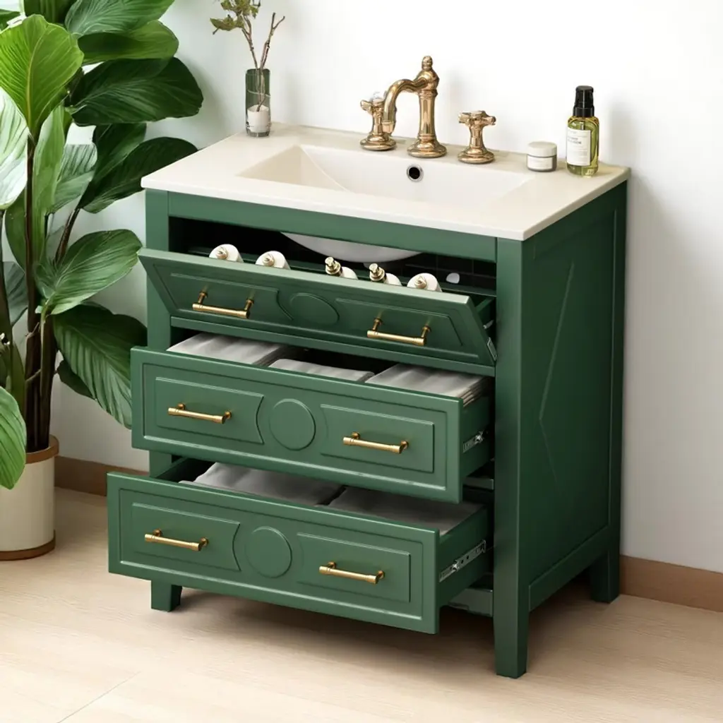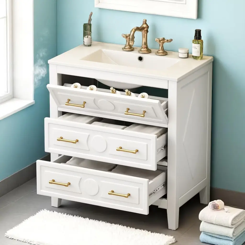 30" Bathroom Vanity With Ceramic Sink, 3 Drawers, Solid Wood Frame,retro Cabinet, Pre-drilled For 4" Faucet, Storage Organizer