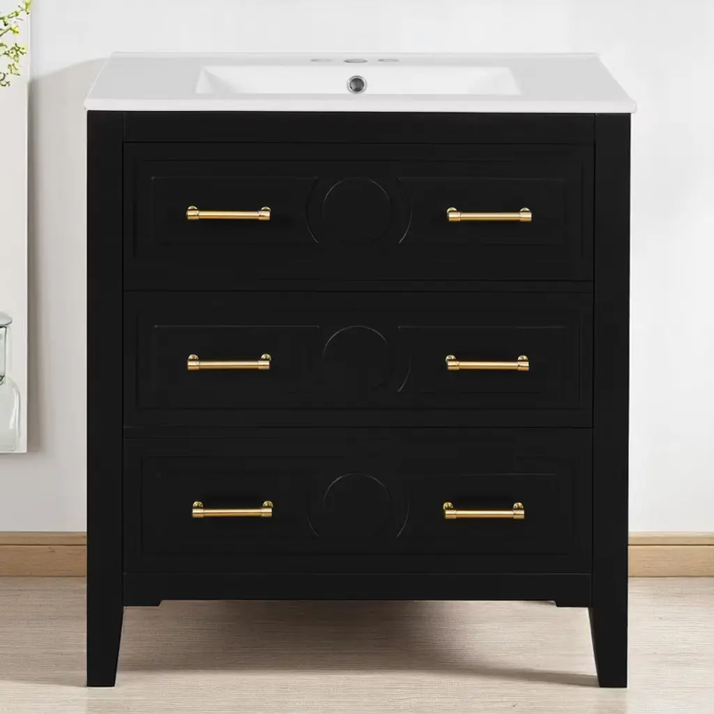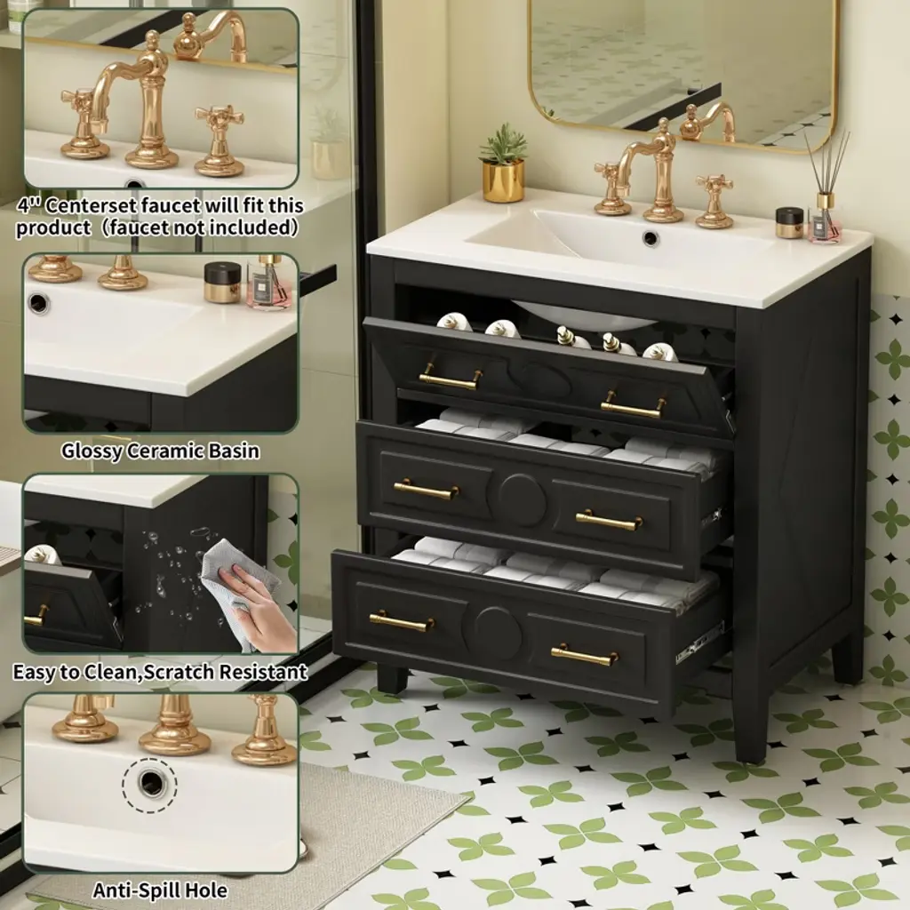 Product OverviewElevate your bathroom with this 30-inch retro-style vanity, thoughtfully designed for both elegance and utility. Featuring a solid pine wood frame and high-quality MDF board construction, this cabinet ensures strength and durability. A glossy ceramic sink with a pre-drilled 4"" centerset faucet mount (faucet not included) tops the unit, delivering timeless style with modern convenience. With its classic black finish, carved detailing, and gold metal handles, this piece brings a refined charm to any space.Product FeaturesSolid Wood Structure & Glossy Ceramic Basin: Constructed with a solid pine wood frame, high-grade MDF drawers, and a ceramic sink that’s easy to clean and highly durable for long-term daily use.Ample Concealed Storage: Three spacious drawers offer generous storage for toiletries, towels, and bathroom essentials while keeping items free from dust and water exposure.Elegant Classical Design: Black carved cabinet body paired with elegant gold metal handles creates a luxurious and retro atmosphere that enhances any bathroom décor.Durable Ceramic Sink with Overflow: The pre-installed ceramic basin includes a pre-drilled three-hole setup for 4"" centerset faucets (not included) and an integrated metal-ring overflow to prevent accidental spills.Soft-Close Hinges: Adjustable soft-closing hardware ensures smooth, quiet drawer operation and protects the cabinet over time.Easy Assembly: Labeled parts and pre-drilled holes make this vanity quick and easy to assemble. All necessary hardware is included for a straightforward installation process.SpecificationsOverall Dimensions: 30"" L x 18.3"" W x 34"" HCabinet Dimensions: 29.52"" L x 18"" W x 33.3"" HBasin Dimensions: 30"" L x 18"" W x 6.69"" HInner Basin Size: 18.97"" L x 10.43"" WTotal Weight: 87.3 lbs (Cabinet: 54.3 lbs, Sink: 33 lbs)Material: MDF + Solid Pine Wood (Cabinet), Ceramic (Sink), Iron (Handle)Faucet Mount Type: 4"" Centerset (faucet not included)Weight Capacity: 300 lbs overall, 50 lbs per panel or drawerSink Type: Undermount / Drop-InNumber of Drawers: 3Assembly: All assembly required (1–2 adults recommended)Suitable ScenariosIdeal for retro, transitional, or classic bathroom décor themesPerfect for small to medium-sized bathrooms or powder roomsA practical upgrade for remodels or new installations needing both beauty and functionNotesFaucet is not included.Decor and accessories shown in photos are not included.Color may vary slightly due to lighting and screen resolution differences.Measurements are approximate and may contain slight variations.