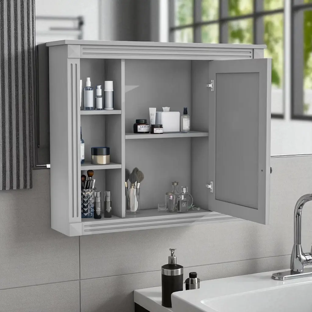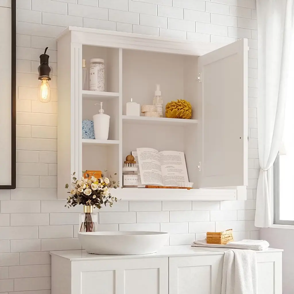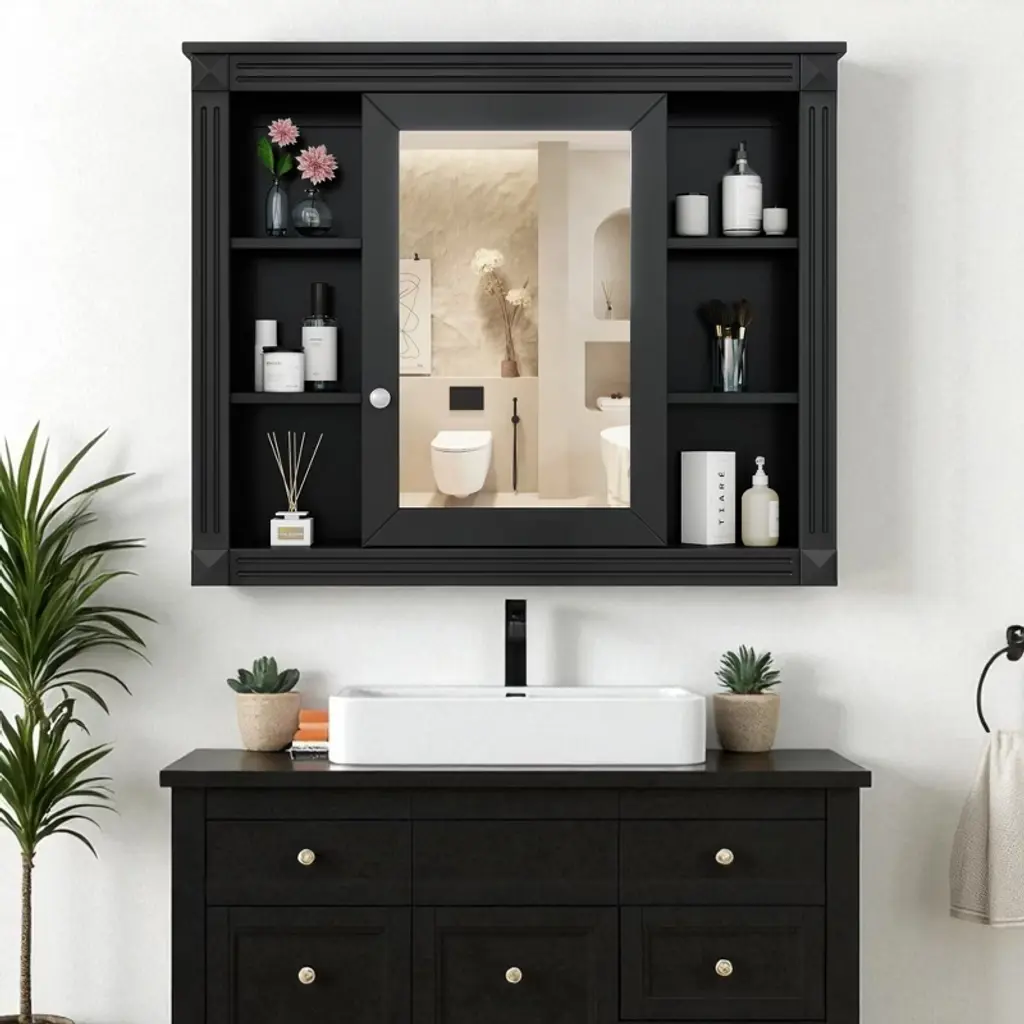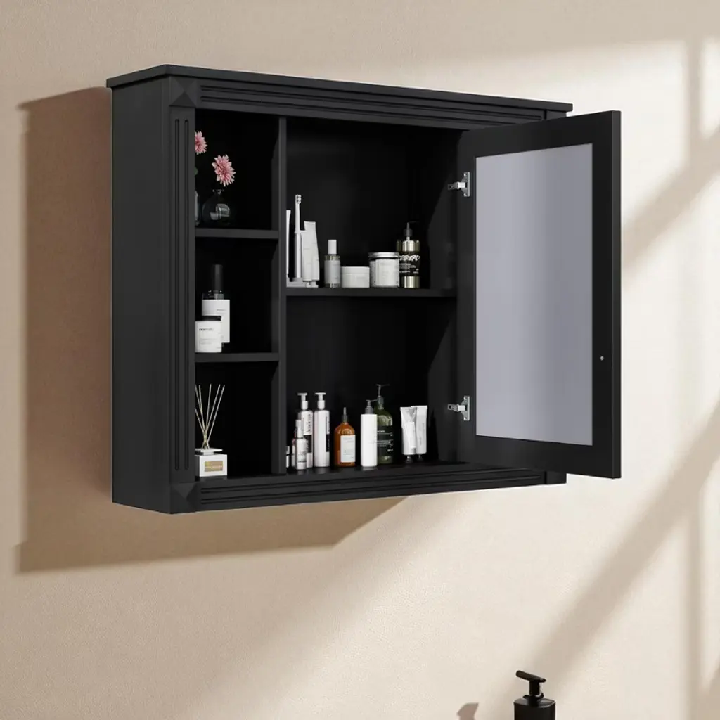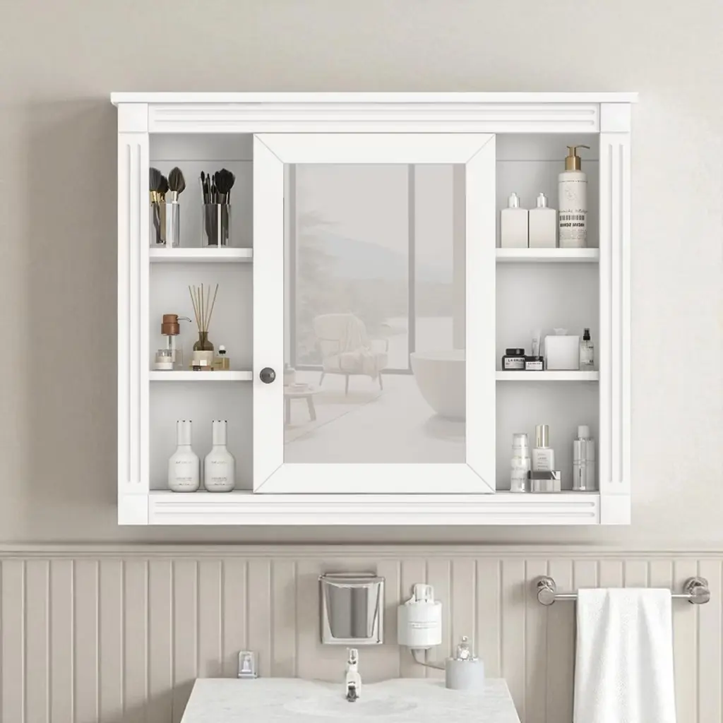 Product Overview This 35-inch wall-mounted bathroom storage cabinet combines a high-definition mirror with smart concealed and open storage. With one mirrored door, six open shelves, and adjustable layers, it maximizes organization while saving floor space. Its modern style blends seamlessly into bathrooms, bedrooms, or dressing areas. Specifications Product Type: Medicine Cabinet Main Material: MDF Mount Type: Wall Mounted Finish Type: Painted Number of Doors: 1 (Mirror Door) Number of Shelves: 6 (Adjustable) Capacity: Per Panel 50 lbs Assembly: Required Product Features ✔ 2-in-1 Mirror & Storage Cabinet – Combines a bathroom mirror with hidden storage, reducing clutter and providing everyday convenience. ✔ Ample Storage Options – Features 1 mirrored door for private storage and 6 open shelves for easy-access items. ✔ Modern & Elegant Design – Painted MDF finish with clean lines and unique pattern detail, designed to elevate bathroom interiors. ✔ Durable & Moisture-Resistant – Made from high-quality MDF with water-resistant coating, suitable for humid bathroom environments. ✔ Adjustable Storage – Flexible shelving allows customization to fit toiletries, towels, or daily essentials. ✔ Easy Assembly – Each part is labeled and pre-drilled for step-by-step installation with included hardware. Product Dimensions Overall: 35.00'' L x 7.10'' W x 28.70'' H Weight: 33.07 lbs Suitable Scenarios Perfect for bathrooms, powder rooms, or over-the-toilet installations. Can also be used in bedrooms or entryways as a mirror cabinet and storage solution. Notes 1. Real product color may slightly vary due to lighting or monitor display. 2. Manual measurement has been used; slight variations may occur. Why Choose This ✔ Combines mirror and storage in one ✔ Hidden + open shelving for flexible use ✔ Durable MDF with moisture-proof finish ✔ Space-saving wall-mounted design ✔ Adjustable shelves to suit your needs