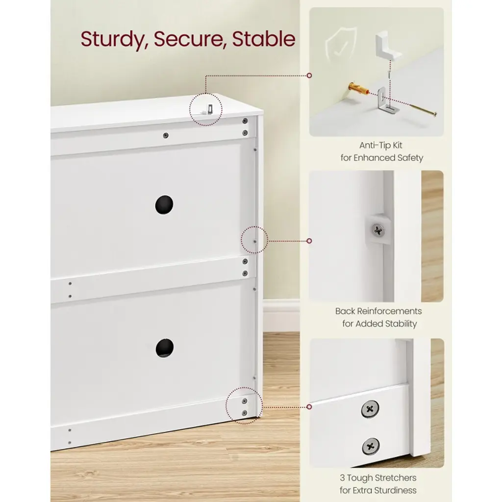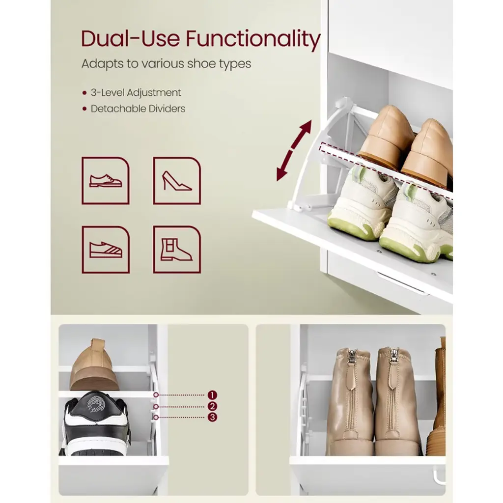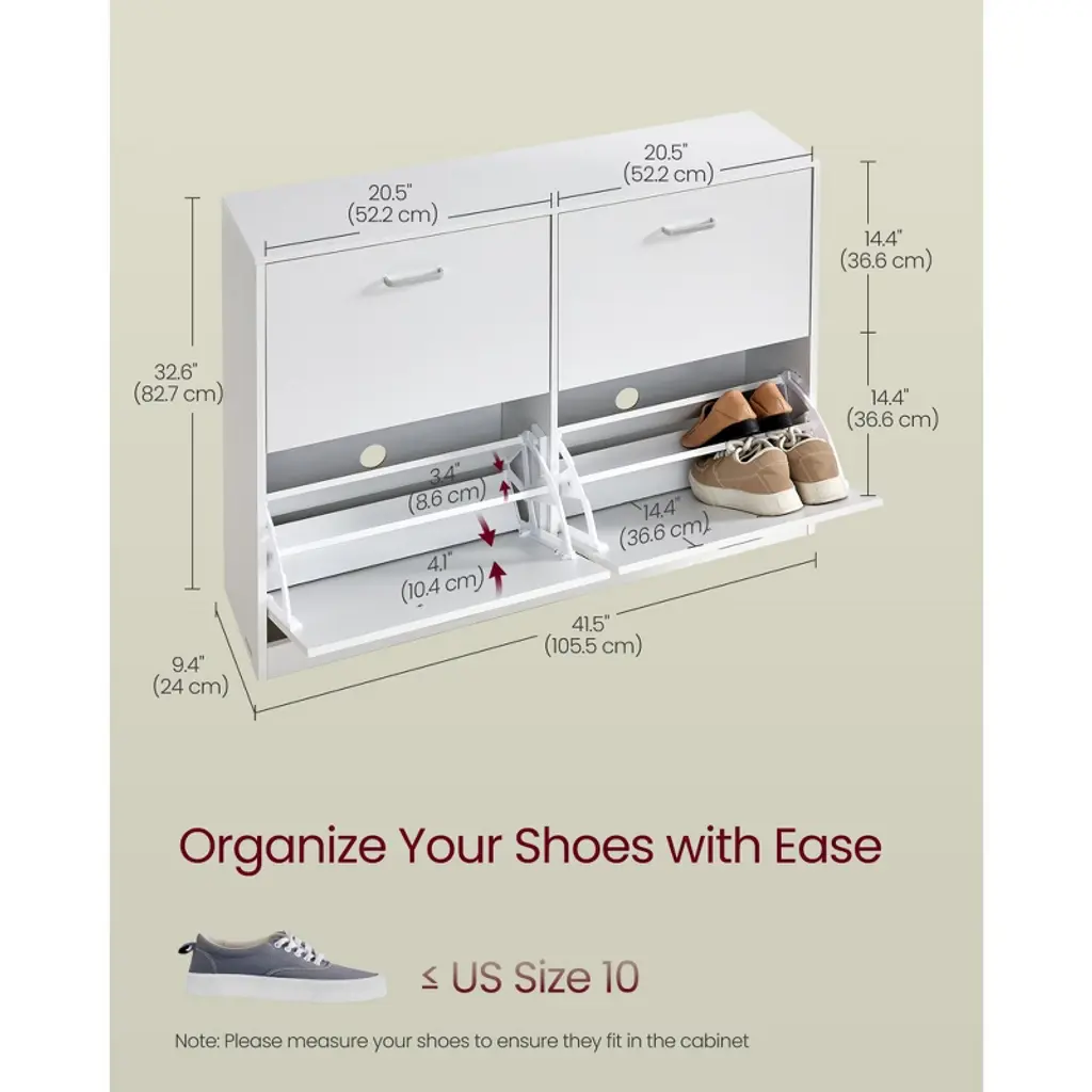 Maximize your entryway organization with this functional 4-door flip shoe cabinet featuring customizable adjustable shelves to accommodate 16-28 pairs of shoes of various sizes. The space-saving 9.4" depth fits perfectly in narrow spaces while the 41.5" width provides ample storage capacity. Durable engineered wood construction with smooth-flipping doors offers easy access while keeping footwear neatly concealed. The modern minimalist design with scratch-resistant surface blends seamlessly with any decor, creating a clutter-free solution for shoes, boots or seasonal items.