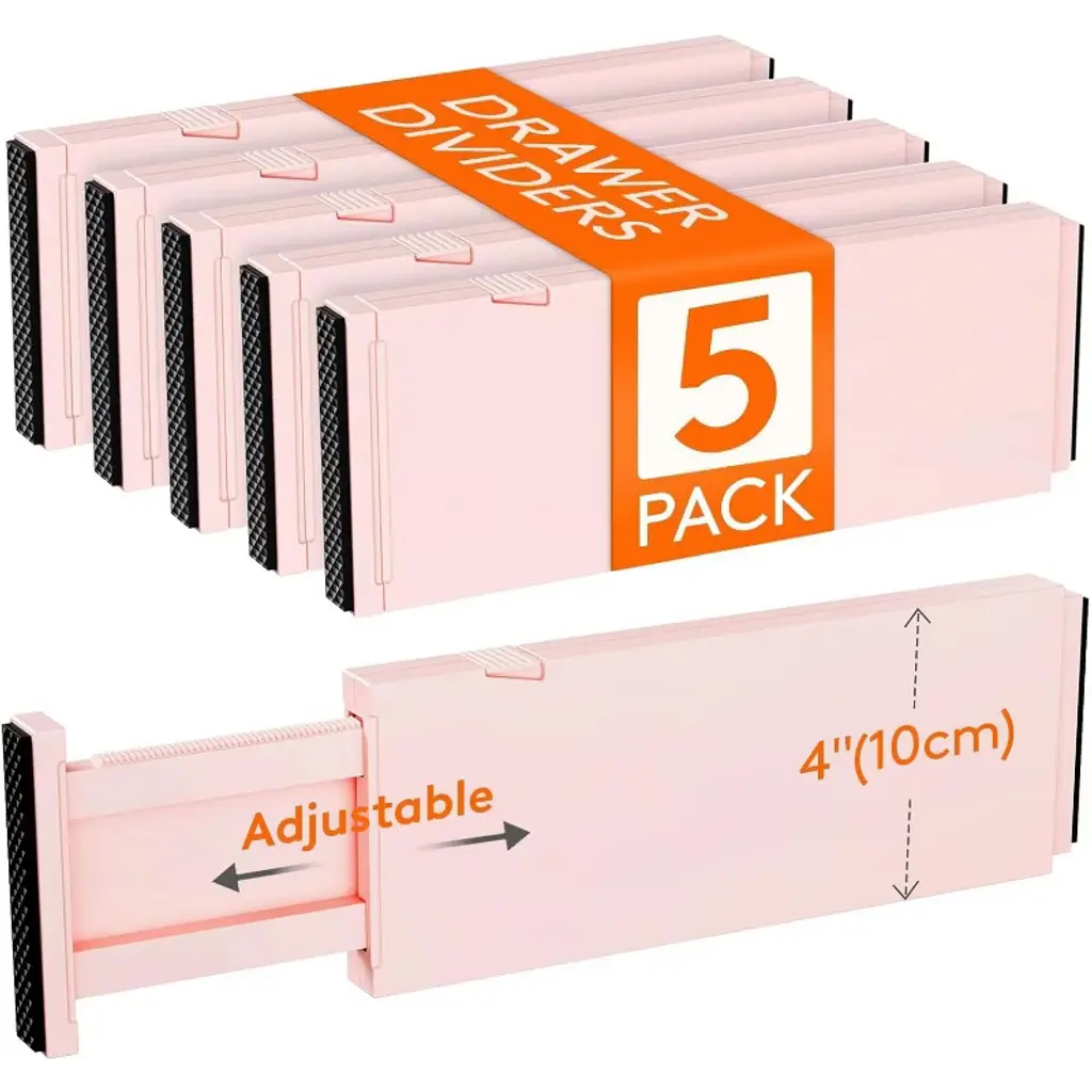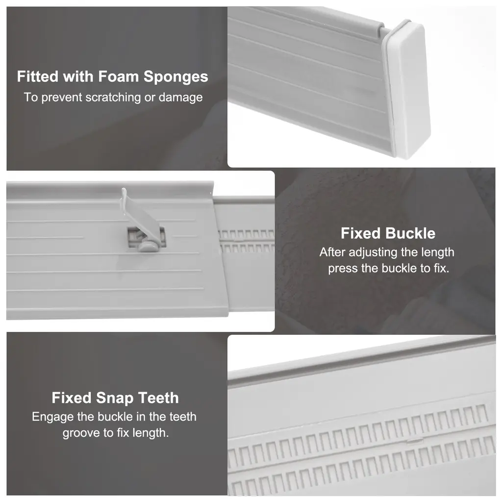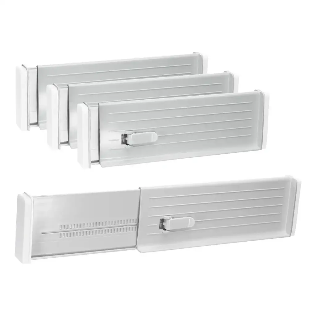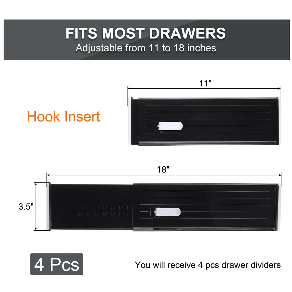 Description:Package & Size: You will receive 4 pcs white drawer dividers, which are adjustable and expandable, can be expanded from 11" to 18" long, and 3.5" high.Durable Material: These adjustable dividers are made from ABS material for durability and comfort. They are also fitted with foam sponges at the ends to prevent scratching or damage to the inside of the drawer.Easy Installation & Removal: Press the top button to adjust the length before placing the dresser dividers, then extend to secure before locking. Strong spring tension keeps each drawer organizer securely upright. To retract, press the top button and push the extended side.Flexible placement: Our versatile drawer dividers can be placed either vertically or horizontally to suit a variety of organizing needs.Multiple Applications: The drawer organizers are designed to bring order to your belongings. Suitable for organizing cluttered items, whether it is organizing clothes, underwear and socks, kitchen utensils, bathroom necessities, operating tools, bookshelf organization, etc.