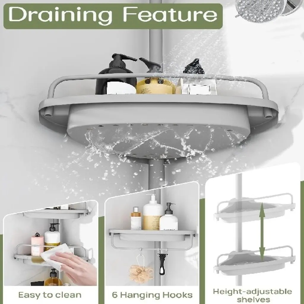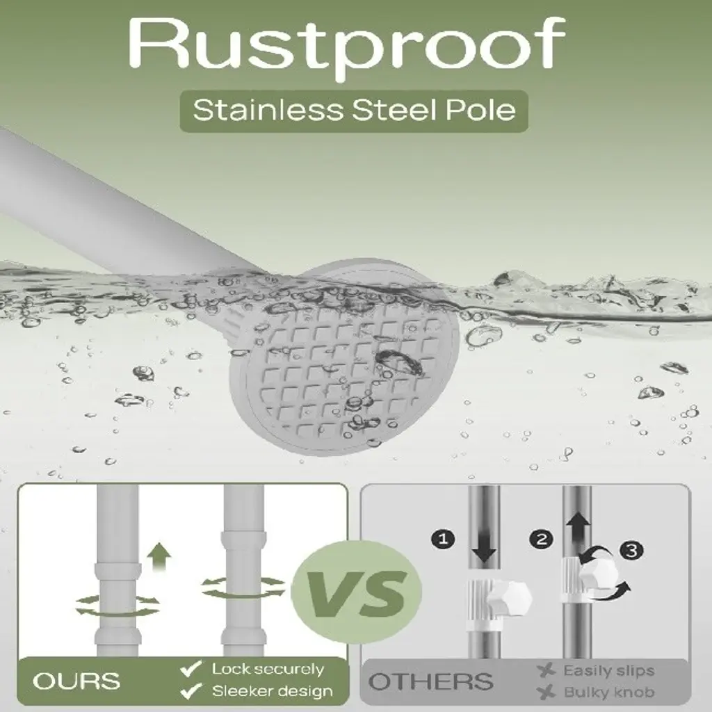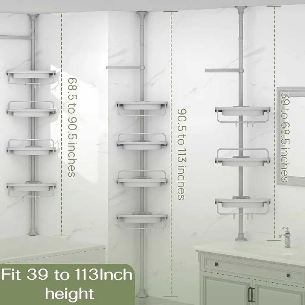 Rustproof 304 Stainless Steel - Features premium SUS 304 stainless steel rods and 4 plastic shelves for long-lasting rust resistance (3+ years durability in wet environments). High-Capacity 4-Tier Storage - Each shelf holds 2x32oz or 4x16oz bottles with self-draining design to prevent water buildup (ideal for shampoos/soaps). Universal Adjustable Height - Telescoping pole (39"-113") fits most showers (except sloped ceilings) without cutting for customized placement. Sturdy & Easy-Clean Design - Thicker/deeper plastic shelves prevent spills vs flimsy competitors, with simple wipe-clean maintenance. 20-Min Assembly + 1YR Guarantee - Includes labeled parts/bags for scratch-free setup, backed by 1-year satisfaction warranty.