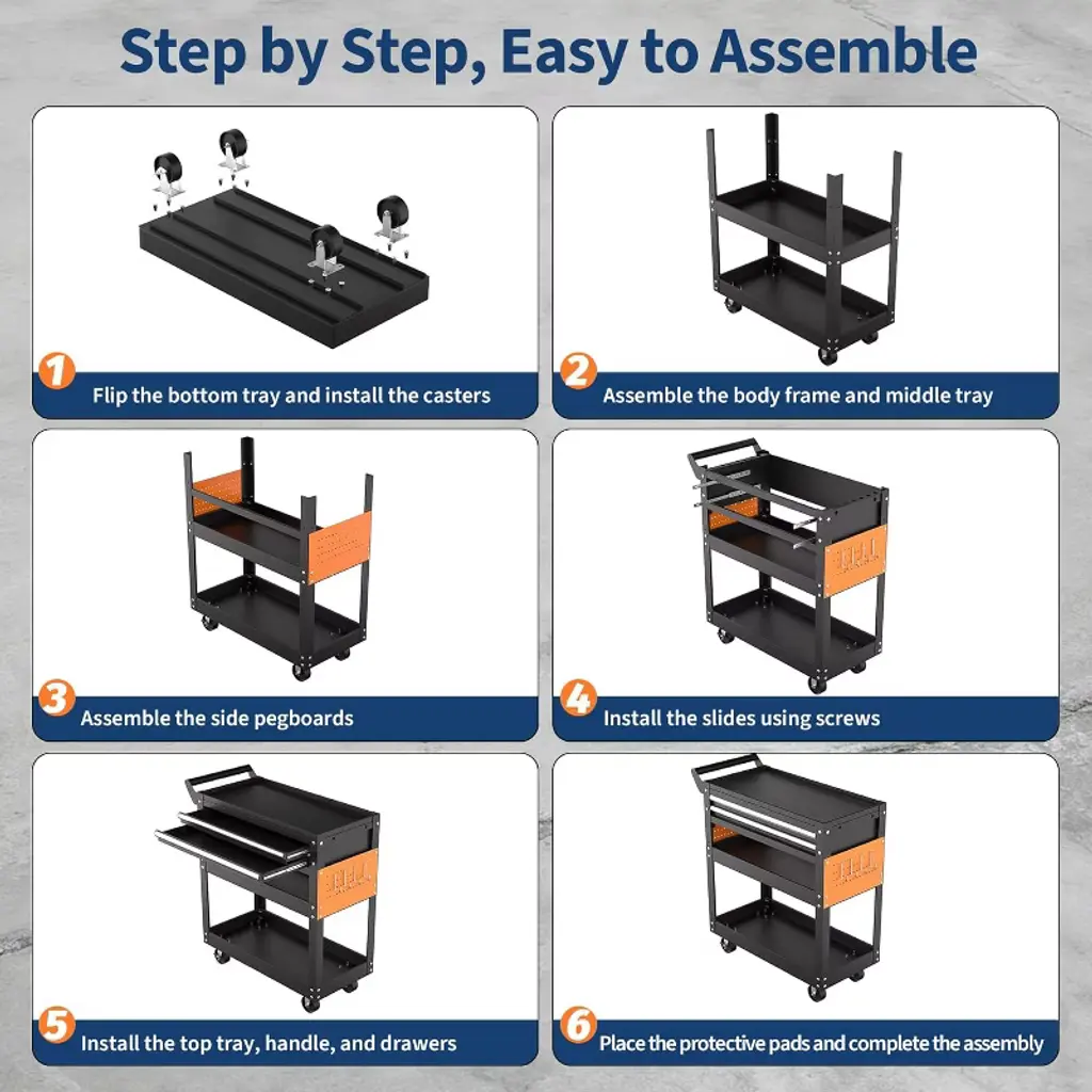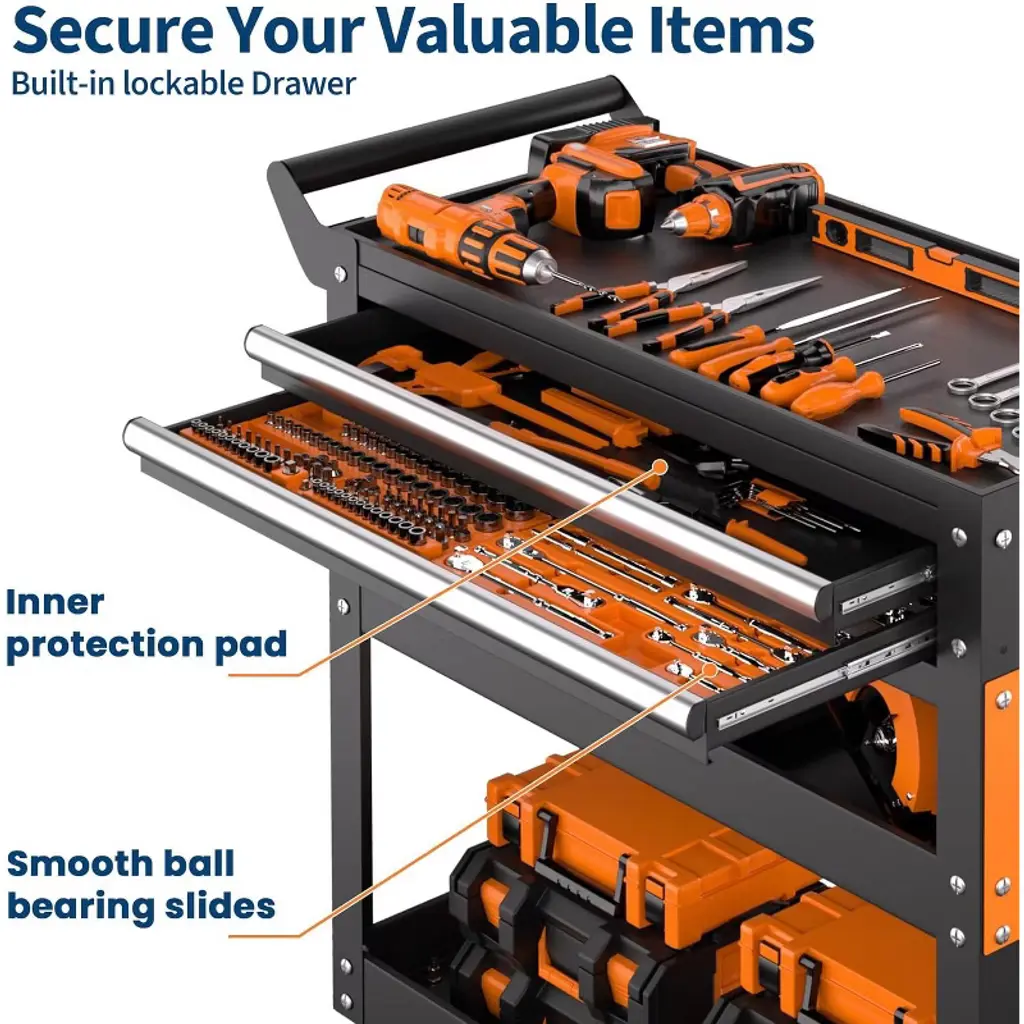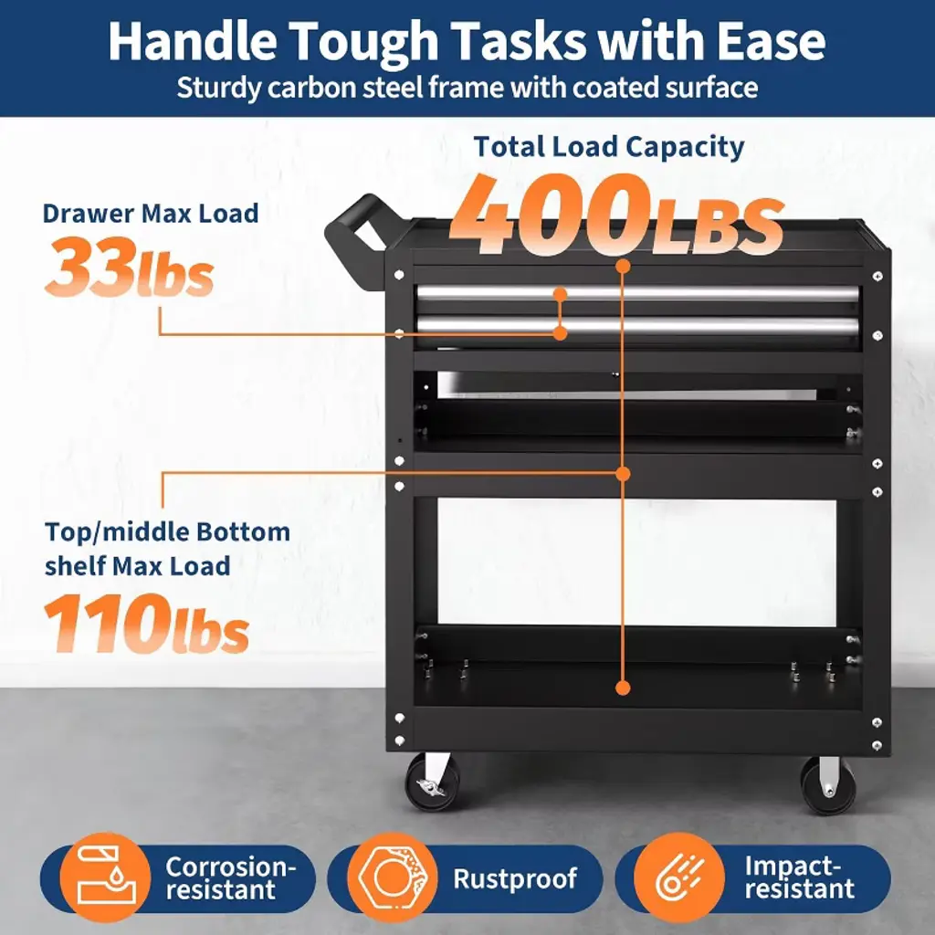 Keep your workspace tidy and tools easily accessible. The 4 tier tool cart with drawers features three generous shelves for everything from power tools to hardware, making it the perfect work cart for busy garages and repair shops