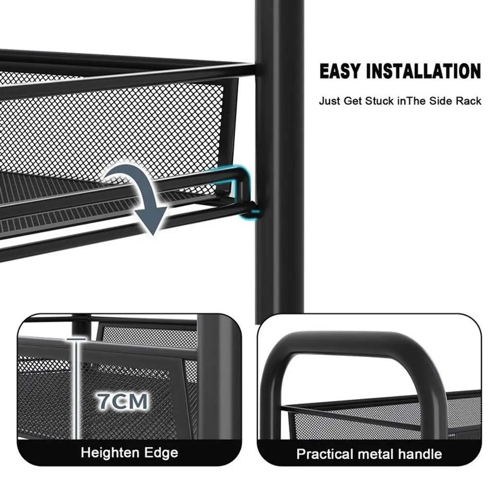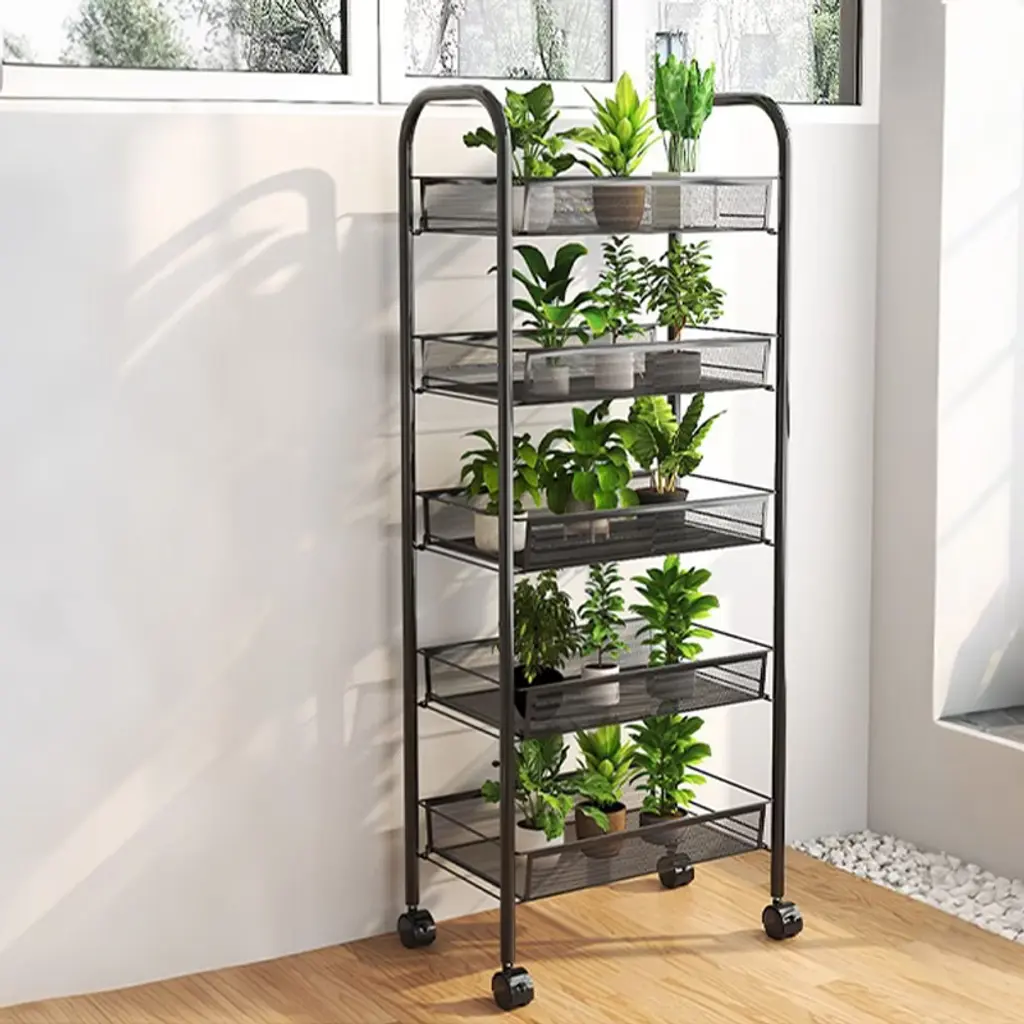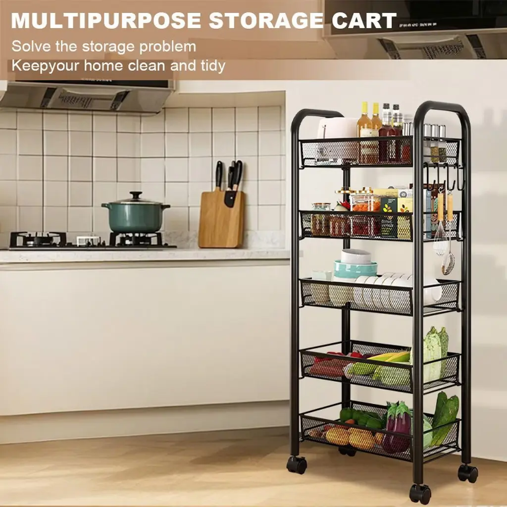 This 5-tier metal rolling utility cart is the perfect solution for anyone seeking practical and flexible storage in busy homes or workspaces. Built with a robust carbon steel frame, each shelf supports up to 18 pounds, offering dependable space for pantry goods, office supplies, craft materials, or garage tools. The open mesh design keeps items visible and well-ventilated, making it easy to find what you need at a glance while preventing dust buildup and keeping everything fresh. Designed for smooth movement, the four swivel wheels glide effortlessly across floors, and the handle makes maneuvering simple, even in tight spaces. When stability is needed, the locking wheels provide a secure hold so you can safely park the cart wherever it’s most convenient. Assembly is quick and tool-free, making this cart an easy addition to your kitchen, office, laundry, or workshop. Its modern, clean finish blends seamlessly with any decor while saving time on cleaning and maintenance. Enjoy a clutter-free, organized life with storage you can move and adapt to wherever you need it most.
